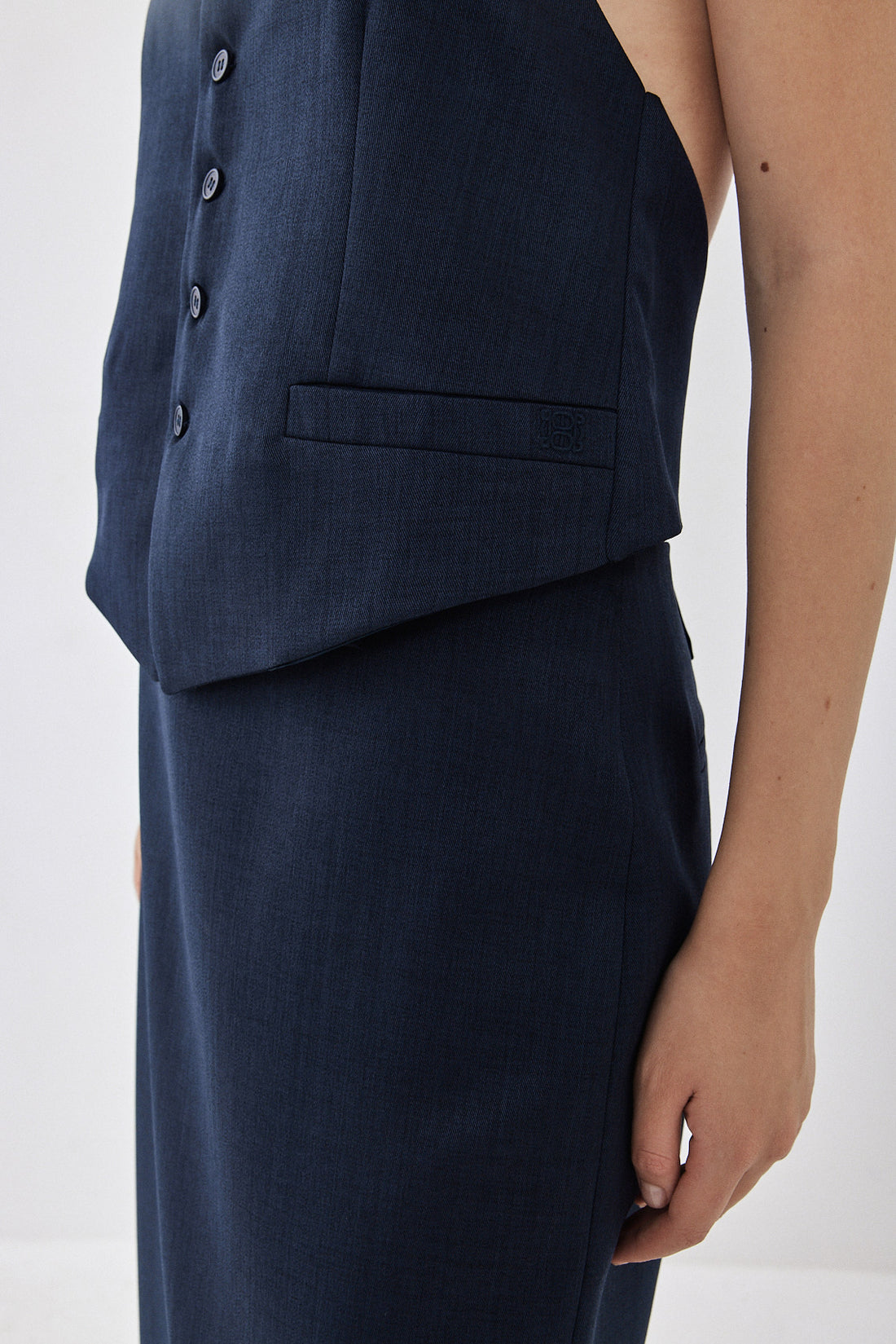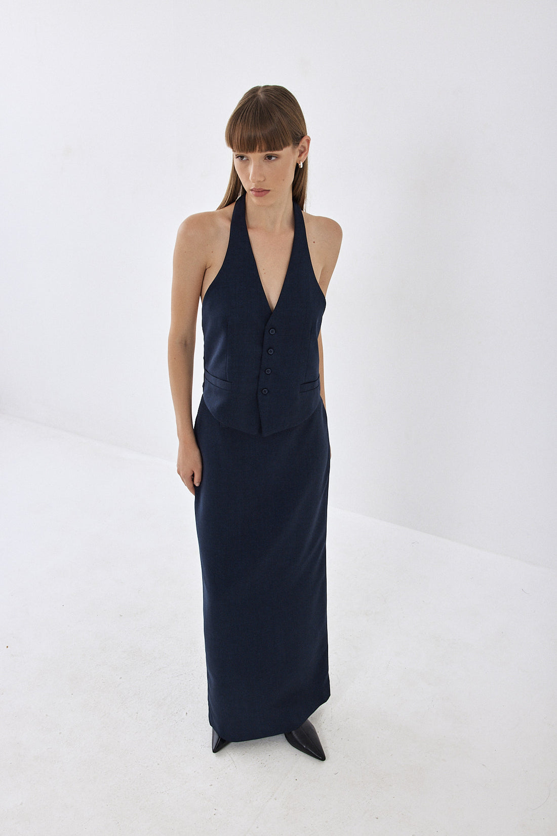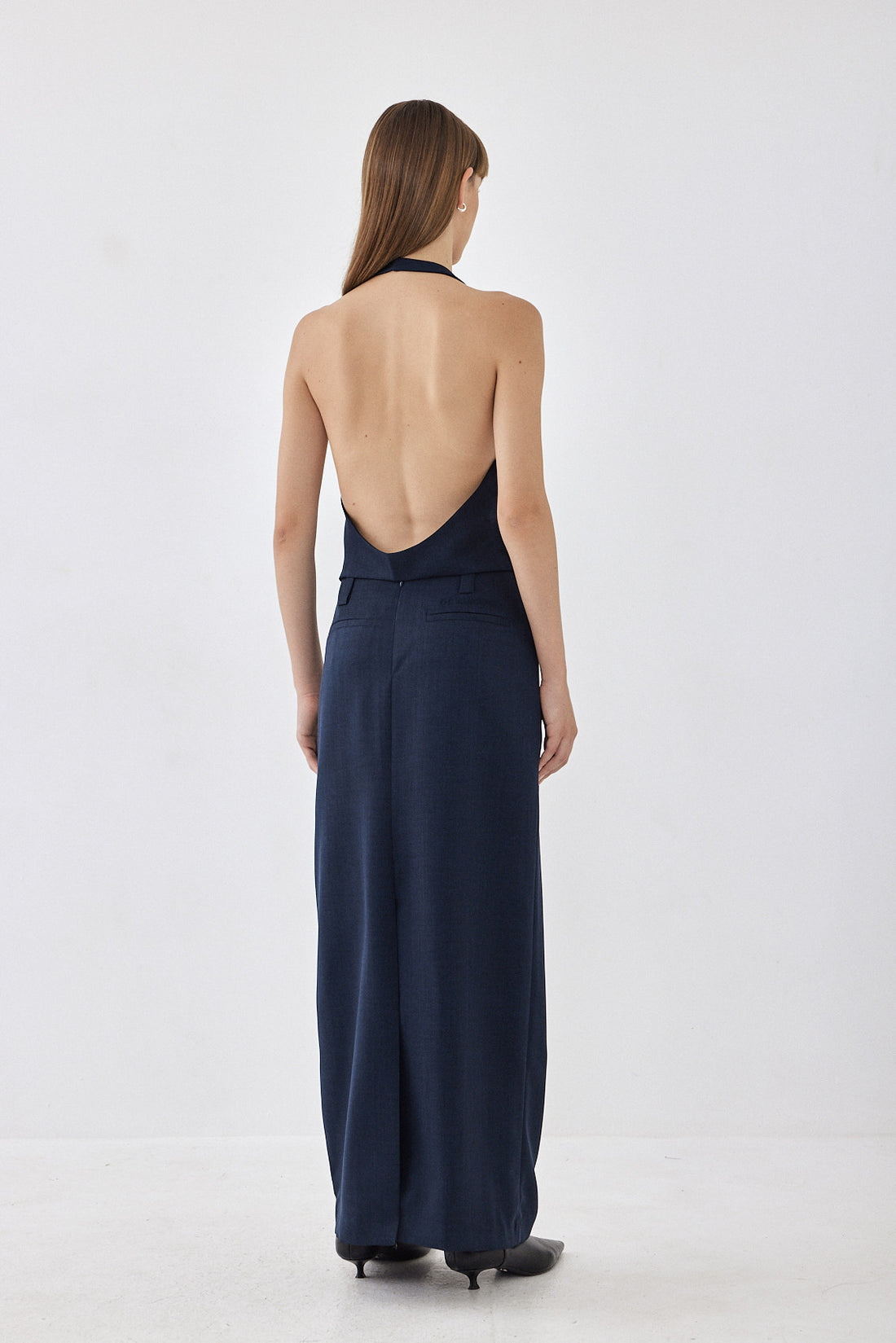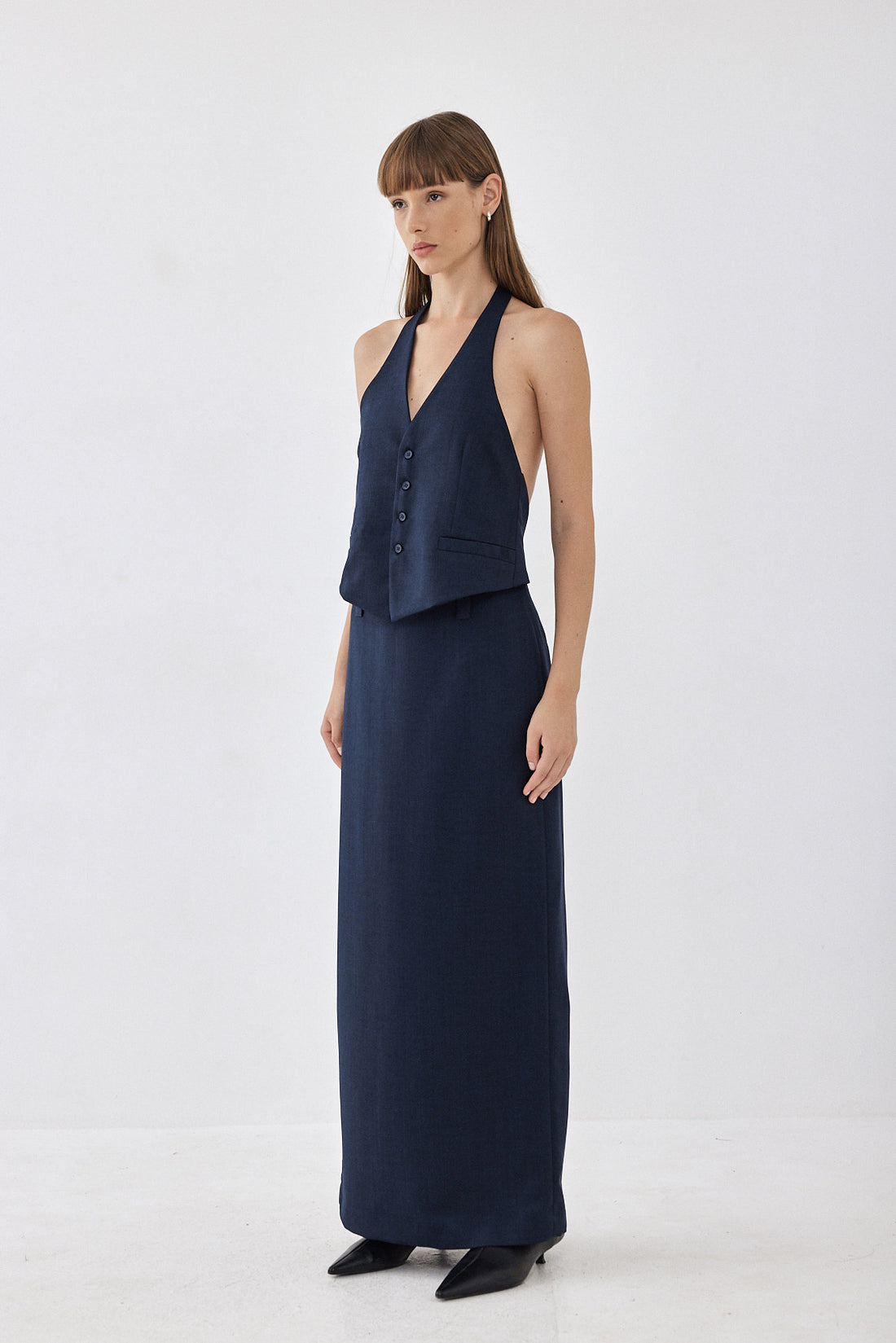 Halterneck style vest with an open back. Front button closure. Front welt pockets. Logo embroidery ton sur ton detail on one of the welt pockets. Style it with your favorite matching color daddy bottom for an effortlessly chic look perfect for day to night.