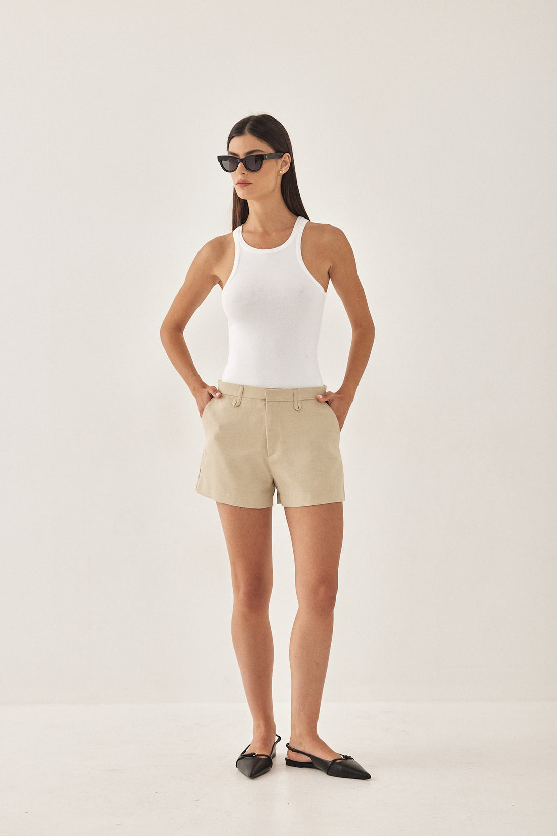Mid waisted shorts from our signature tailored daddy collection. A must have for your summer wardrobe. Featuring two side pockets and belt loops. Front hidden zip and metal hook closure. Style it with a basic tee a kitten heel for a day to night look.