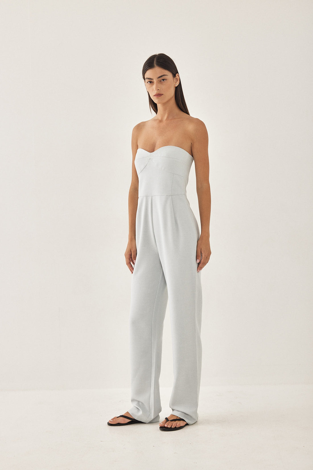 A strapless tailored jumpsuit with a corset fit top. Straight fit full length leg. Featuring a strapless neckline with a silicone strap for a better grip and a hidden zip closure. Featuring wiring at the sides for additional support. Embroidered logo at the back. Style it with a pair of earrings, a shoulder bag and a pair of sandals for the perfect going out look.