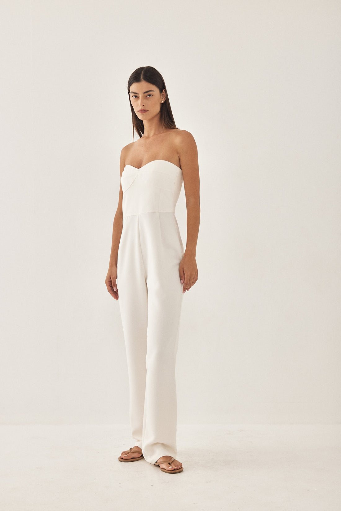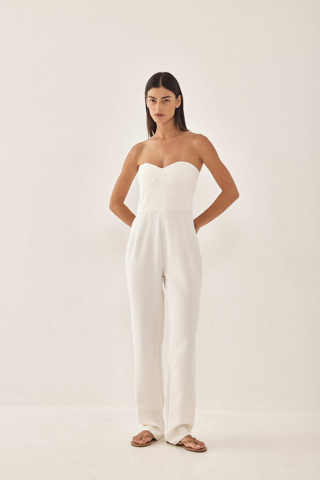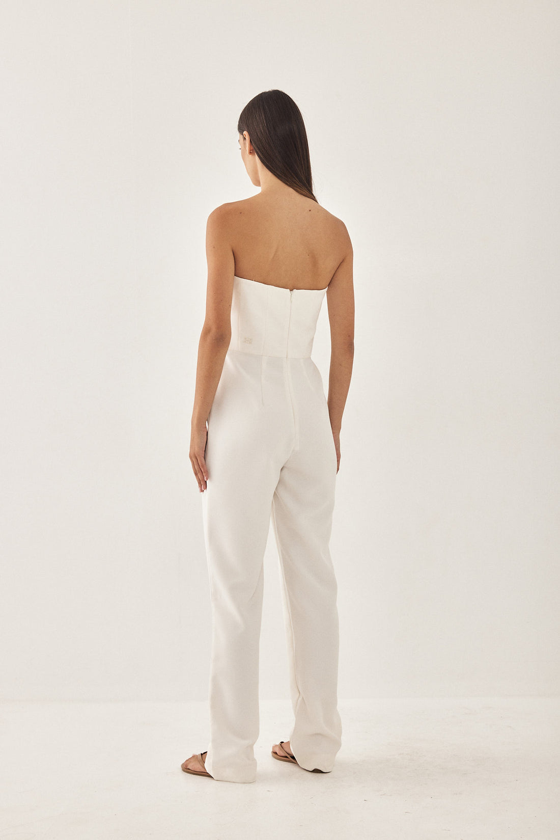 A strapless tailored jumpsuit with a corset fit top. Straight fit full length leg. Featuring a strapless neckline with a silicone strap for a better grip and a hidden zip closure. Featuring wiring at the sides for additional support. Embroidered logo at the back. Style it with a pair of earrings, a shoulder bag and a pair of sandals for the perfect going out look.