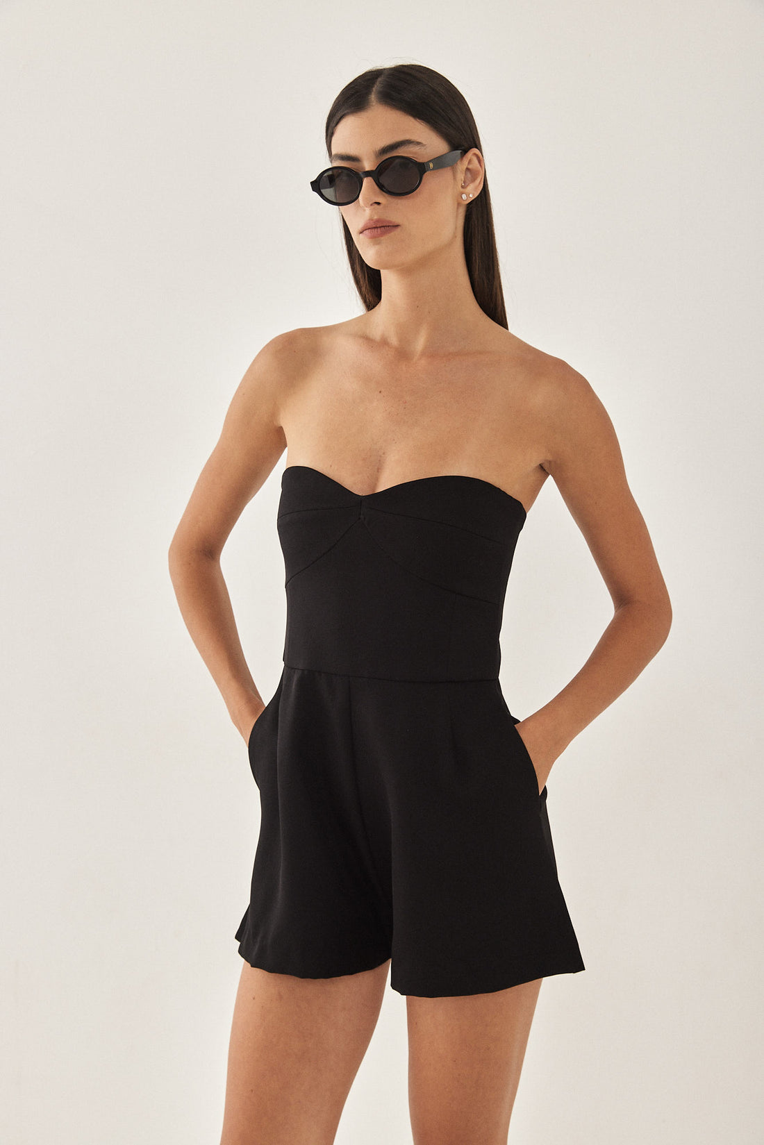 A strapless tailored jumpsuit with a corset fit top. Featuring a strapless neckline with a silicone strap for a better grip and a hidden zip closure. Featuring wiring at the sides for additional support. Embroidered logo at the back. A must have in your closet, perfect for styling up or down. Style it with a pair of kitten heels and a shoulder back for the perfect day to night look.