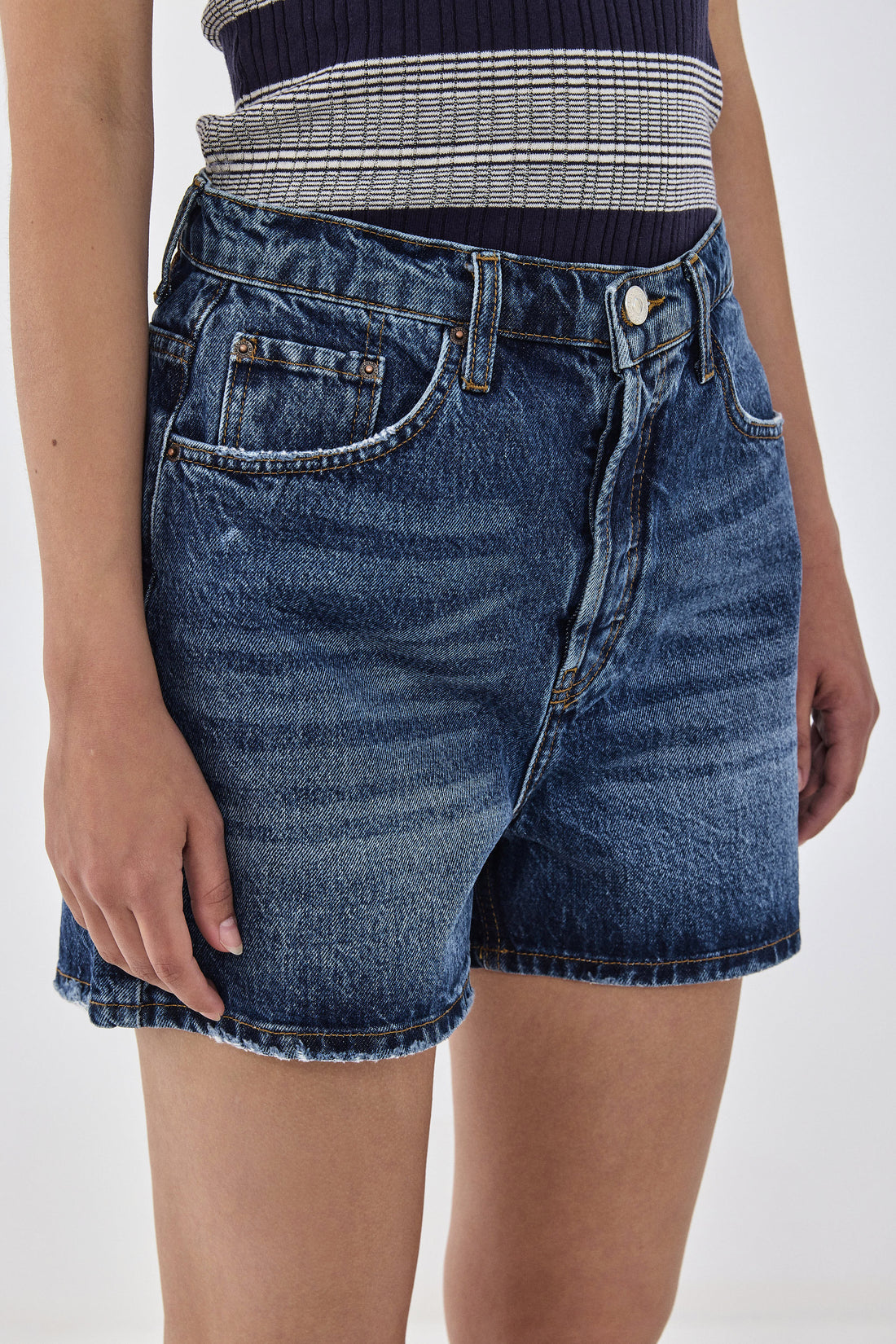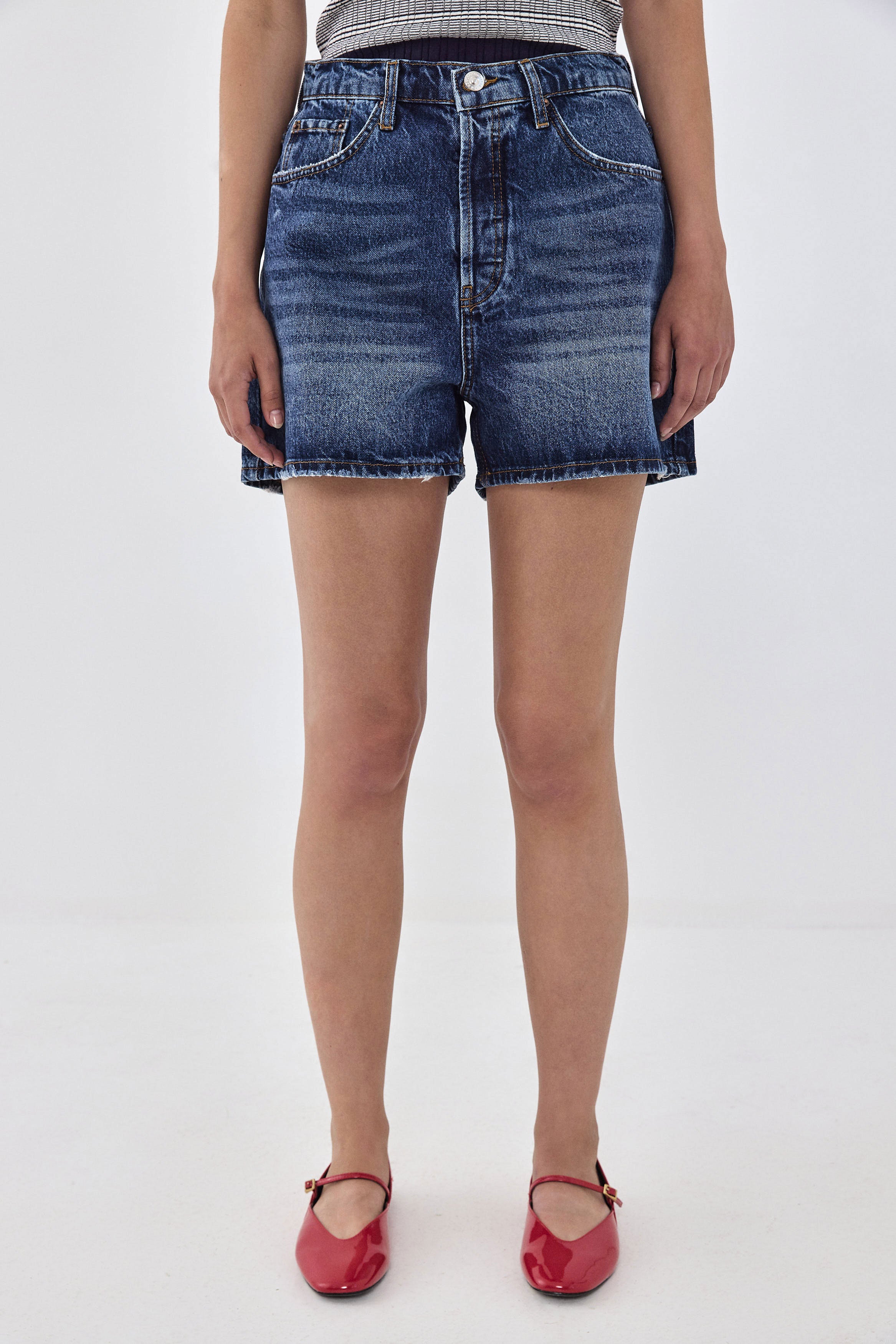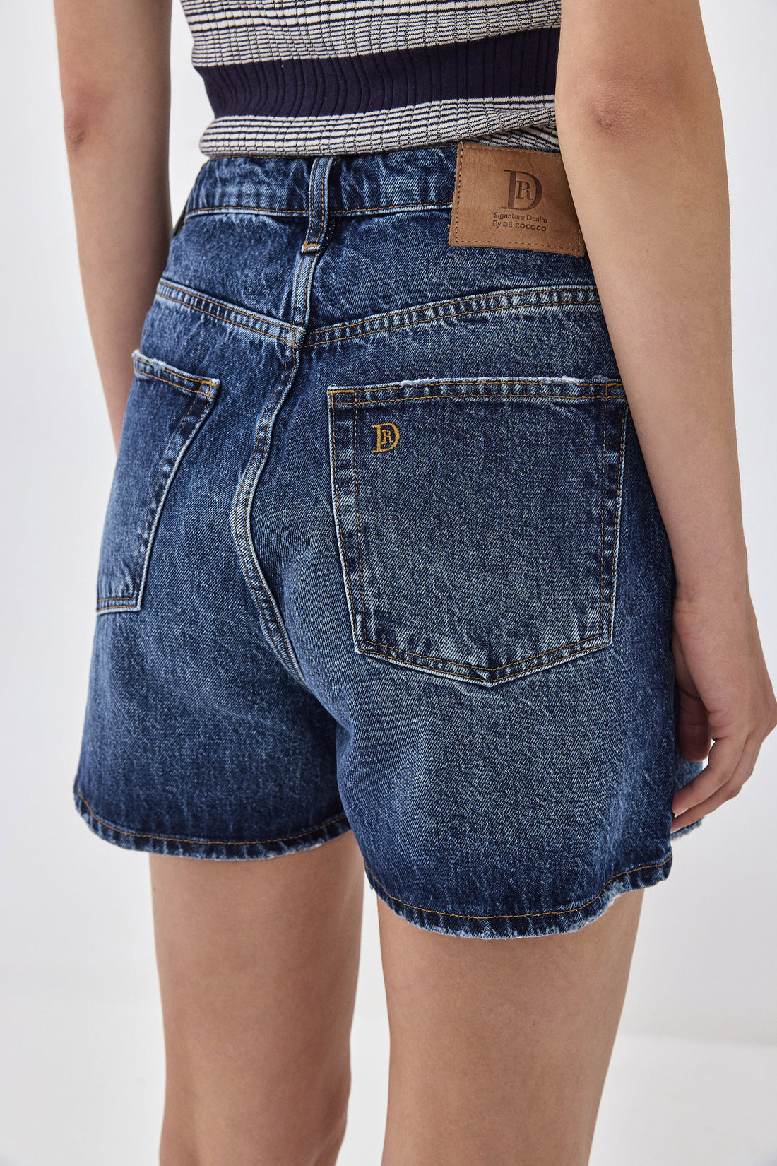 Our denim shorts feature a high waisted baggy fit. Front button closure. Features a logo detail embroidered at the back pocket. The perfect versatile pair of denim shorts, can be styled up or down. Style it with a basic t shirt, your favorite shoulder bag and a pair of slides for an effortlessly chic everyday look.