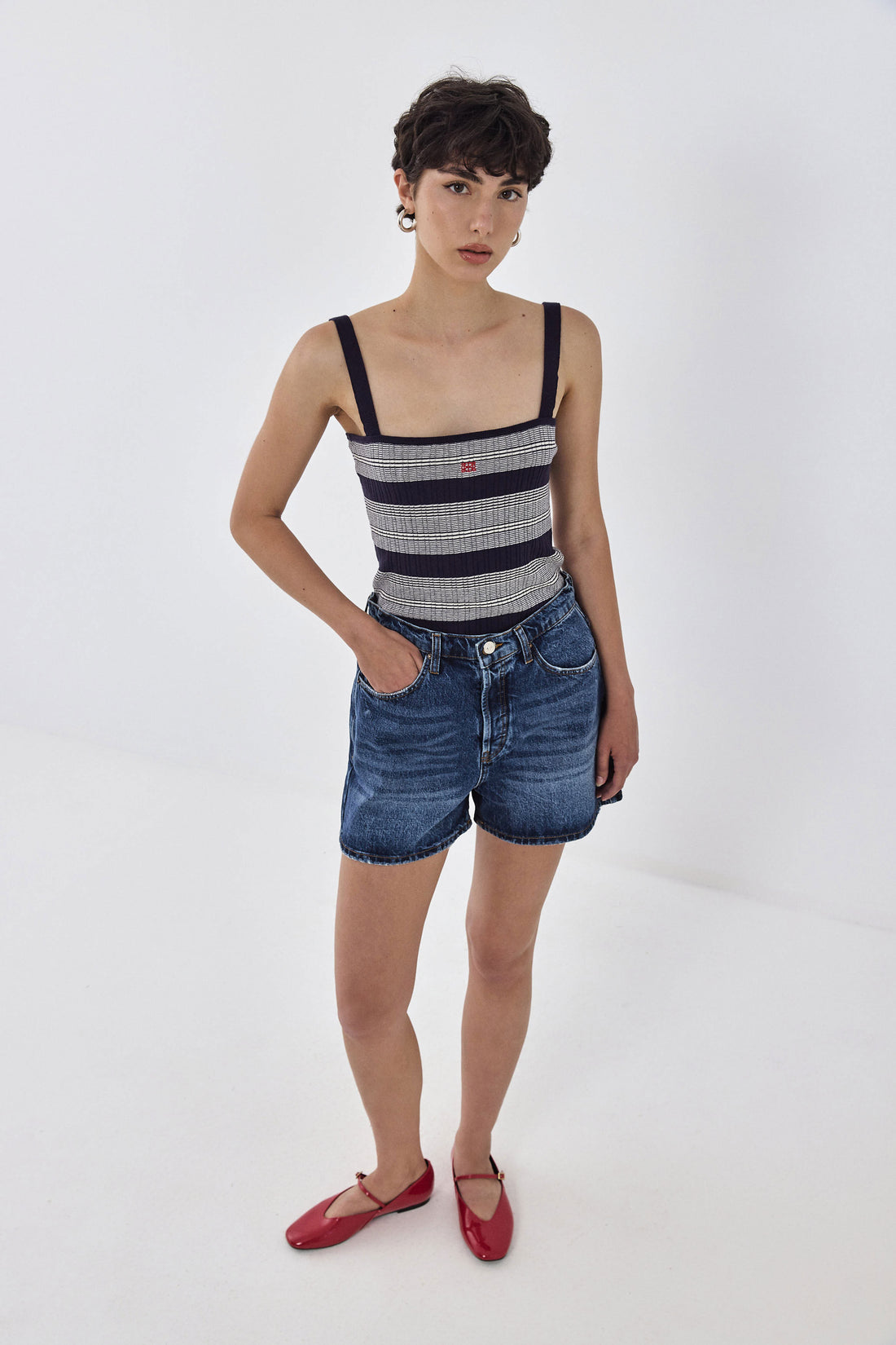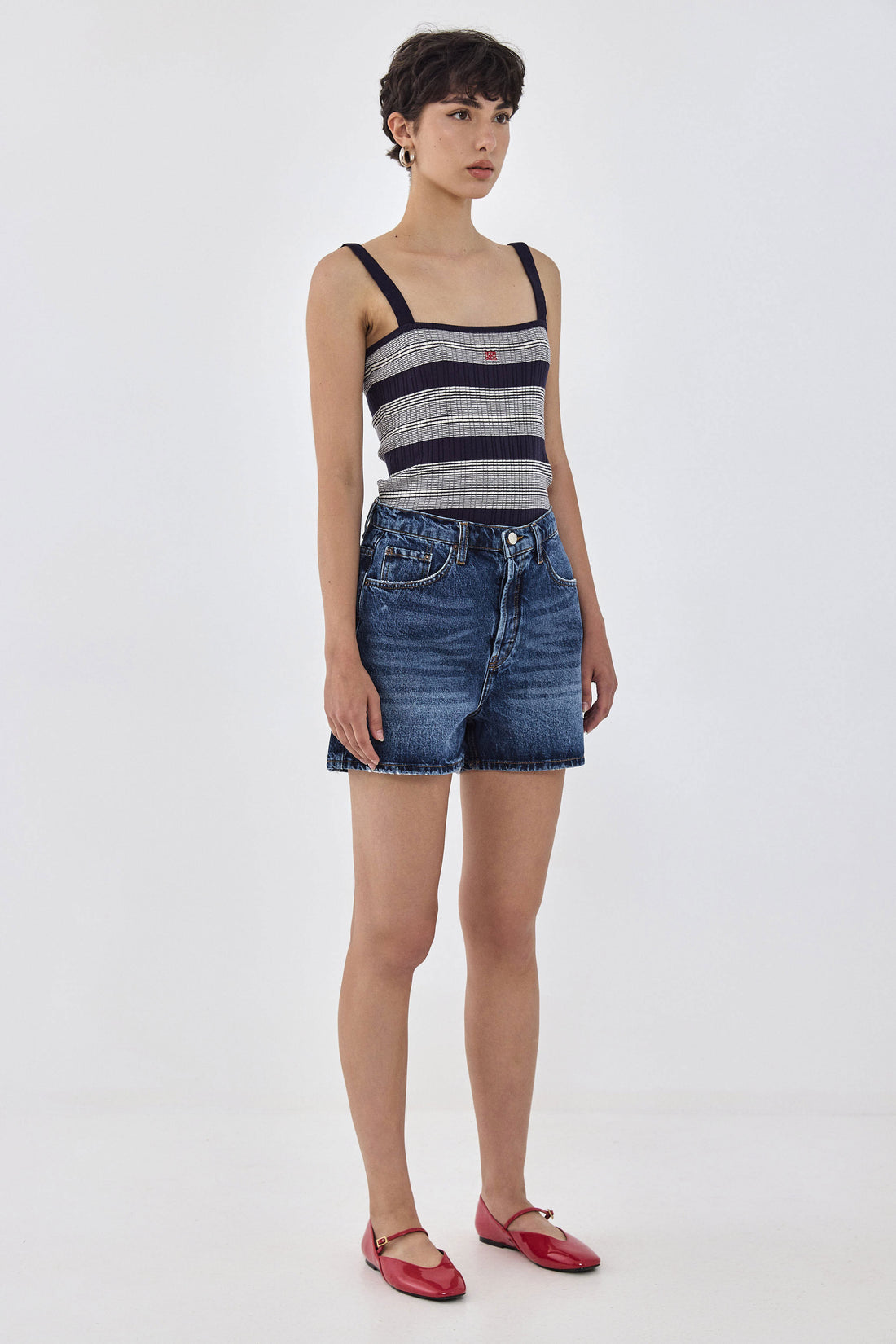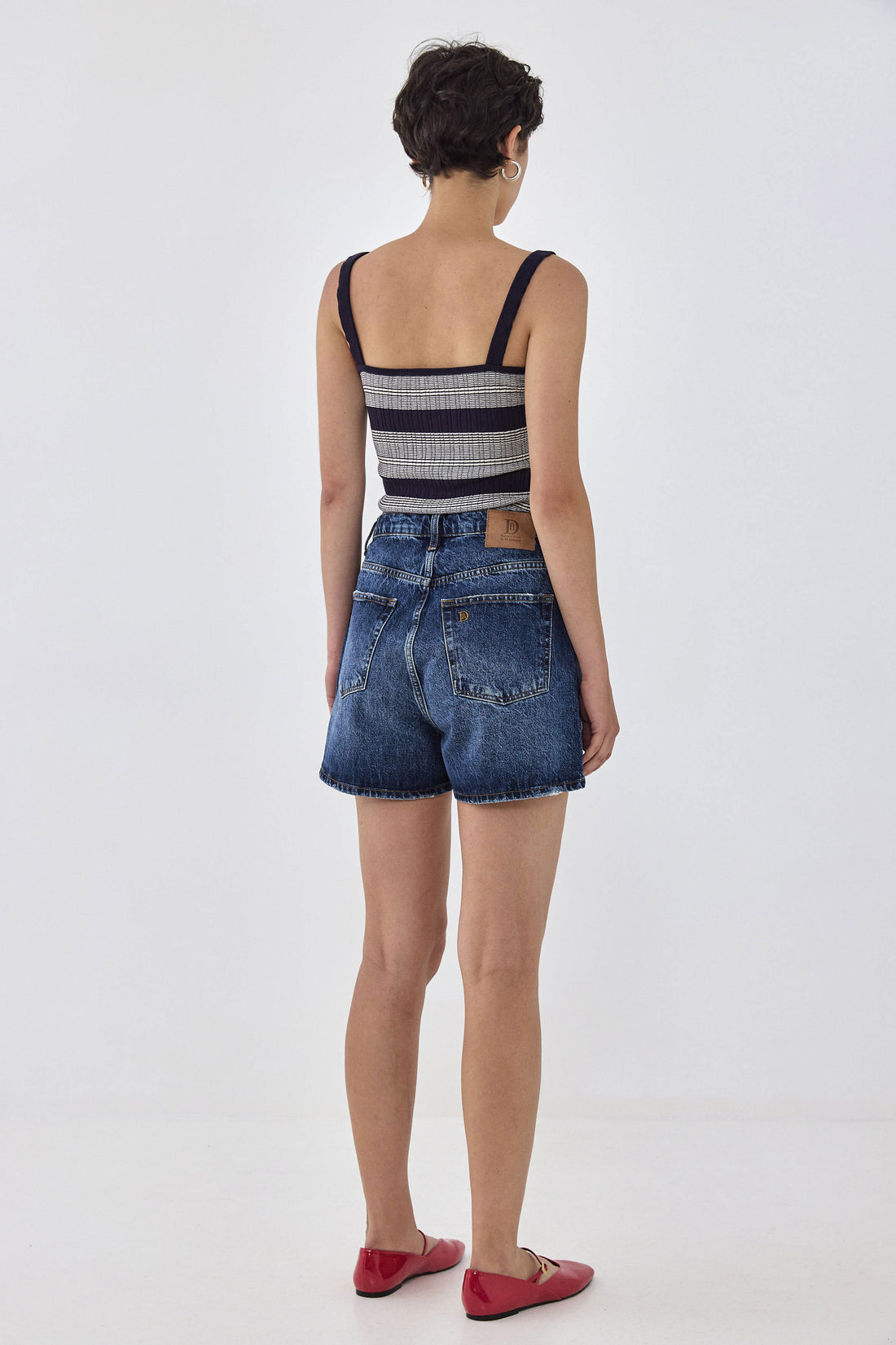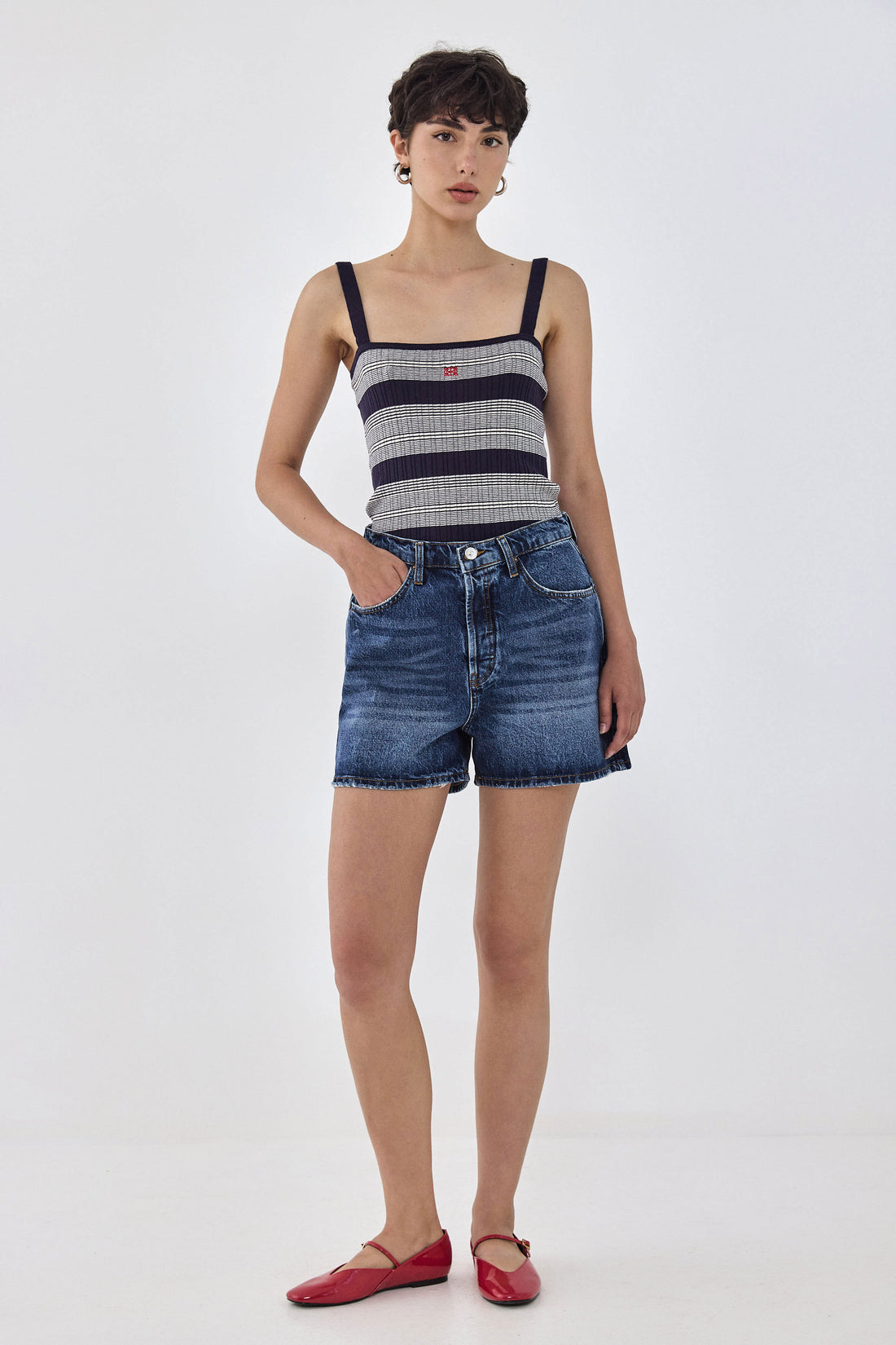Our denim shorts feature a high waisted baggy fit. Front button closure. Features a logo detail embroidered at the back pocket. The perfect versatile pair of denim shorts, can be styled up or down. Style it with a basic t shirt, your favorite shoulder bag and a pair of slides for an effortlessly chic everyday look.