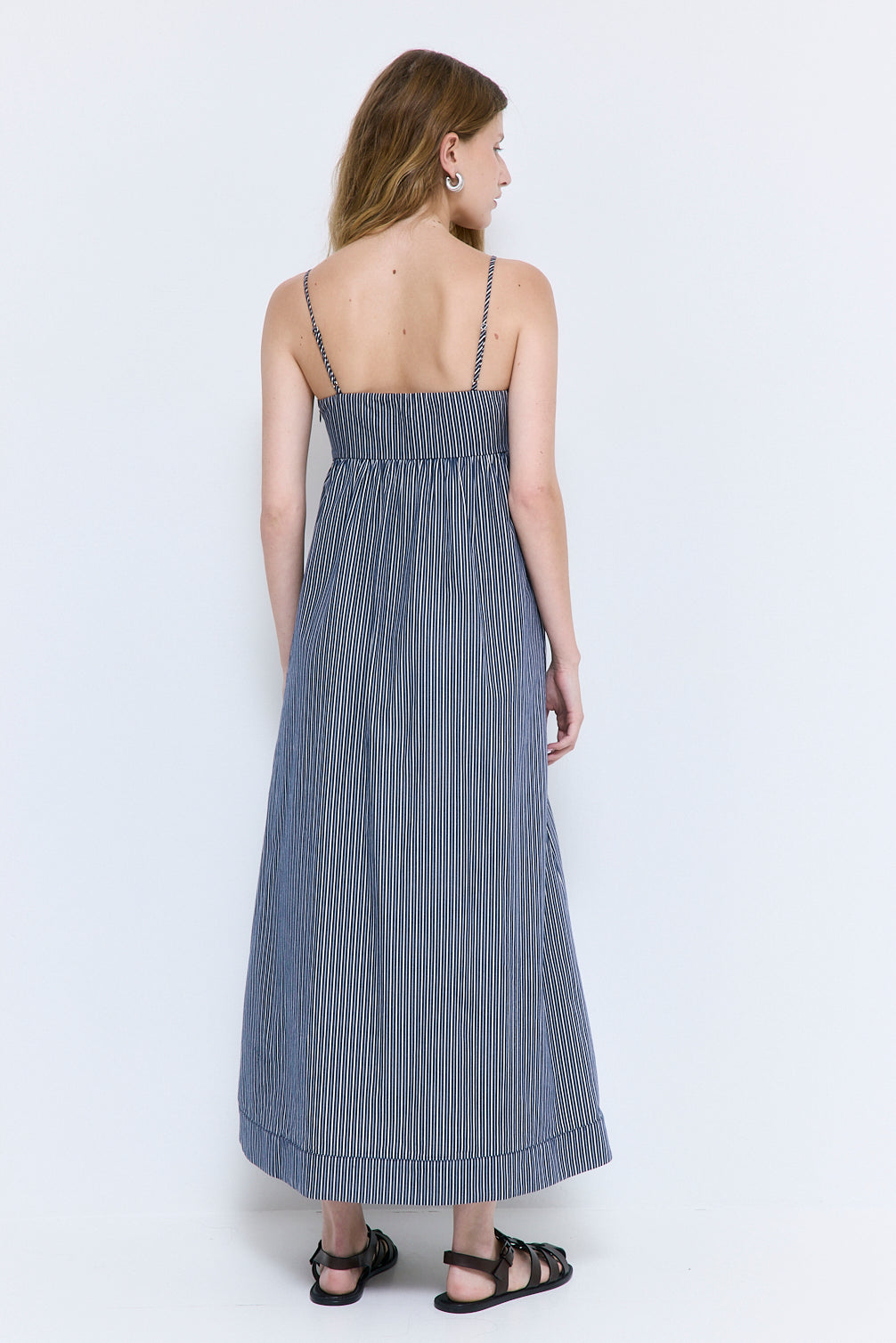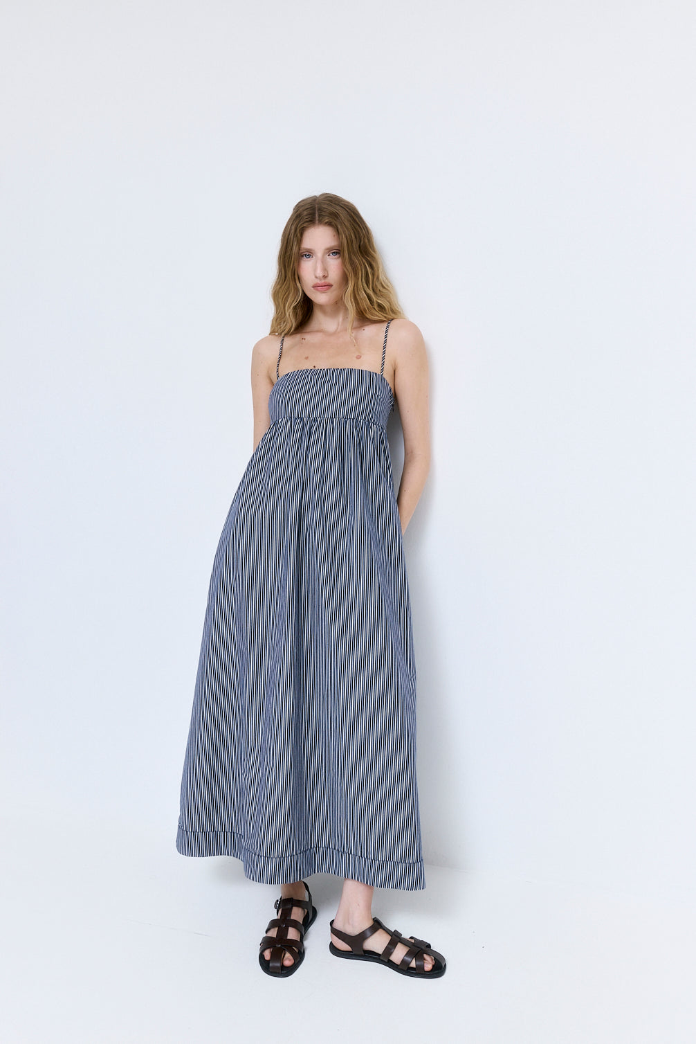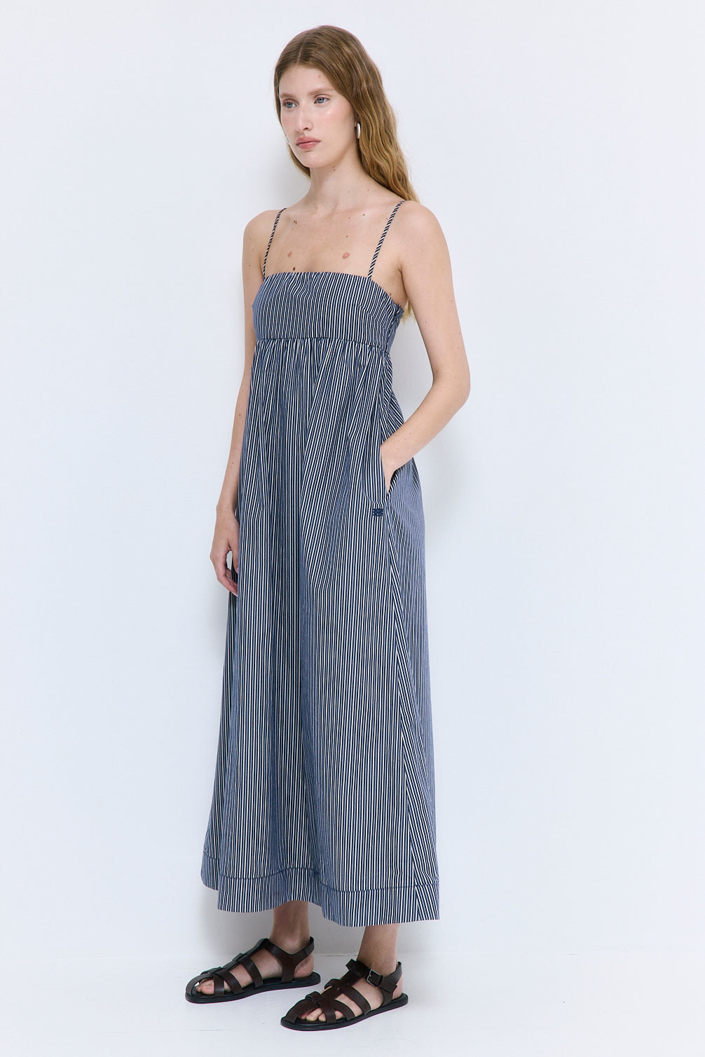 Our new Strappy Poplin Maxi Dress is timeless for any occasion. Luscious striped poplin fabric that moves with you. Maxi length. Square neckline with thin adjustable straps. Wide clean finish. Delicate tonal zipper closure. Two side pockets. Tonal embroidered logo on the side. Featuring gathered detailing at the bust and a flowy A line skirt. Style it with our luxurious Rodika tote bag and our beautiful scrunchie for the perfect summer day.