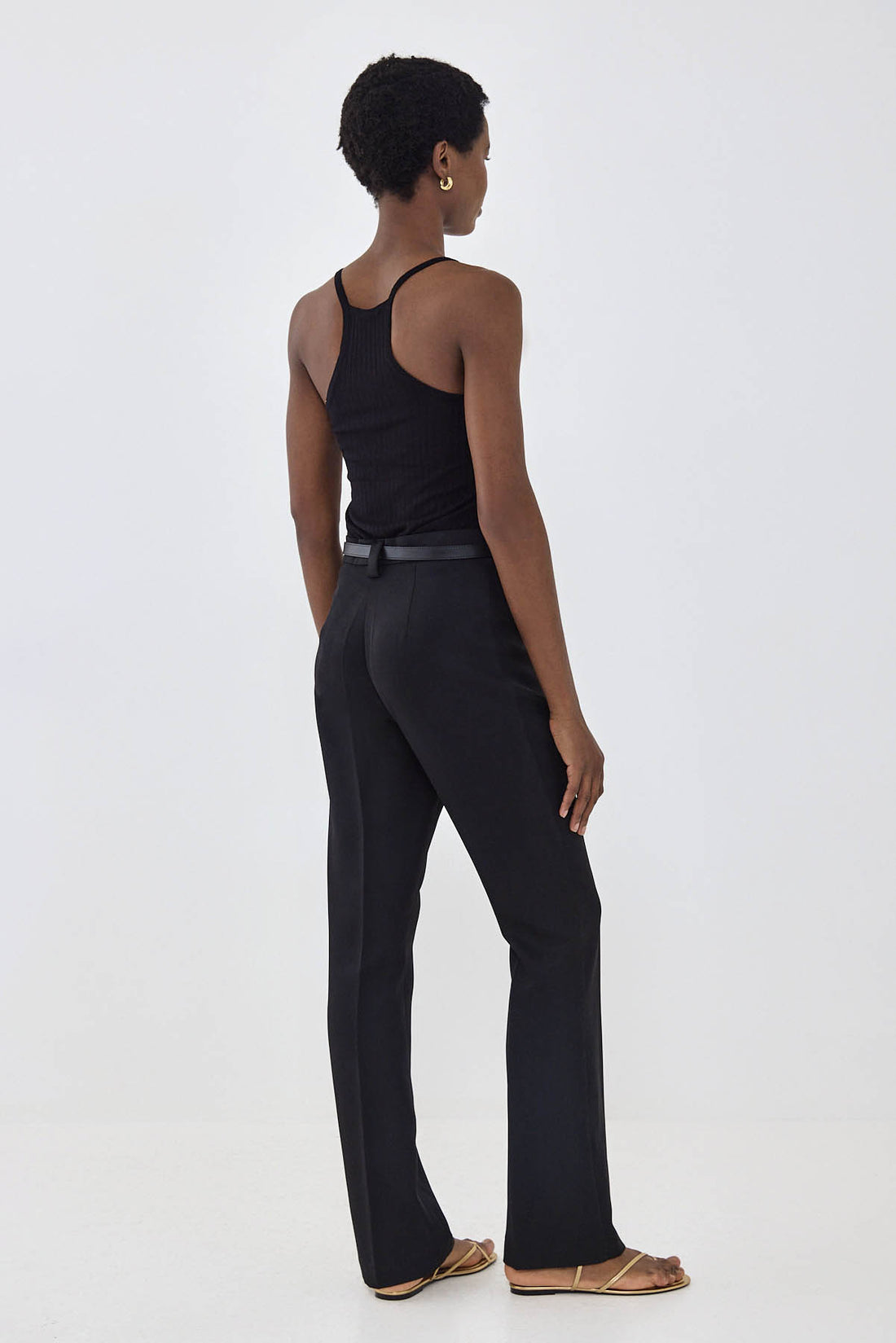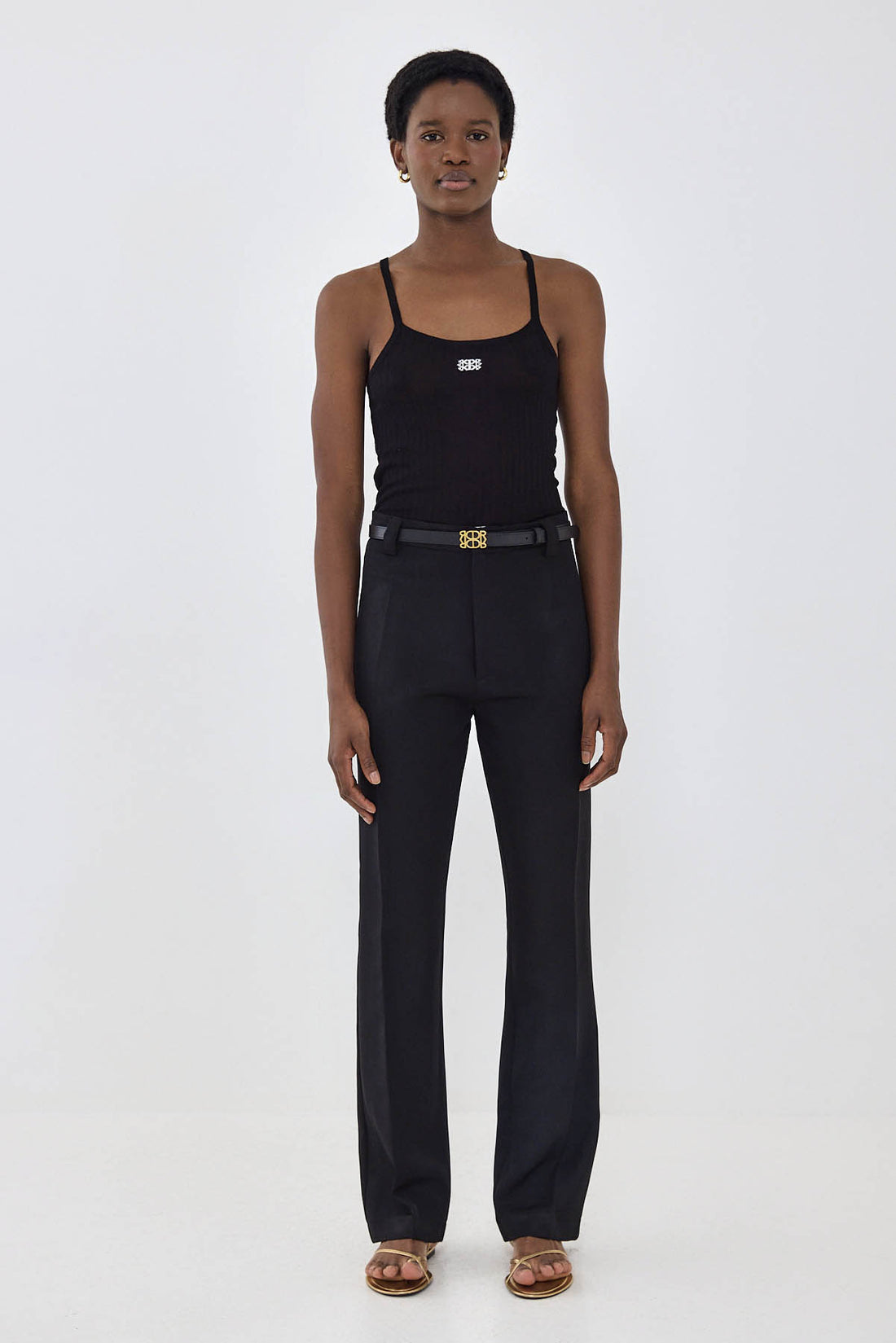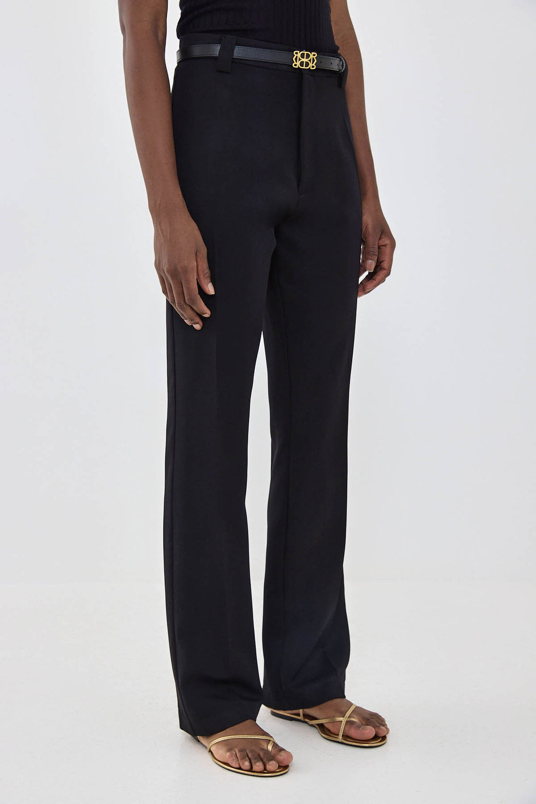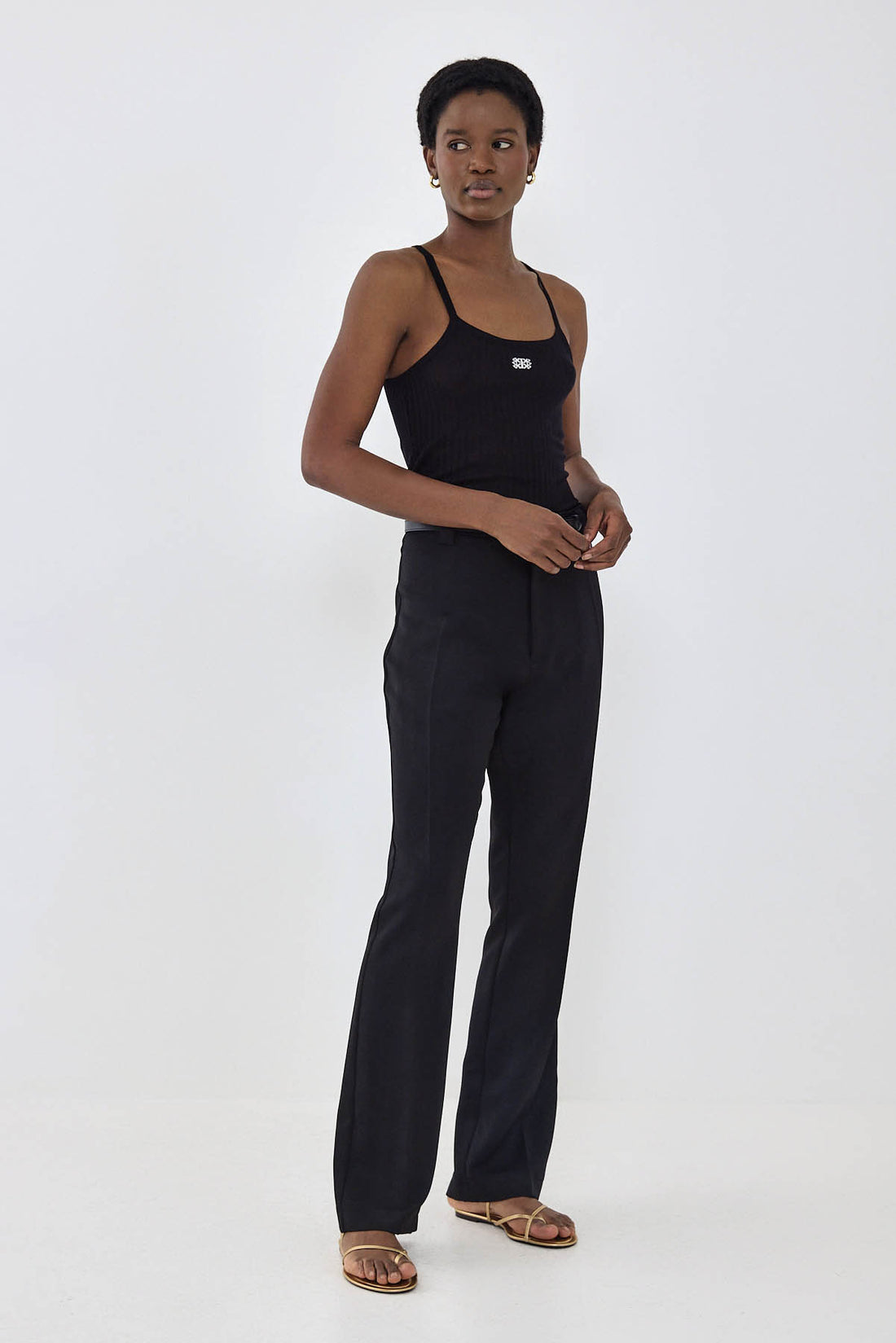 Meet the new addition to our signature daddy collection. High waisted tailored pants with a bootcut silhouette. Full length. Non-stretch lightweight woven fabric. Featuring wide belt loops. Front zip and metal hook closure. Embroidered logo detailing at the back. Style it with the cozy bralette and a blazer on top for the ultimate everyday look.