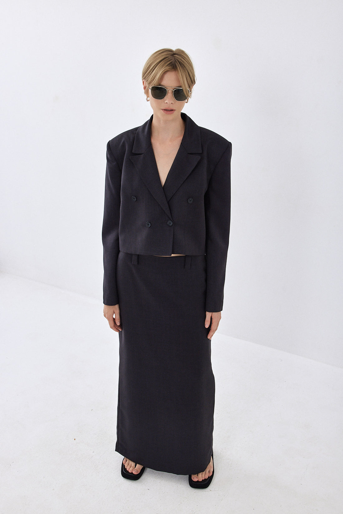 A new addition to our signature daddy collection. Cropped blazer. Features a lapel collar and front button closure. Long sleeves with pronounced shoulders. Dé Rococo embroidery ton sur ton at the back. Style it with a matching color daddy bottom for the ultimate stylish look.