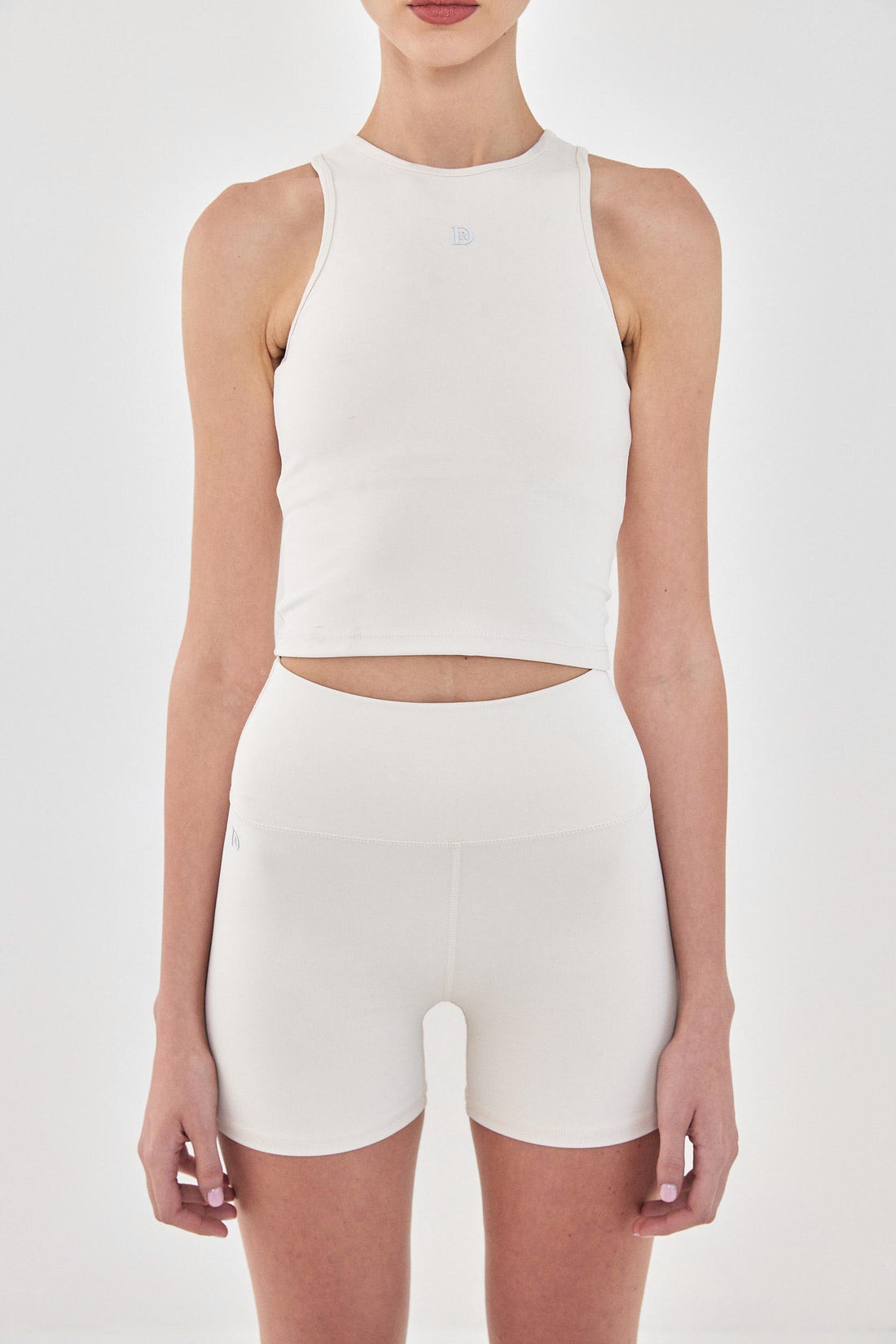 Our new Dé racer top in tofu is the perfect addition for a sporty and chic look. With a second-skin fit and feel, it is made from a stretchy yet supportive fabric. Has an inner layer at the chest with a supporting under bust band. Features a halter neckline and flat lock stitches. Reflector logo on the center front and a fitnéss club signature on the back. Complete the set with one of our matching fitnéss club bottom for an effortless sporty look.