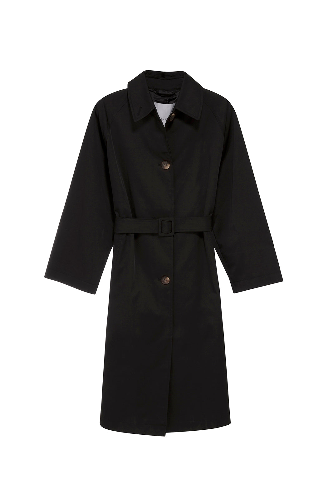 Dé trench coat is made from a lightweight and breathable fabric. A loose fit with long voluminous sleeves and a back vent hem. Sharp pointed collar with button fastening and comes with a self tie waist belt to cinch your waist. Wind and water resistant. Wear yours with absolutely everything, from tailoring to track pants.