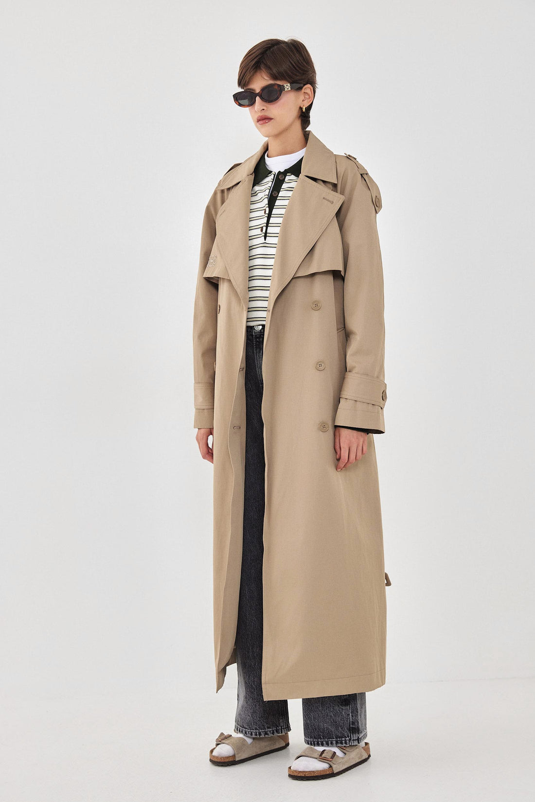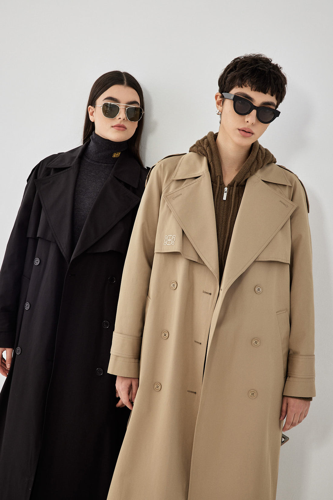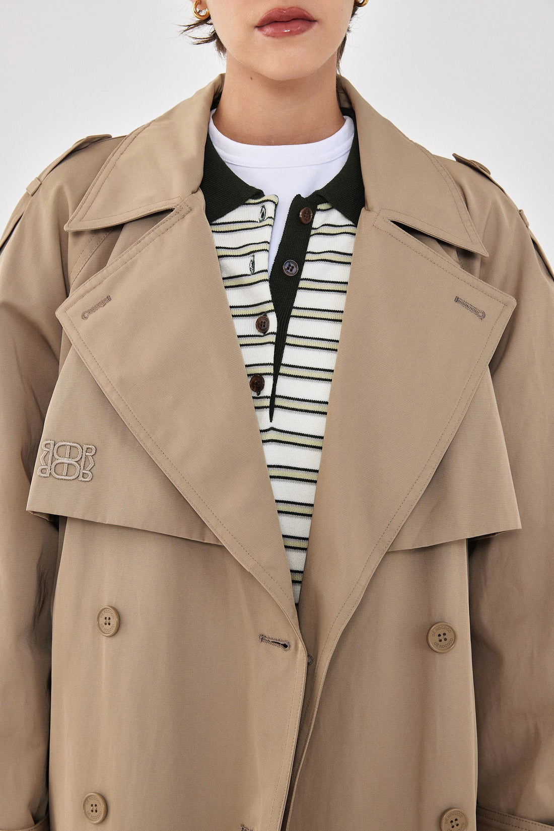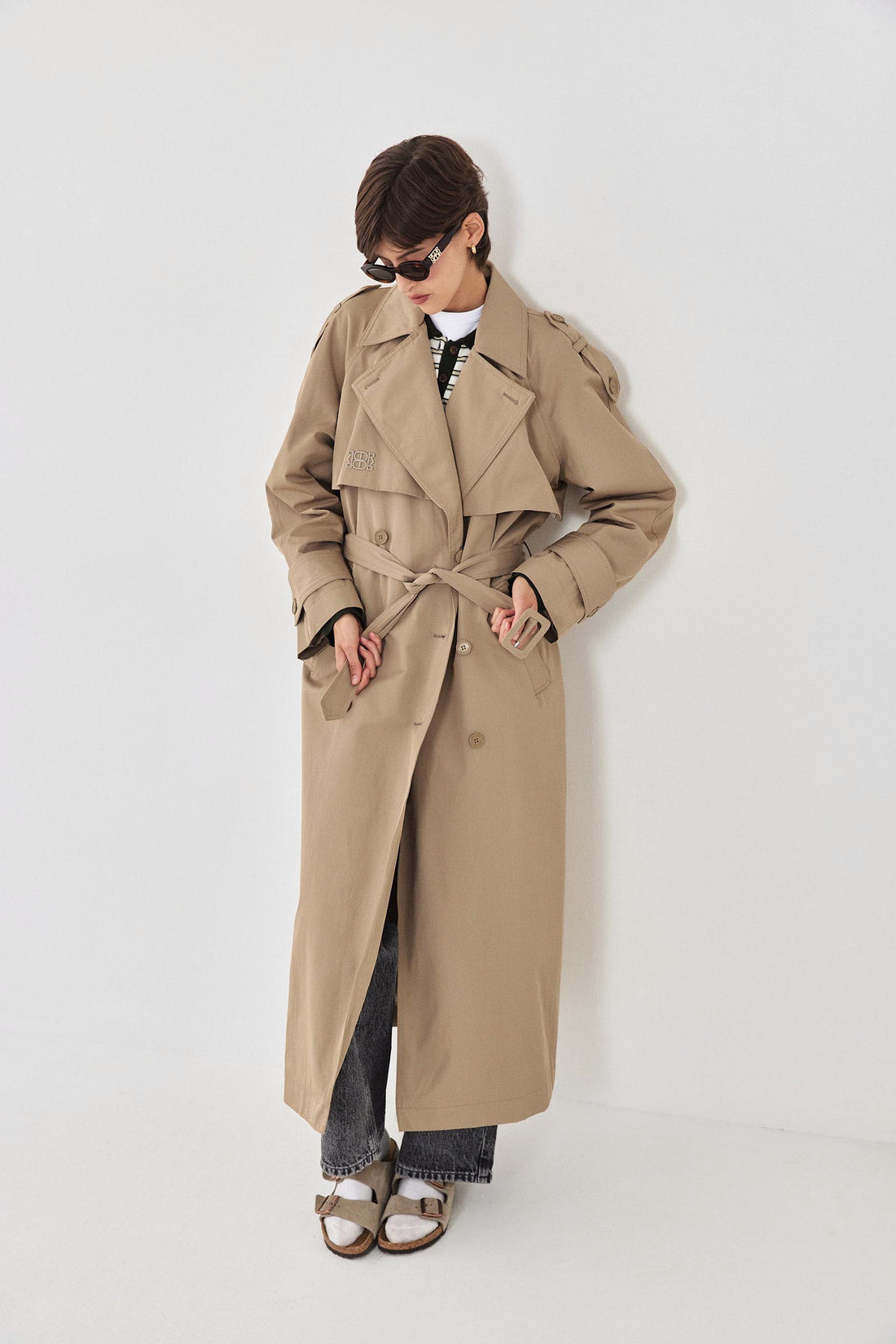 A new take on our classic trench coat. Double breasted. Side pockets. Featuring an embroidered logo on the front. Logo engraved buttoned closure. Sleeve loops. Epaulettes. Back yoke. Adjustable buckled waist. Lined. Style it over any look, honestly - any look, to tie it all together.