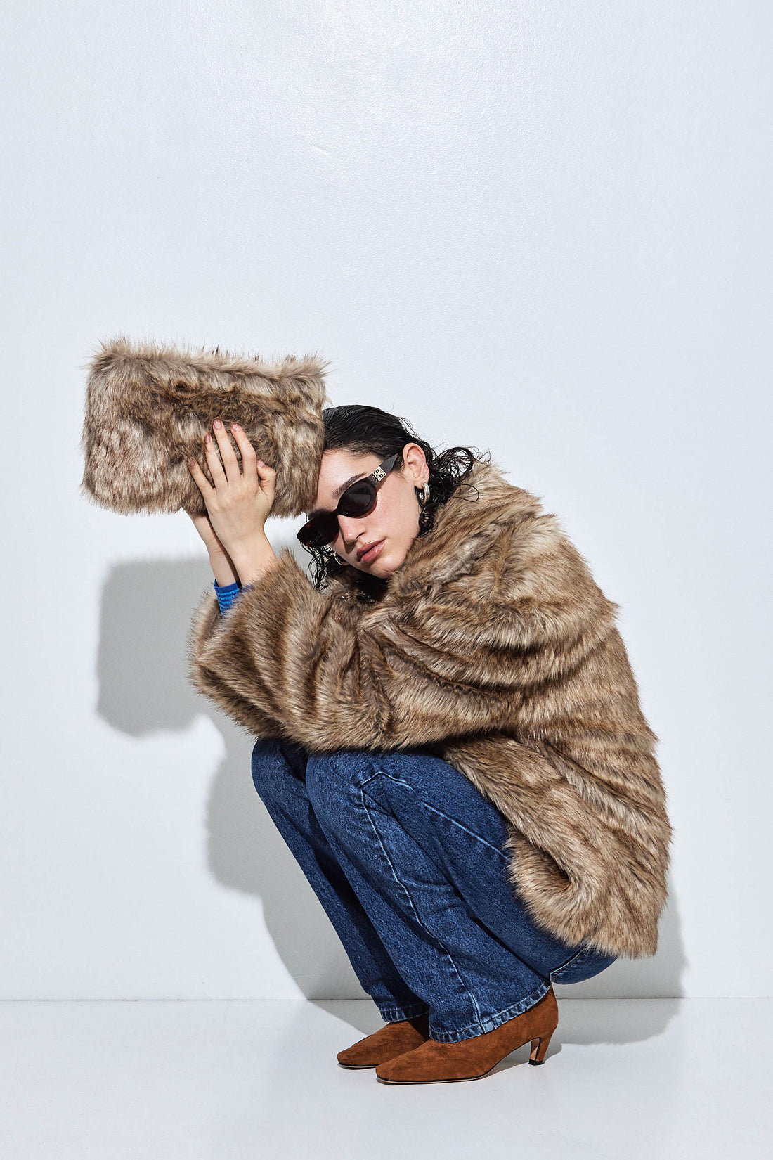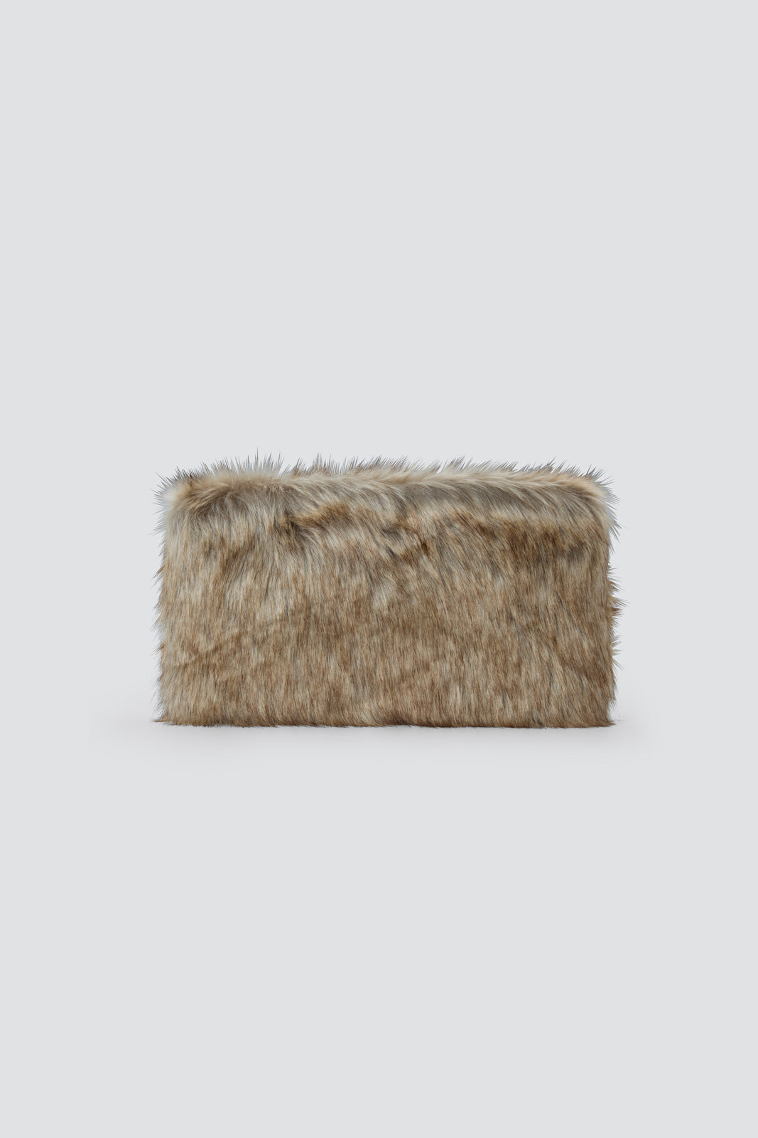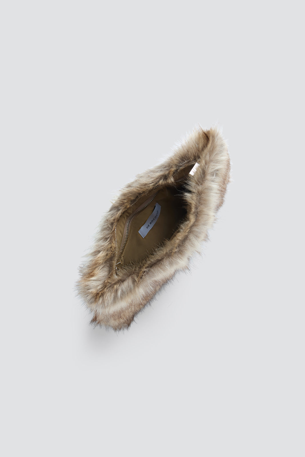 The perfect addition to our faux fur collection. Logo engraved zipper closure. Puffy and padded look. Internal zipper pocket with embroidered logo lining. Style it with our faux fur coat for a cool and cozy look.