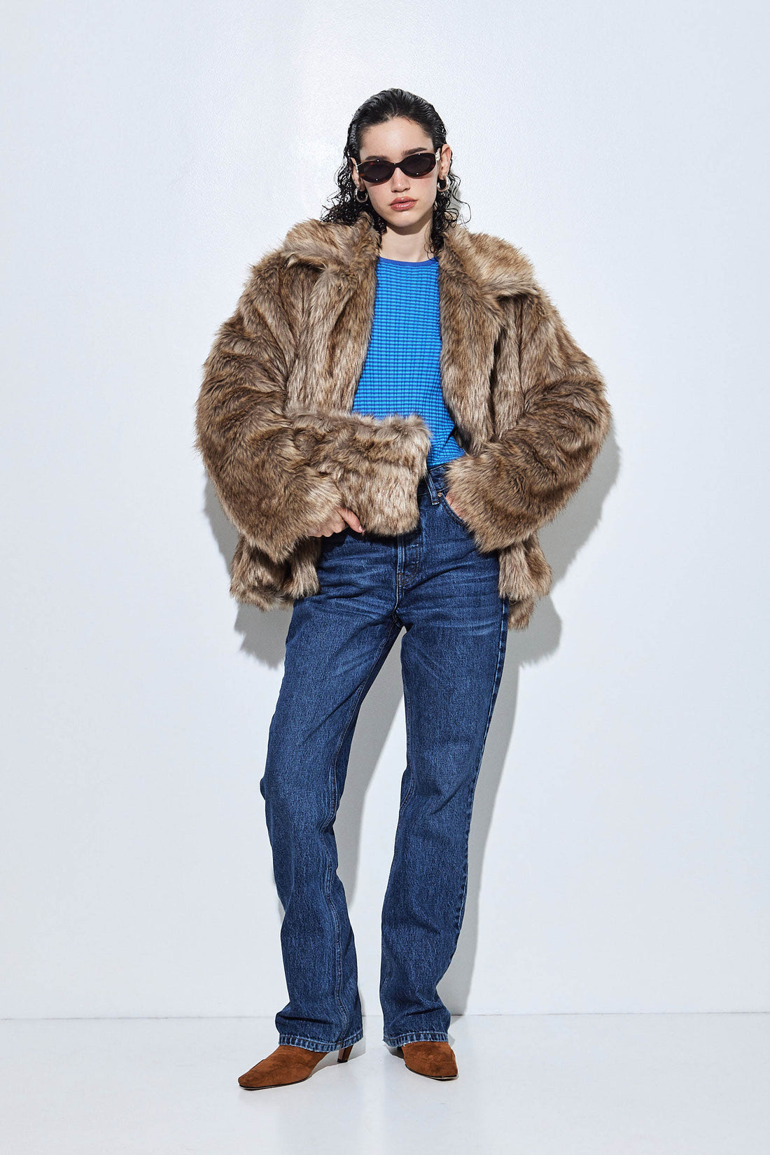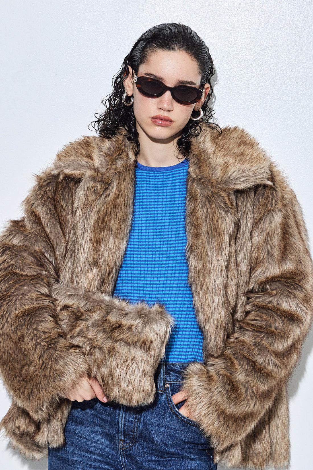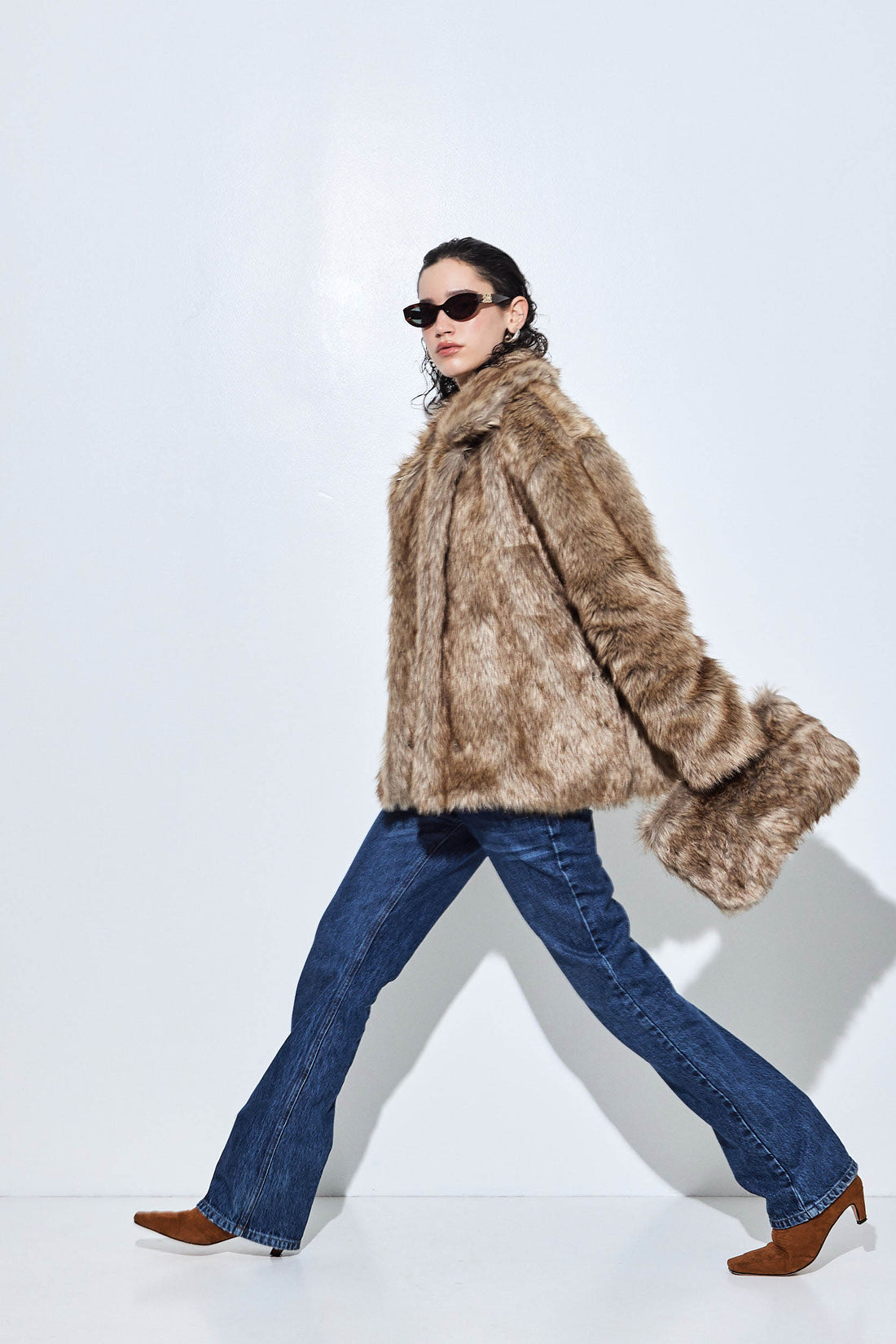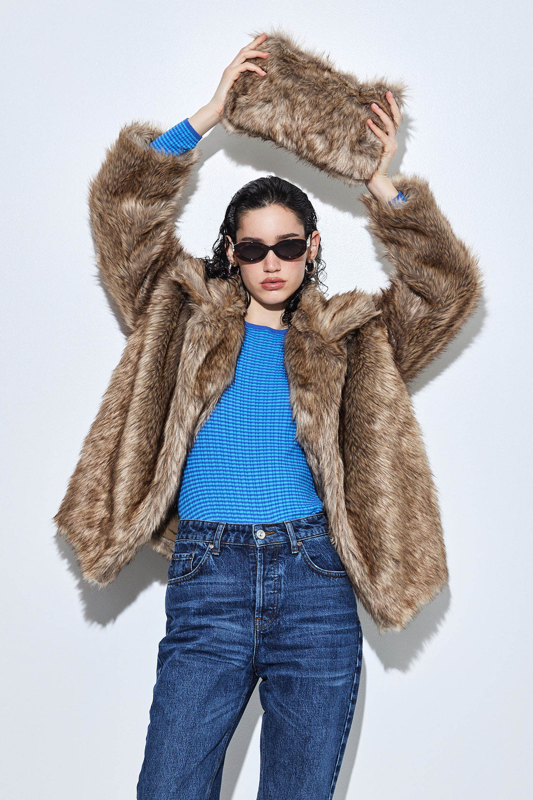 The perfect addition to our faux fur collection. Logo engraved zipper closure. Puffy and padded look. Internal zipper pocket with embroidered logo lining. Style it with our faux fur coat for a cool and cozy look.