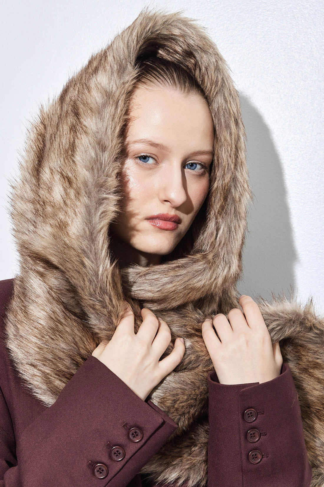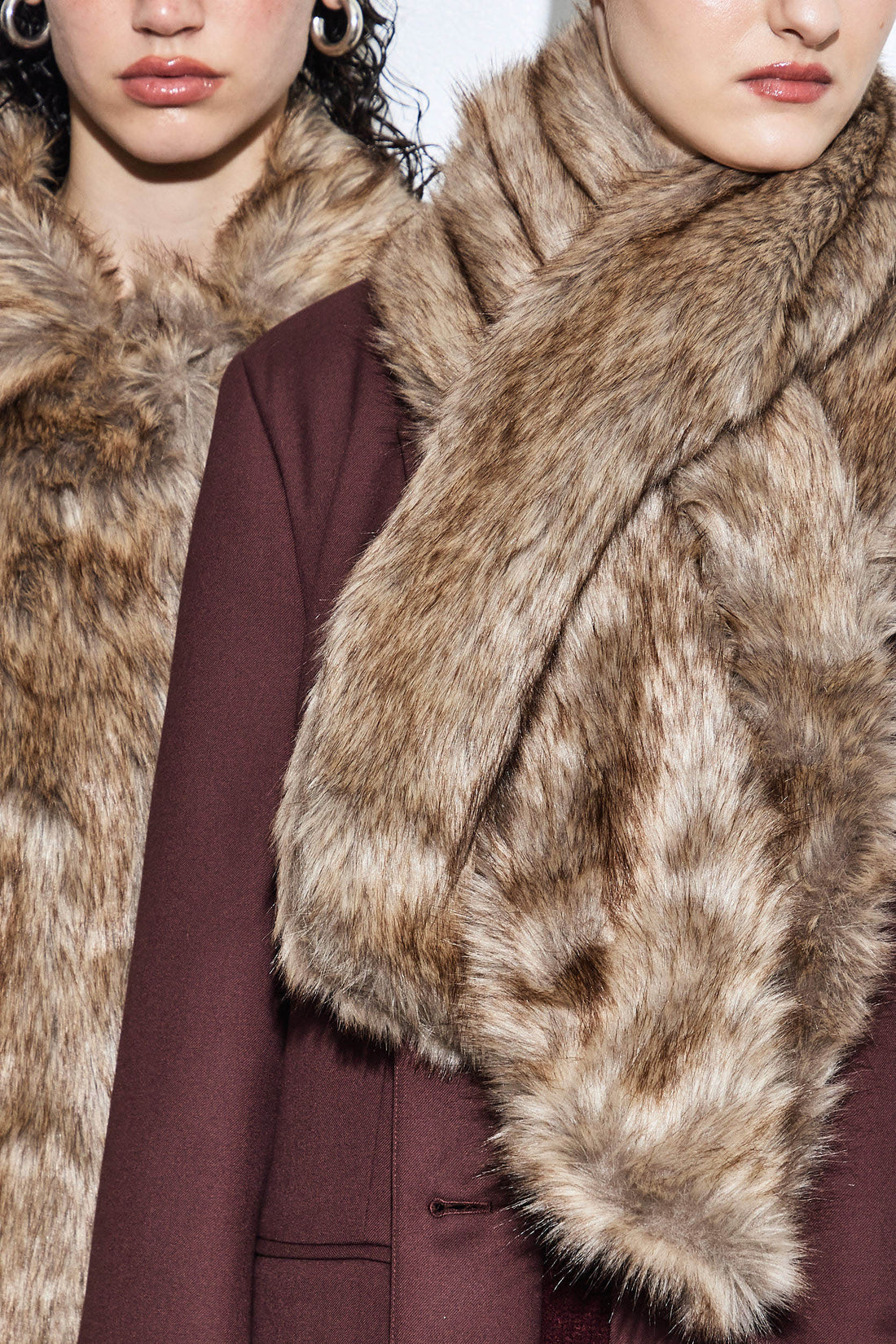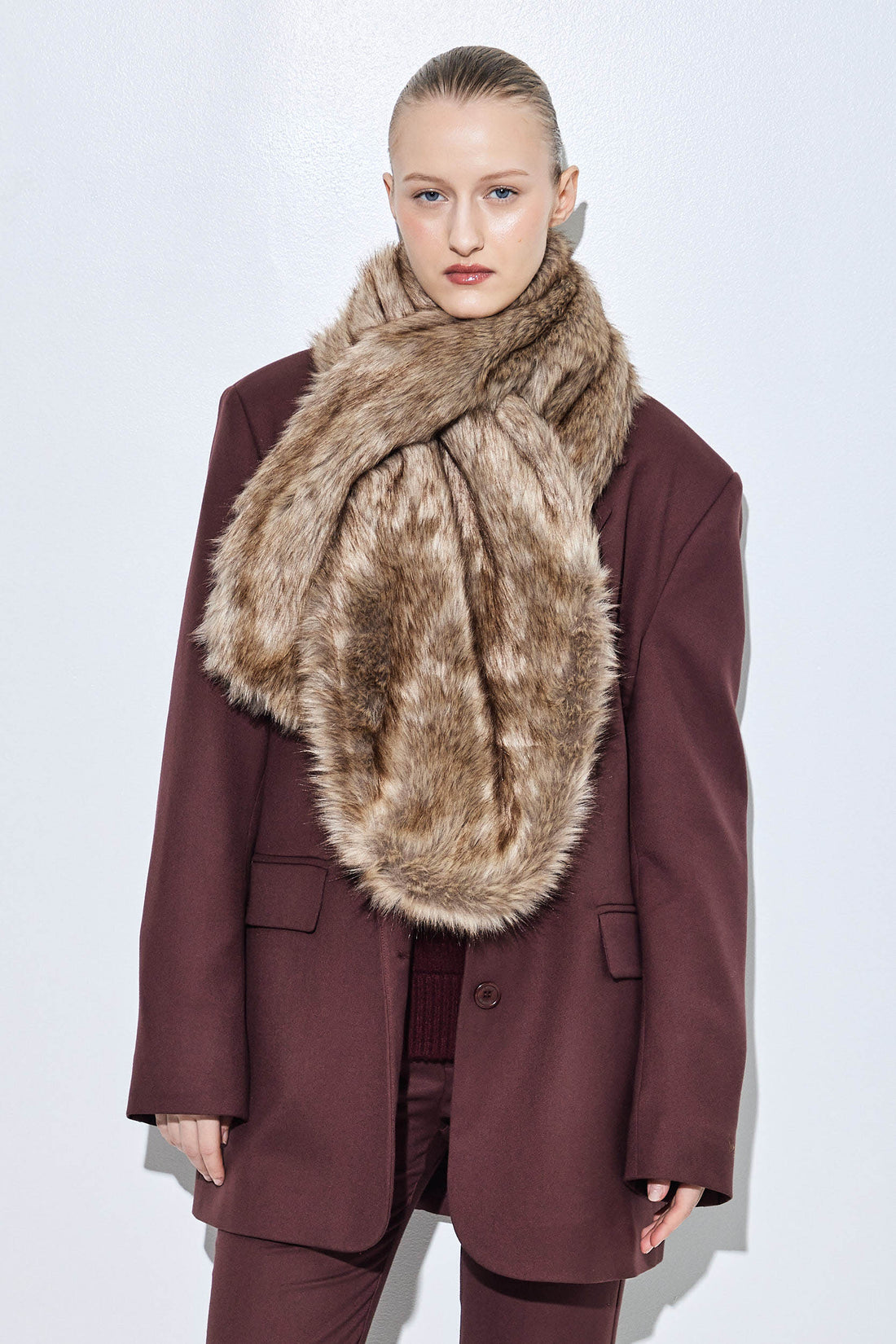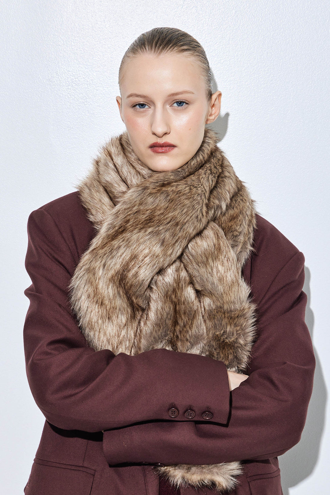 Our faux fur scarf is the ultimate winter accessory this season. Double-sided with fur on both sides. Dé Rococo logo tag. Delicate keyhole detail at the end, designed to elegantly loop through itself. Style it with our matching faux fur coat and a pair of our flattering denim for a luxurious look.