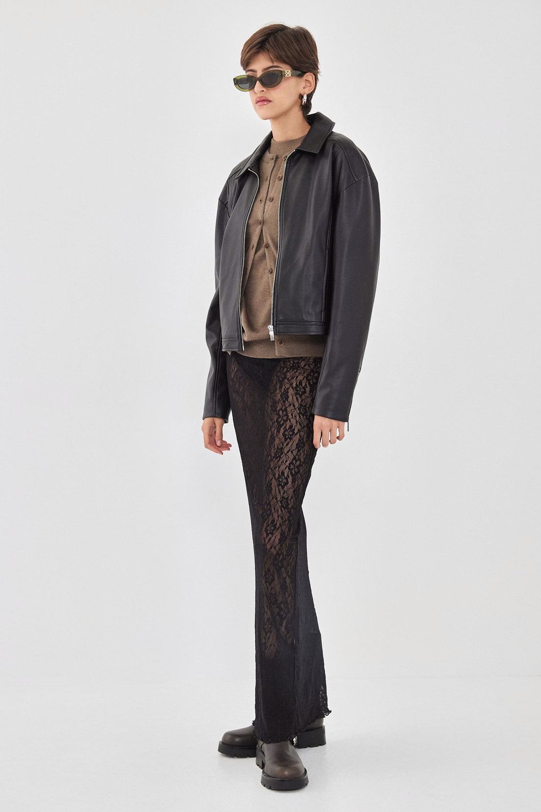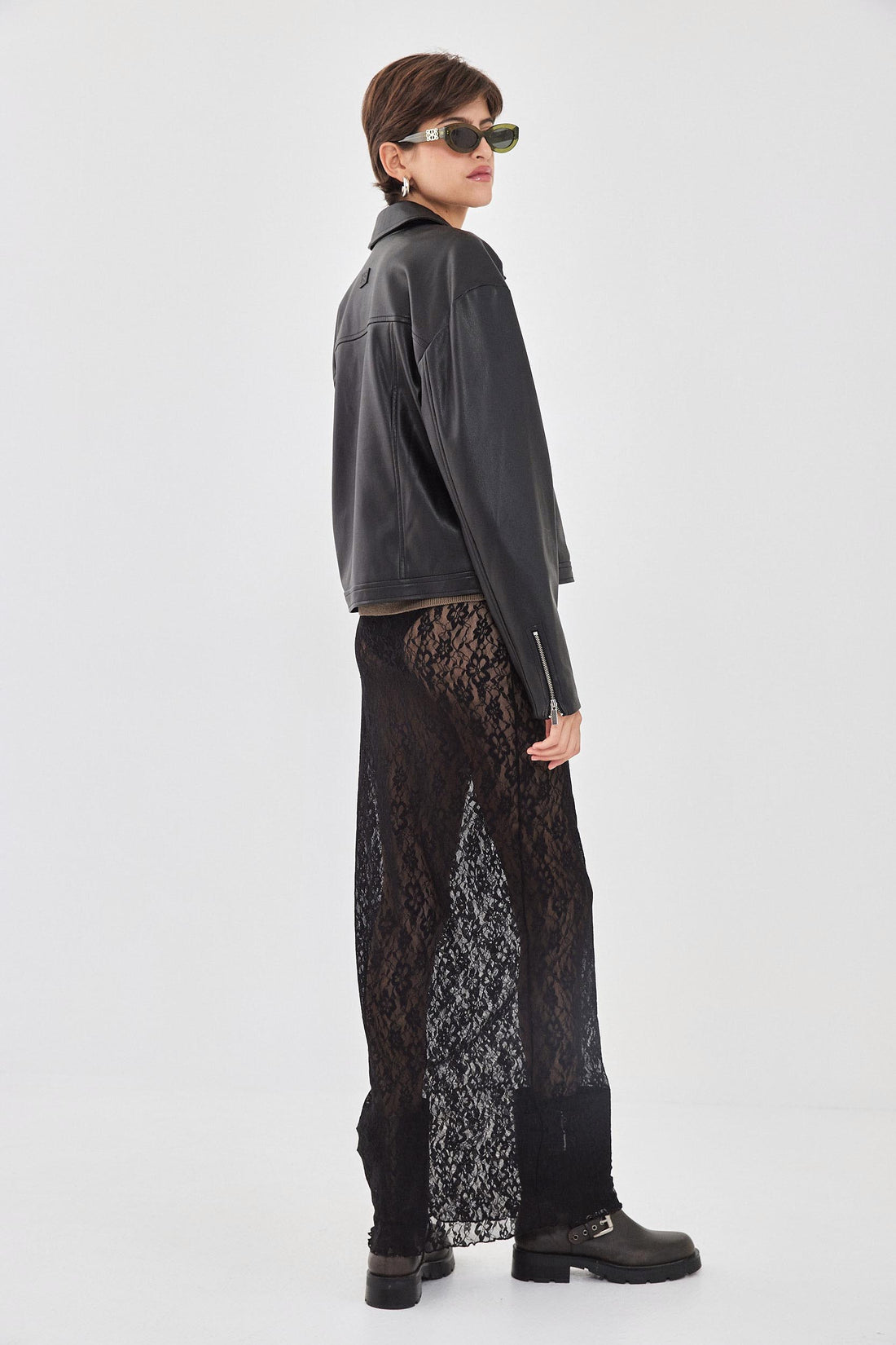 Vegan leather boxy jacket. Features a pointed collar and a front zip closure. Slim fit with side pockets. Logo patch above the back. Wear over any outfit to complete your look.
