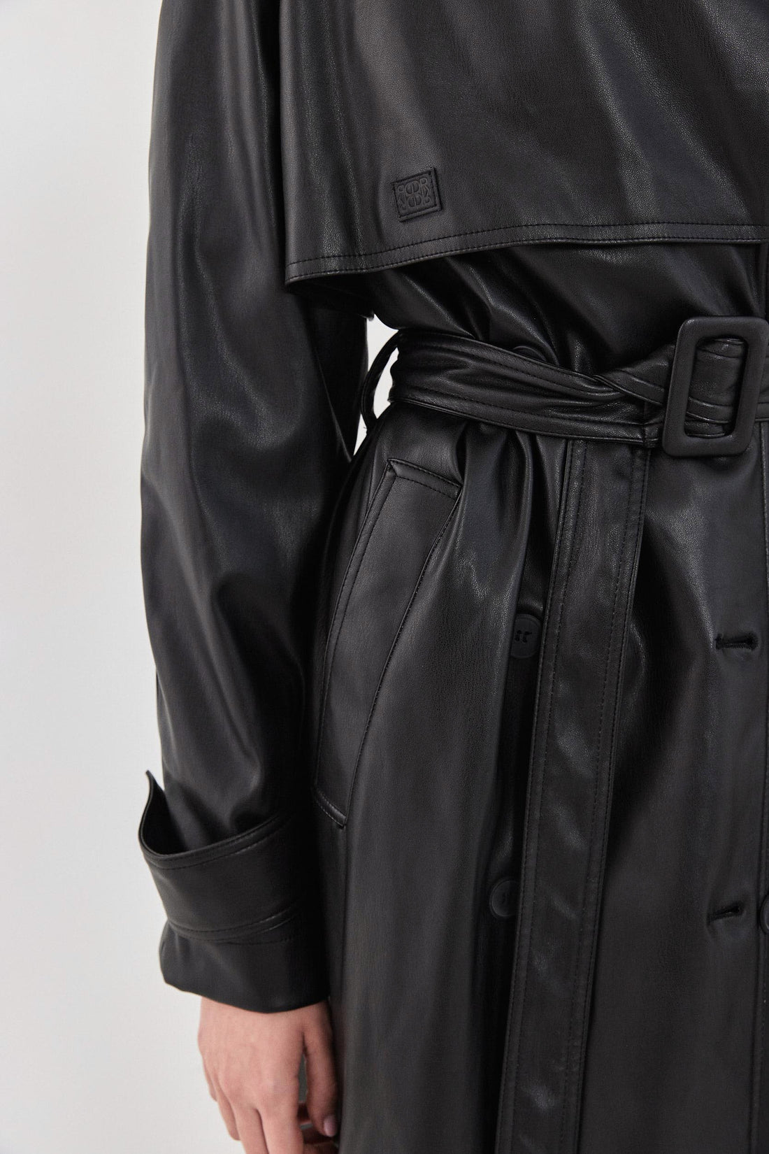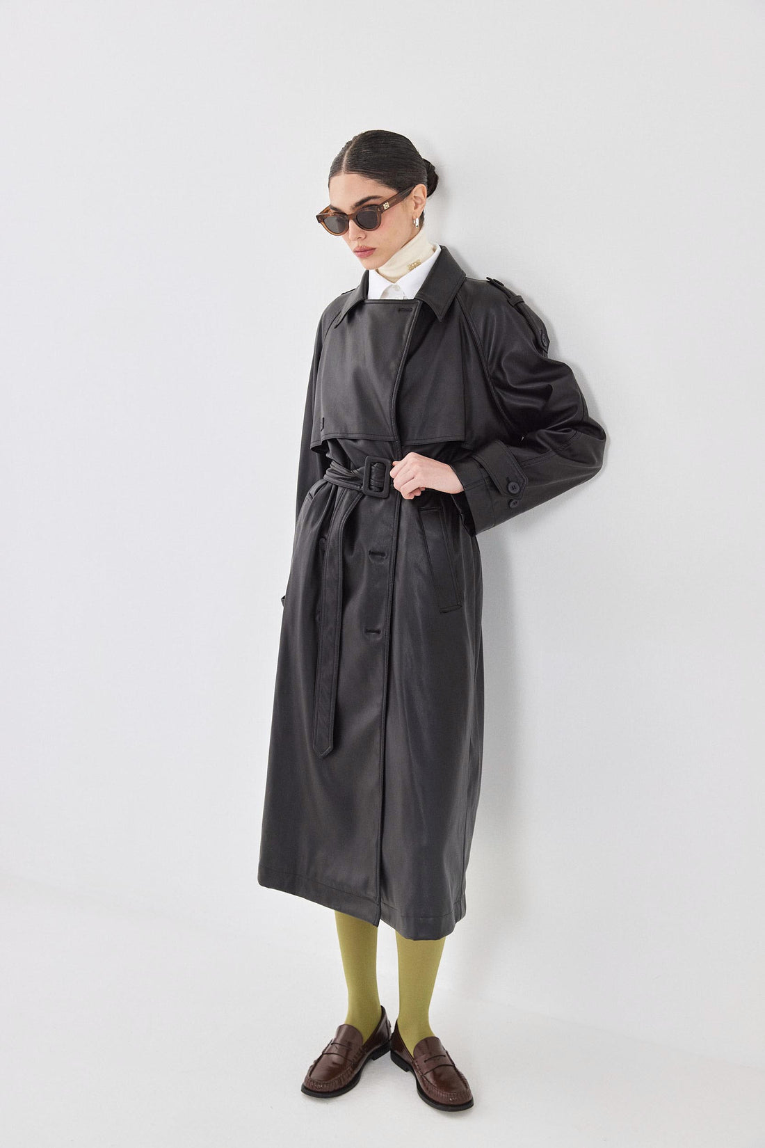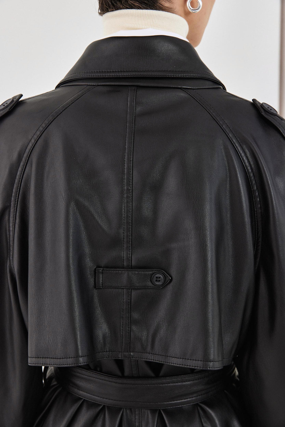 Oversized vegan leather trench coat. Buttery soft. Featuring long sleeves with adjustable tabs and side pockets. Double breasted button closure, adjustable buckled waist and a back vent at the hem. A timeless coat, wear it over any outfit to complete your look.