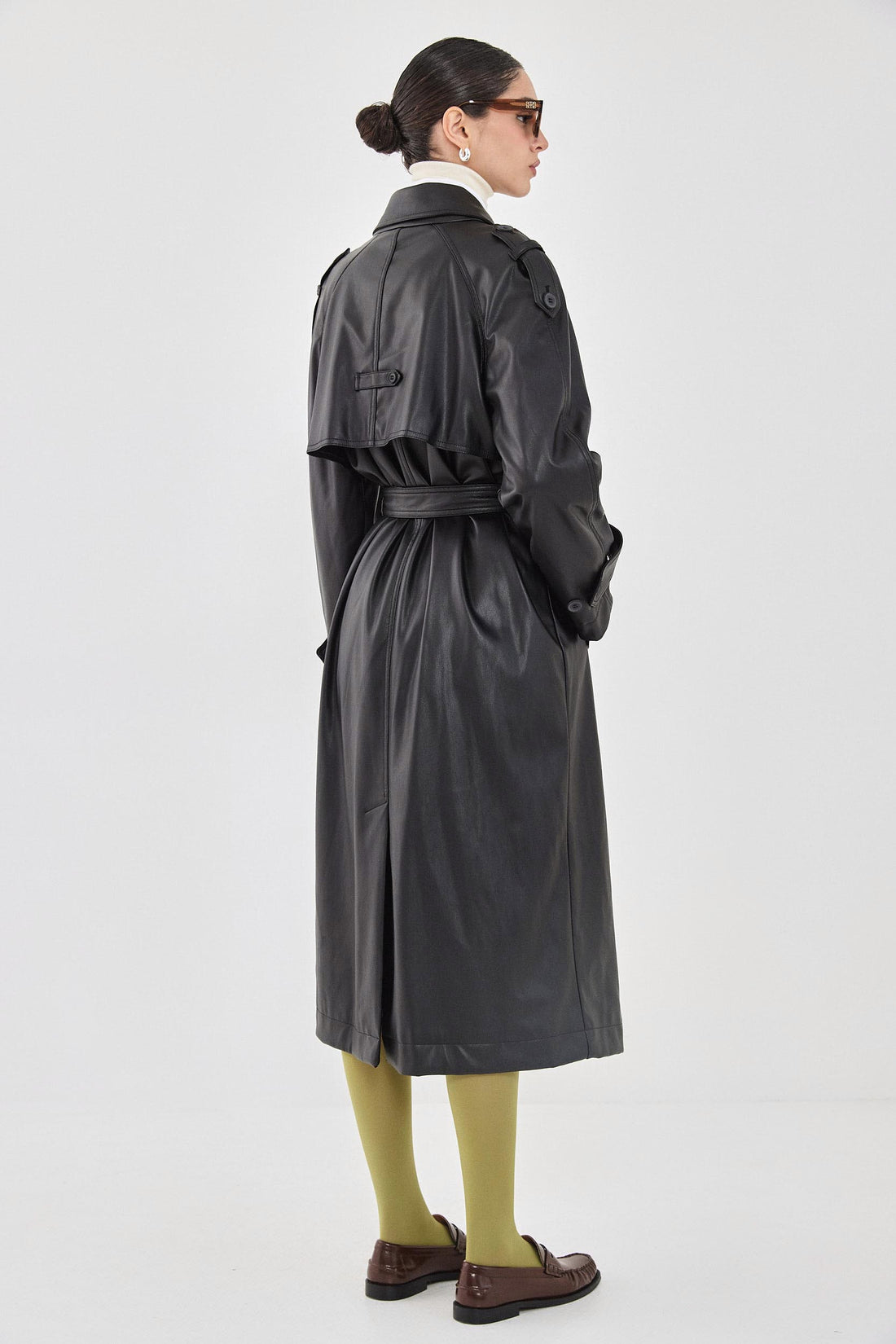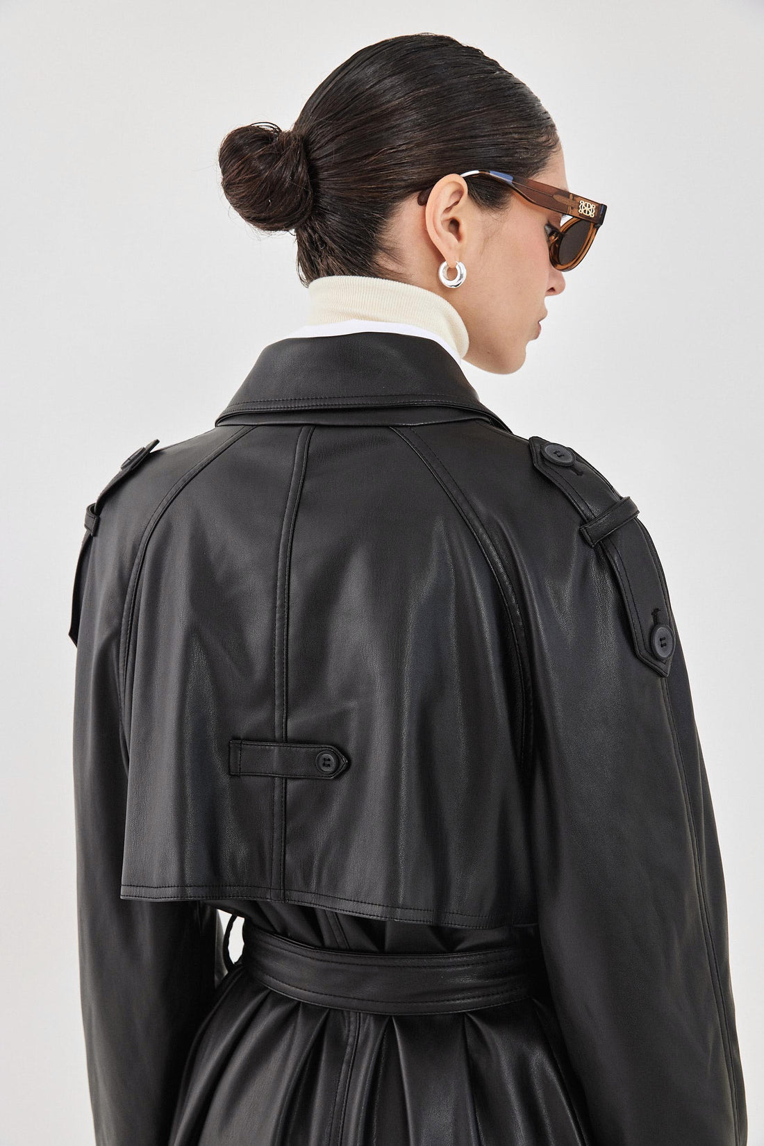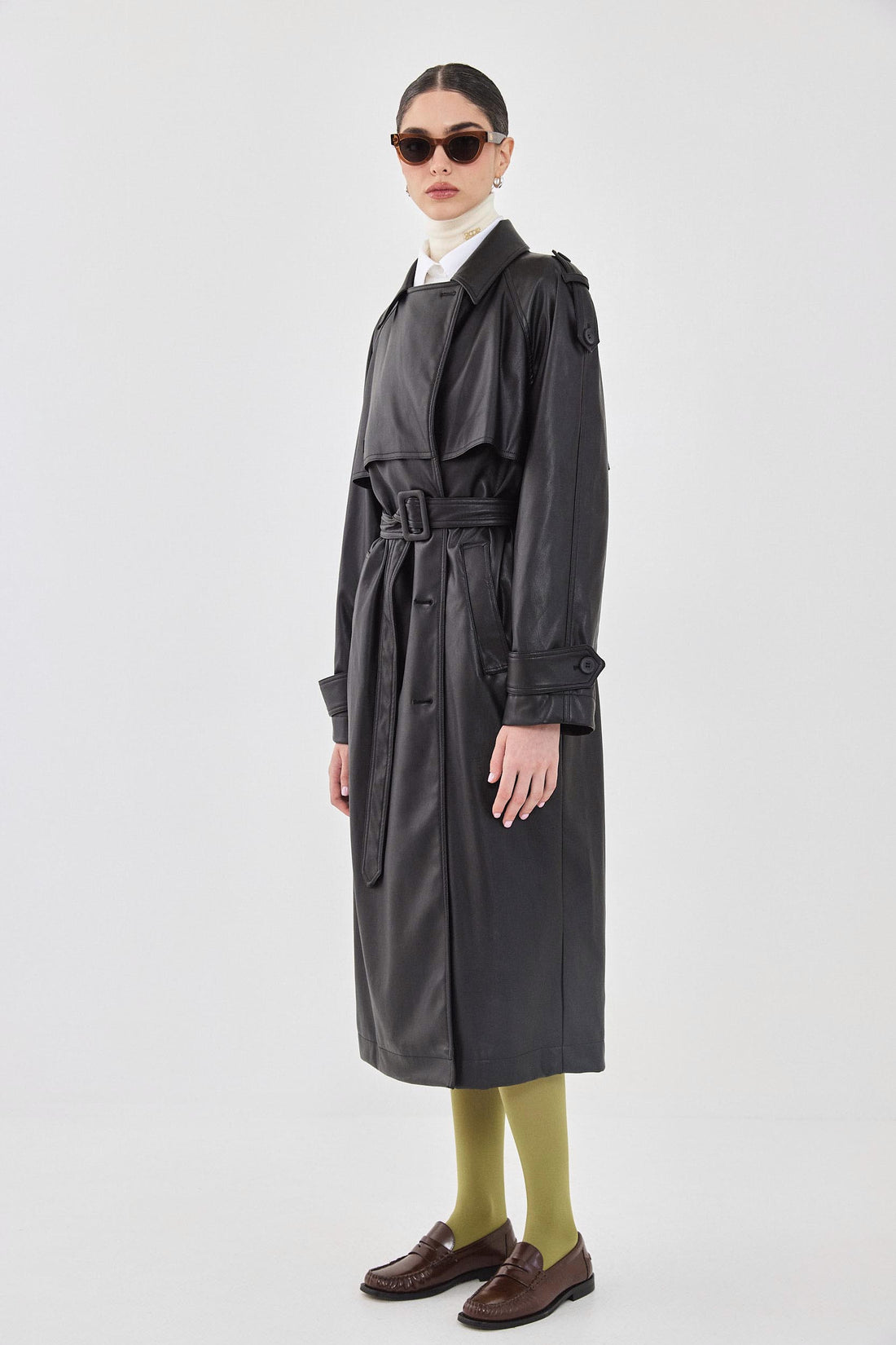 Oversized vegan leather trench coat. Buttery soft. Featuring long sleeves with adjustable tabs and side pockets. Double breasted button closure, adjustable buckled waist and a back vent at the hem. A timeless coat, wear it over any outfit to complete your look.