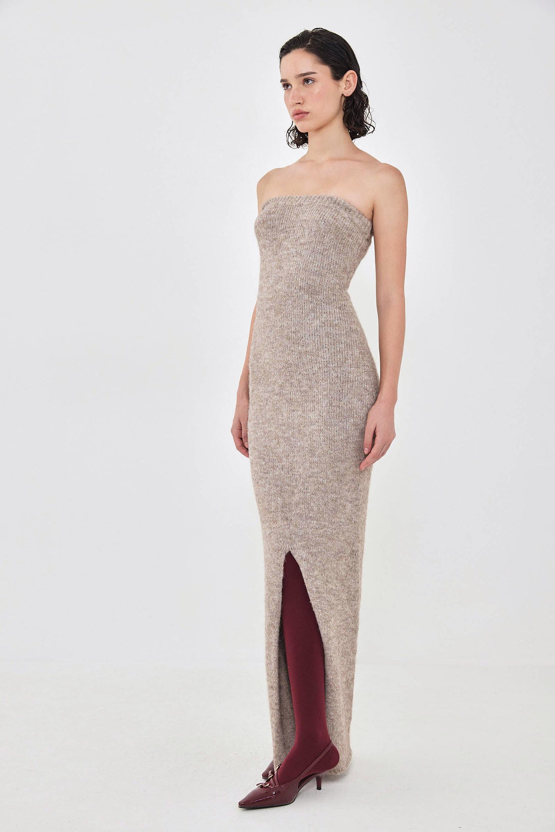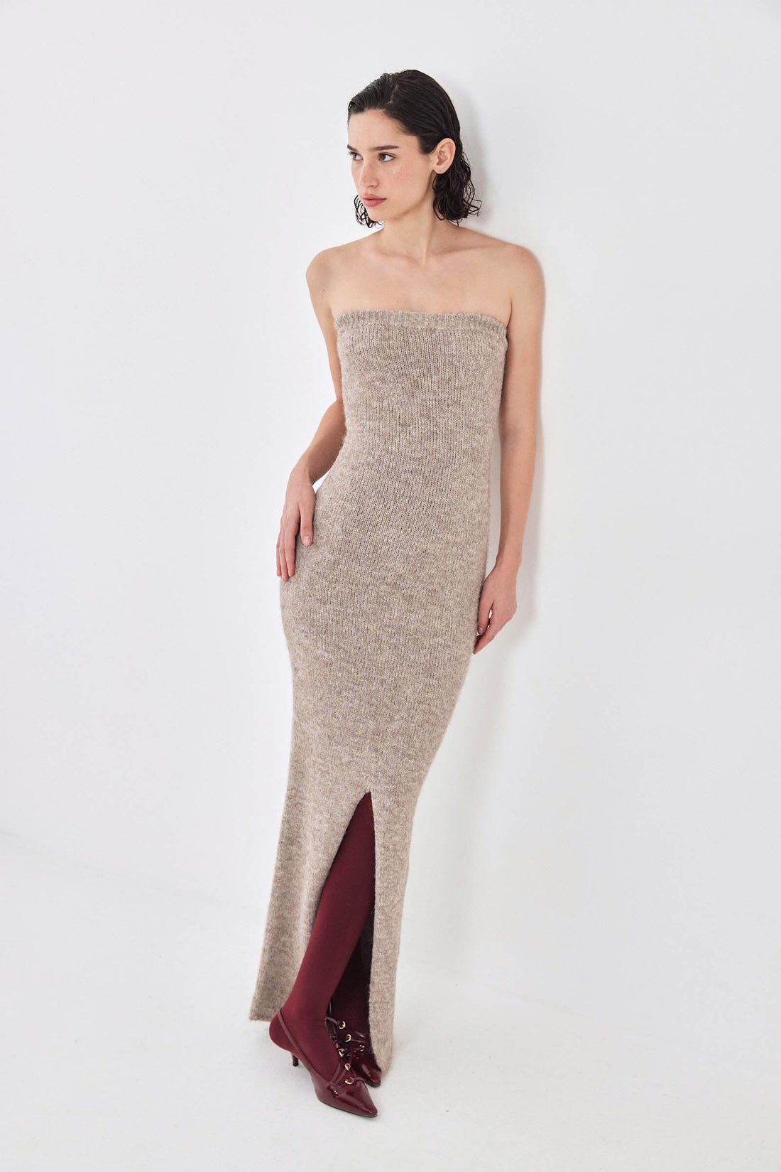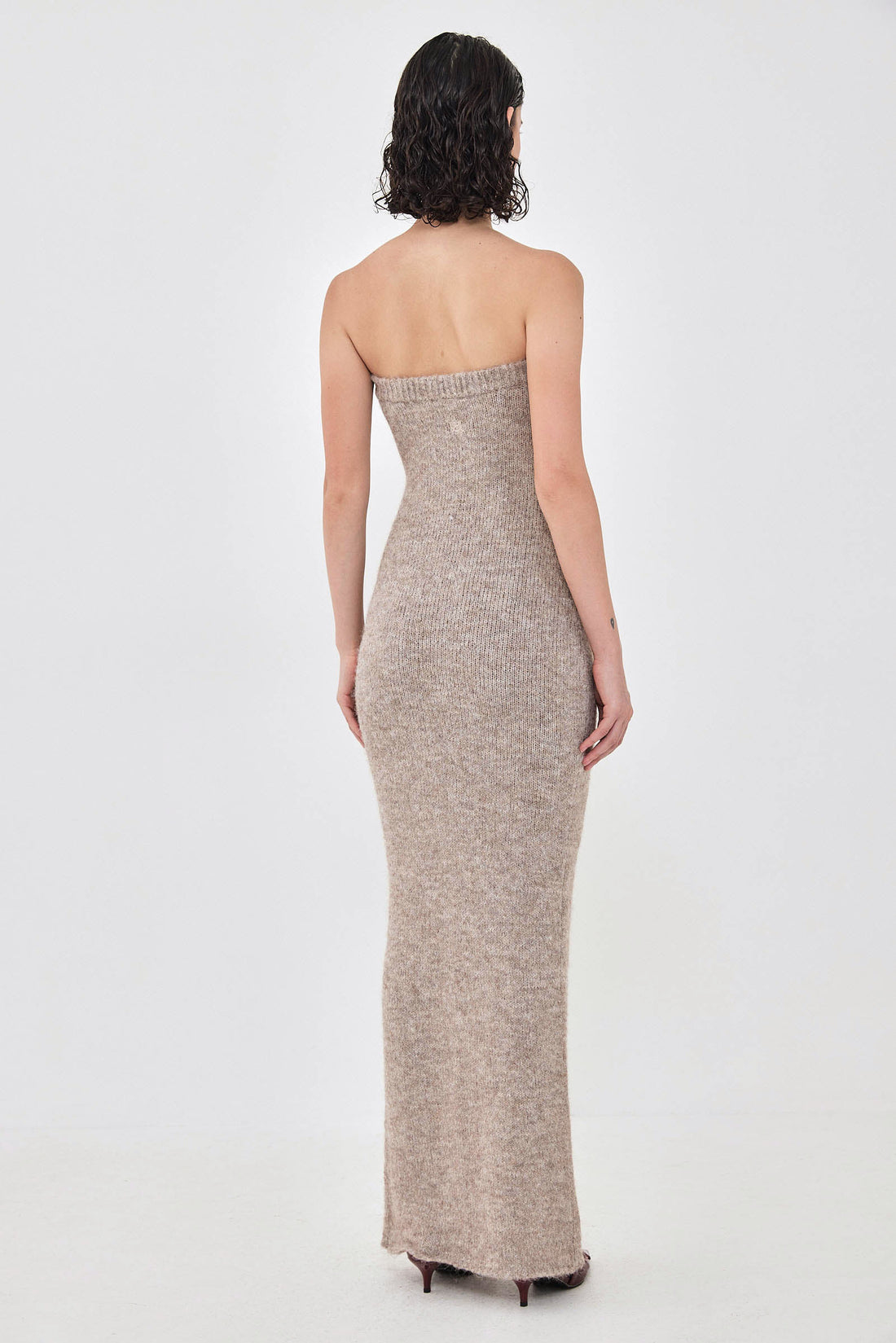Our new fuzzy strapless maxi dress is the ultimate must have this fall. Soft and cozy fabric. Featuring a comfortable and elastic band for a secure fit. Delicate tonal embroidered logo on the back. A sleek, form-fitting silhouette that flatters the body. Front slit. Style it with our matching fuzzy cardigan, our classy quilted clutch and a pair of our oval sunnies for an effortless fall look.