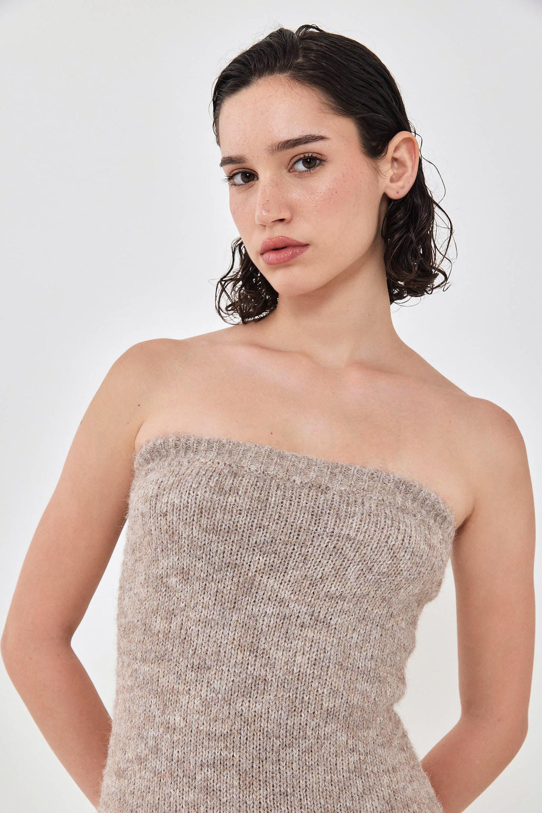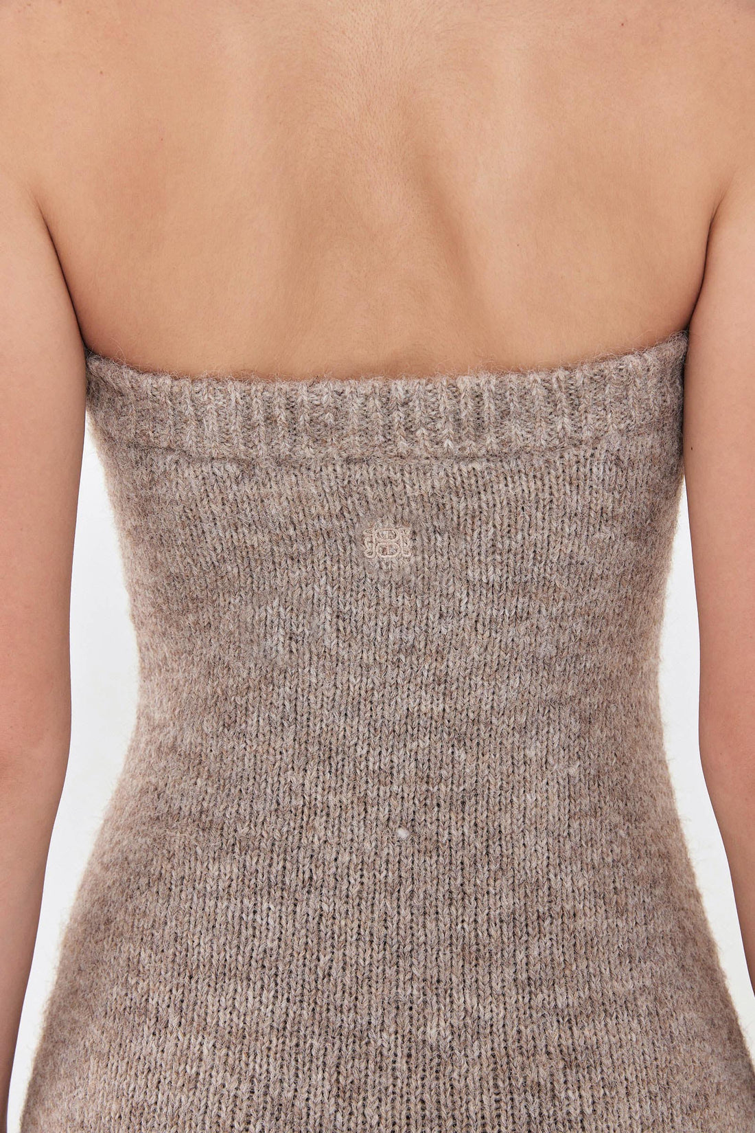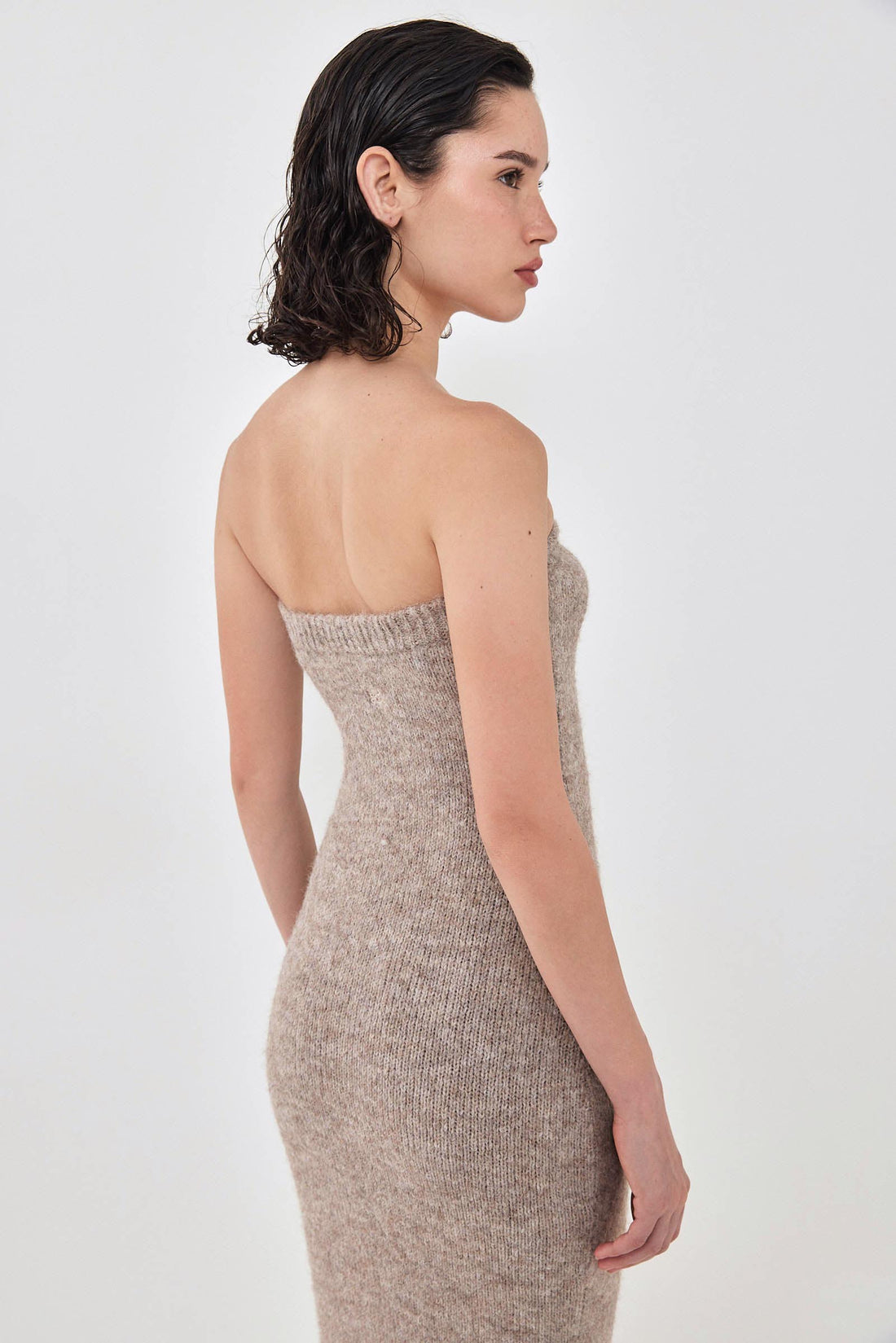 Our new fuzzy strapless maxi dress is the ultimate must have this fall. Soft and cozy fabric. Featuring a comfortable and elastic band for a secure fit. Delicate tonal embroidered logo on the back. A sleek, form-fitting silhouette that flatters the body. Front slit. Style it with our matching fuzzy cardigan, our classy quilted clutch and a pair of our oval sunnies for an effortless fall look.