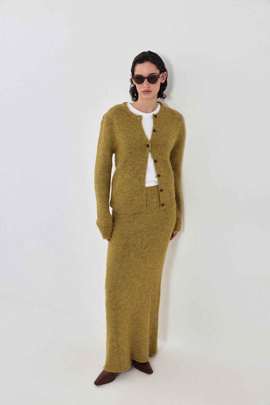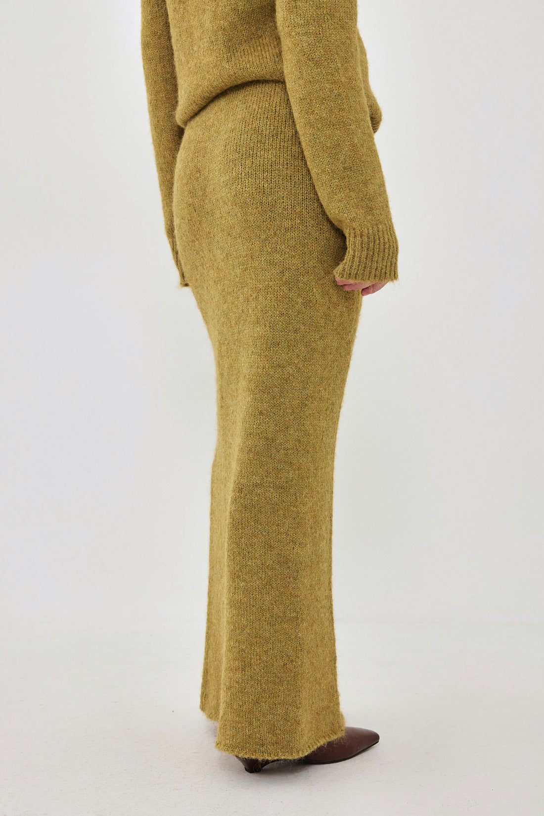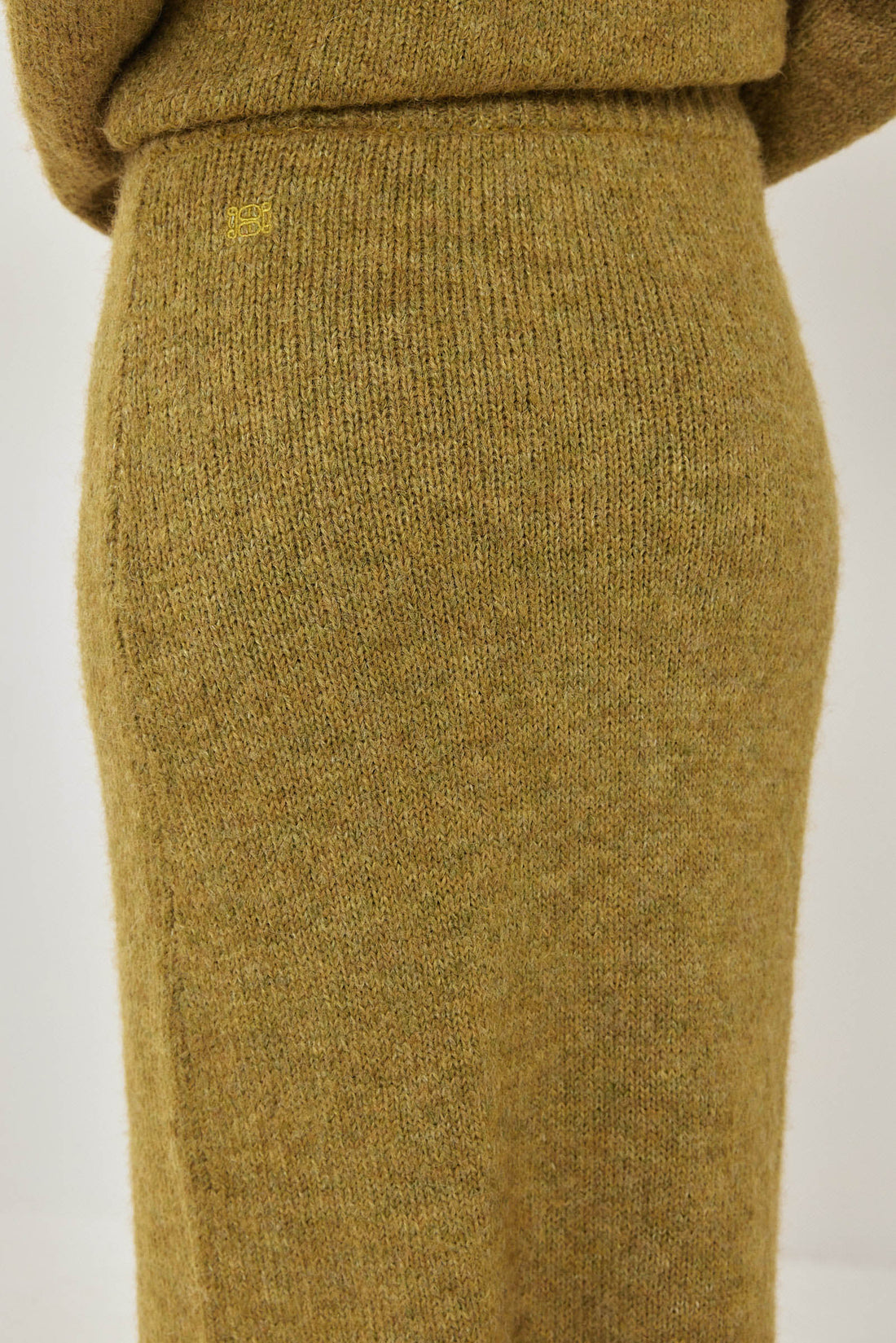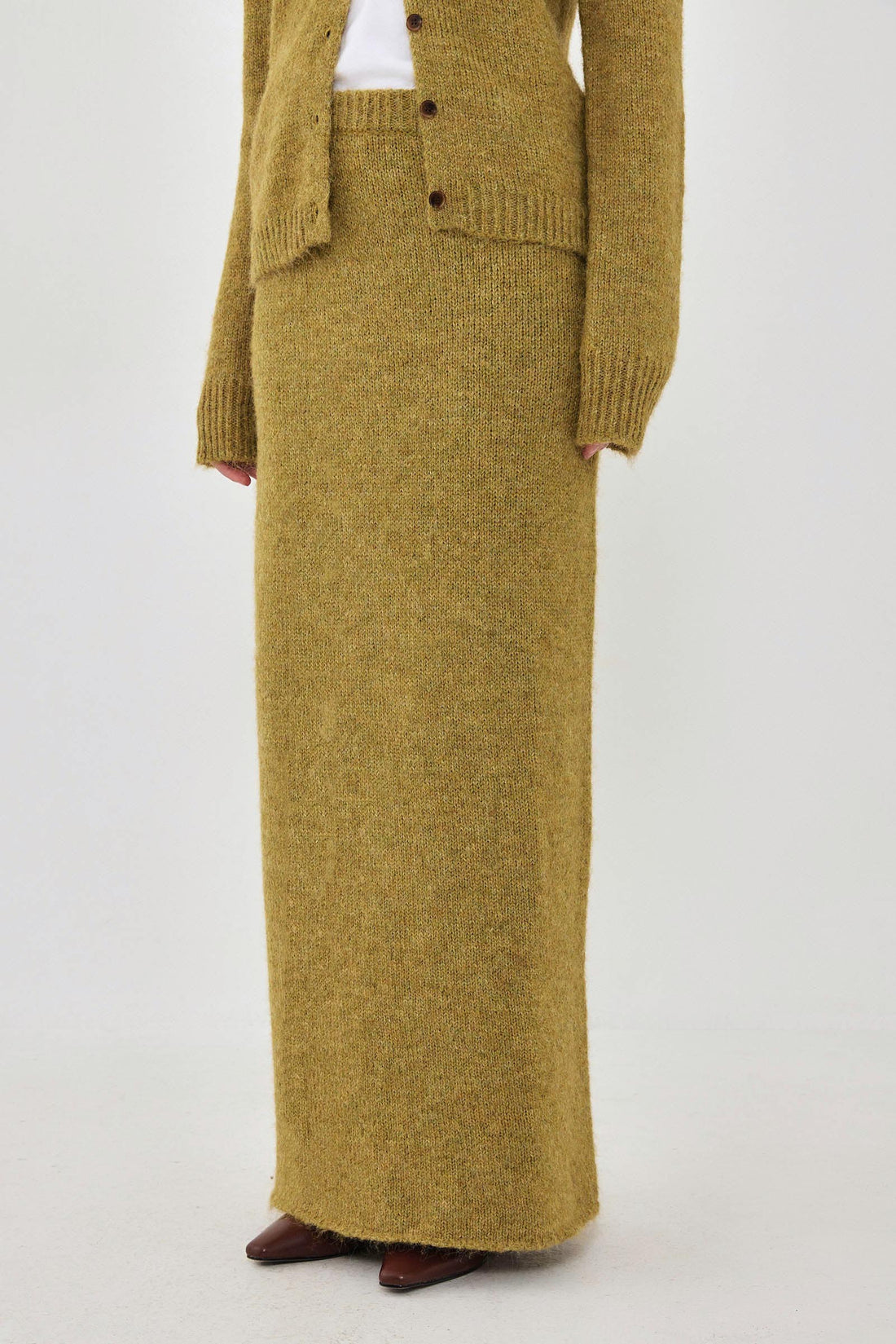 Add a touch of cozy texture to elevate your fall look with our new fuzzy maxi skirt. Soft and cozy fabric. Comfortable ribbed elastic waistband. Low rise. A sleek, form-fitting silhouette that flatters the body. Tonal logo embroidery on the back. Style it with our matching fuzzy jumper, our signature belt and a pair of our chic oval sunnies for a beautiful cozy look.