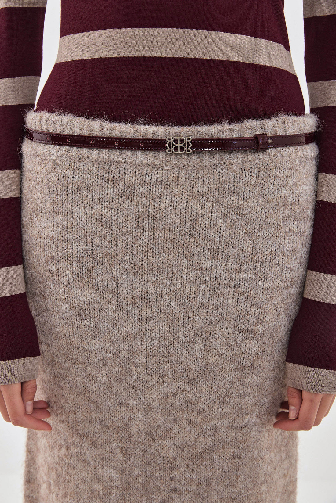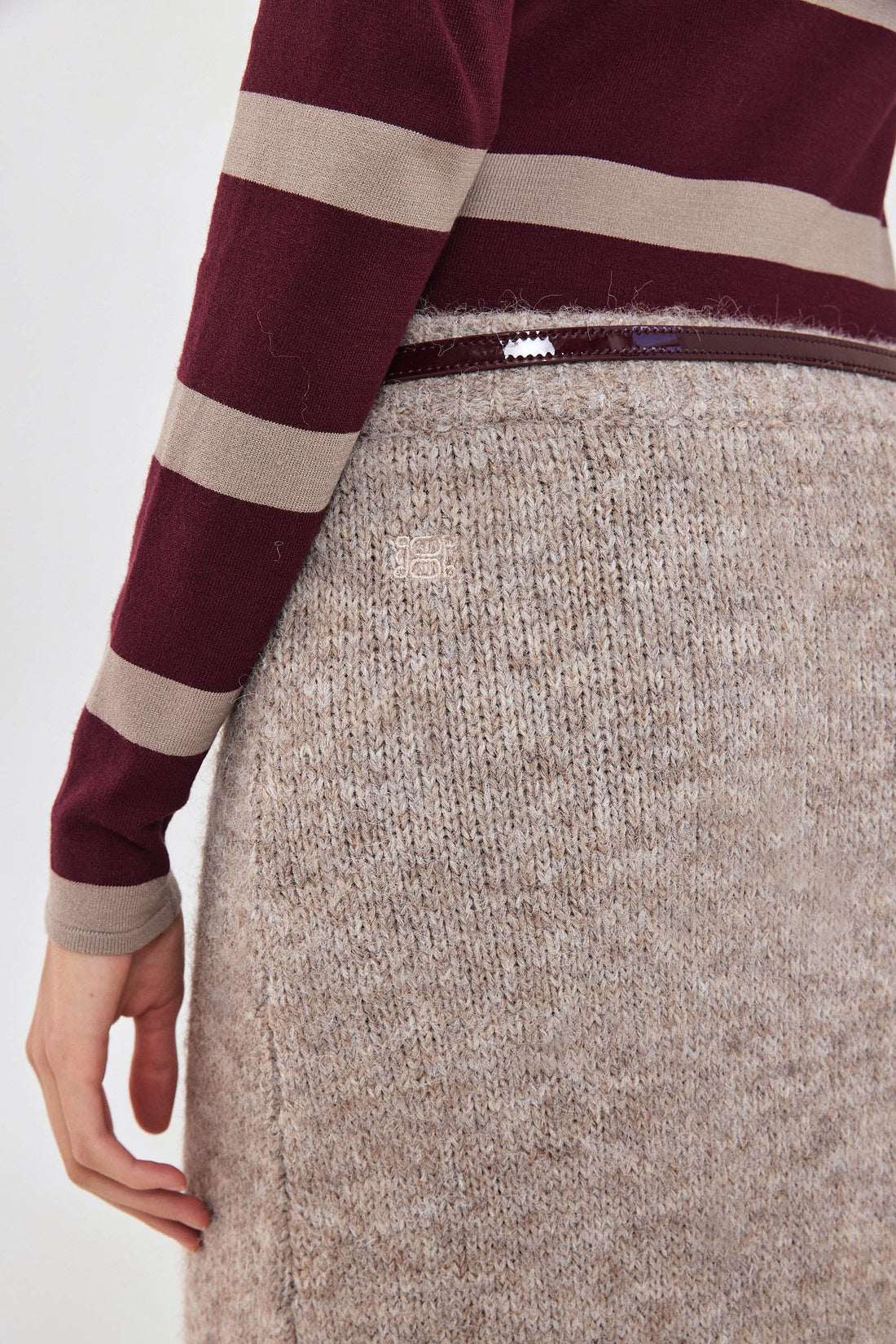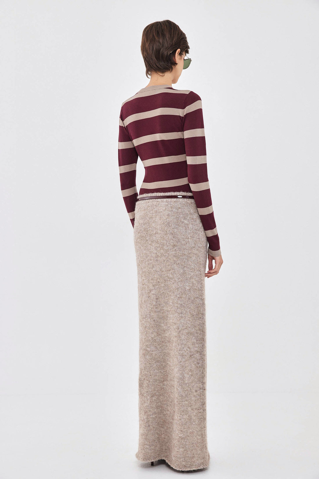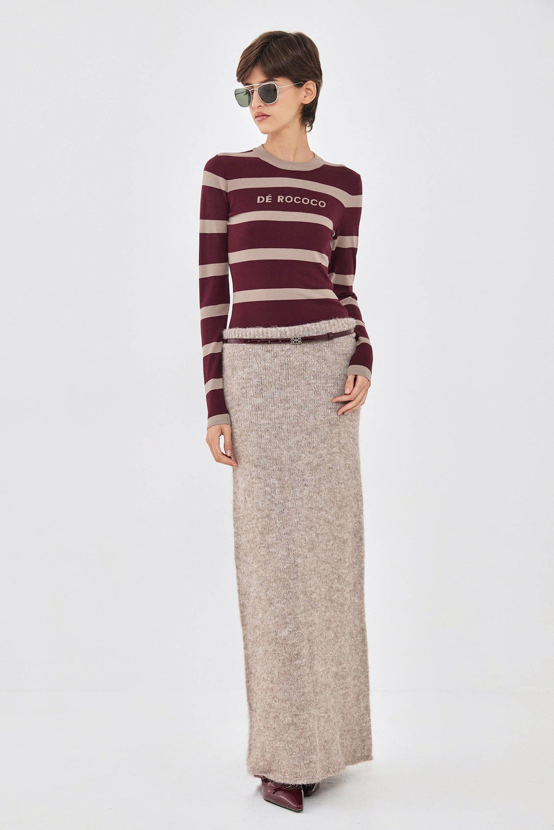 Add a touch of cozy texture to elevate your fall look with our new fuzzy maxi skirt. Soft and cozy fabric. Comfortable ribbed elastic waistband. Low rise. A sleek, form-fitting silhouette that flatters the body. Tonal logo embroidery on the back. Style it with our matching fuzzy jumper, our signature belt and a pair of our chic oval sunnies for a beautiful cozy look.