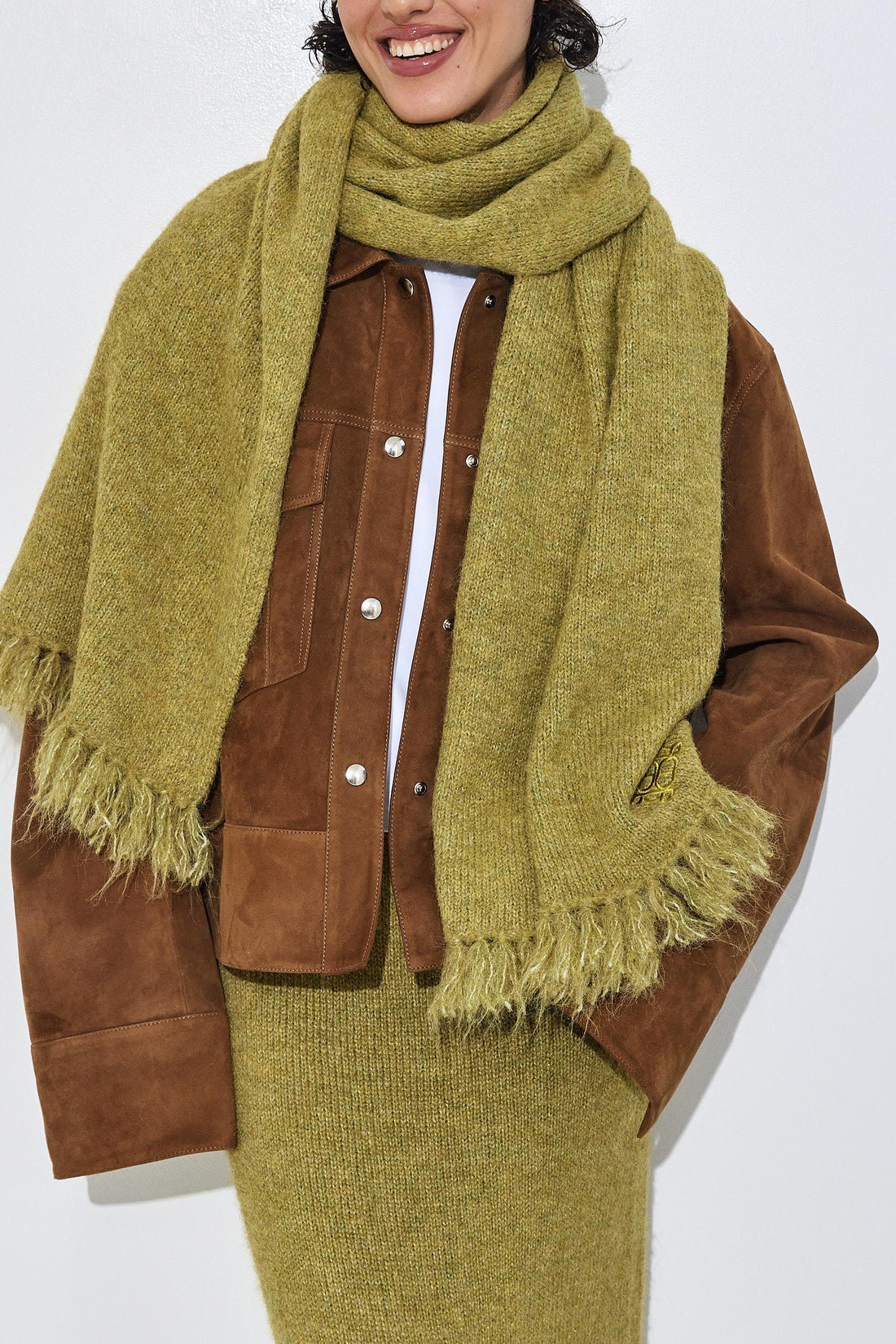 Our new fuzzy scarf is the ultimate winter accessory. Soft and cozy fabric. Tonal embroidered logo near the fringe trim. Style it with our flattering denim, our long sleeved ribbed knit and our beautiful double breasted trench for a classic everyday look.