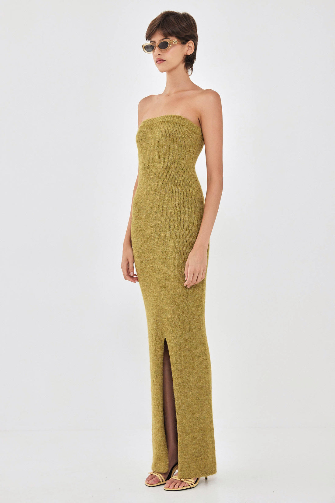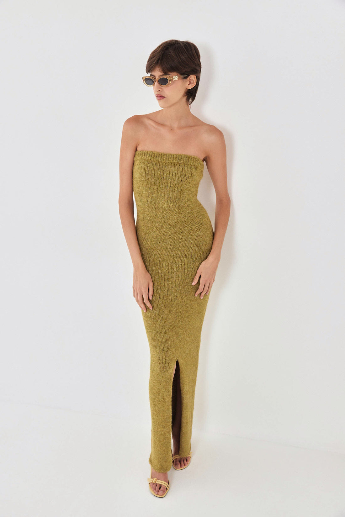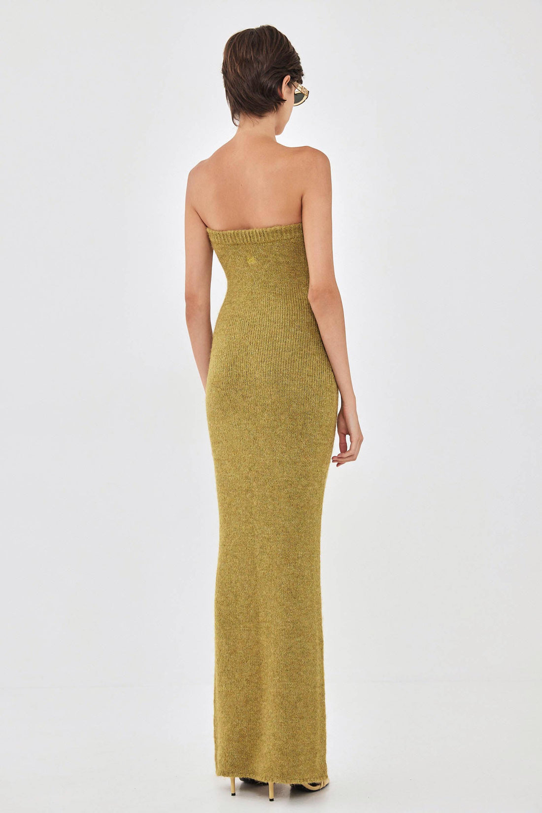 Our new fuzzy strapless maxi dress is the ultimate must have this fall. Soft and cozy fabric. Featuring a comfortable and elastic band for a secure fit. Delicate tonal embroidered logo on the back. A sleek, form-fitting silhouette that flatters the body. Front slit. Style it with our matching fuzzy cardigan, our classy quilted clutch and a pair of our oval sunnies for an effortless fall look.