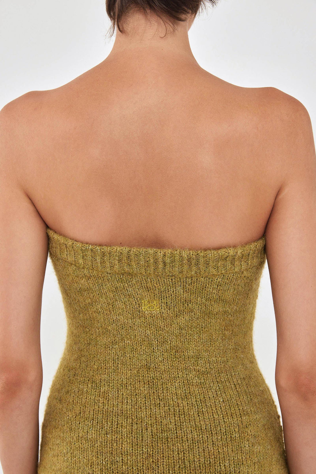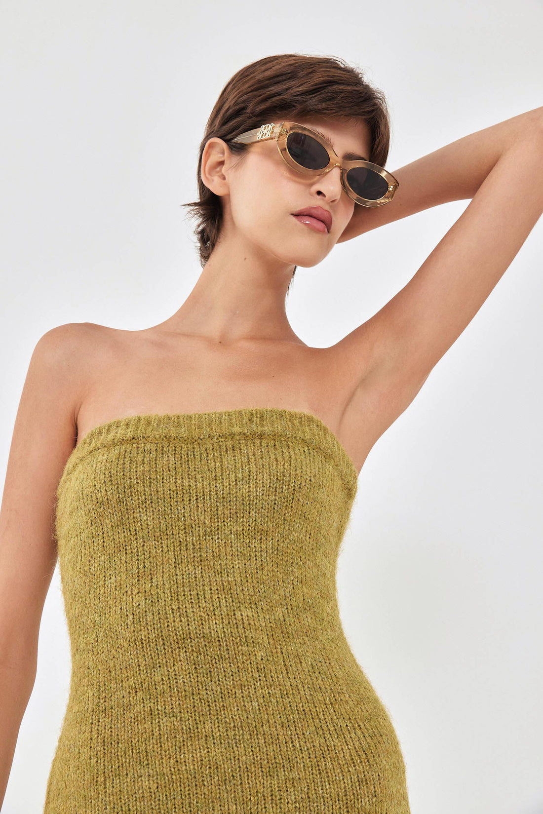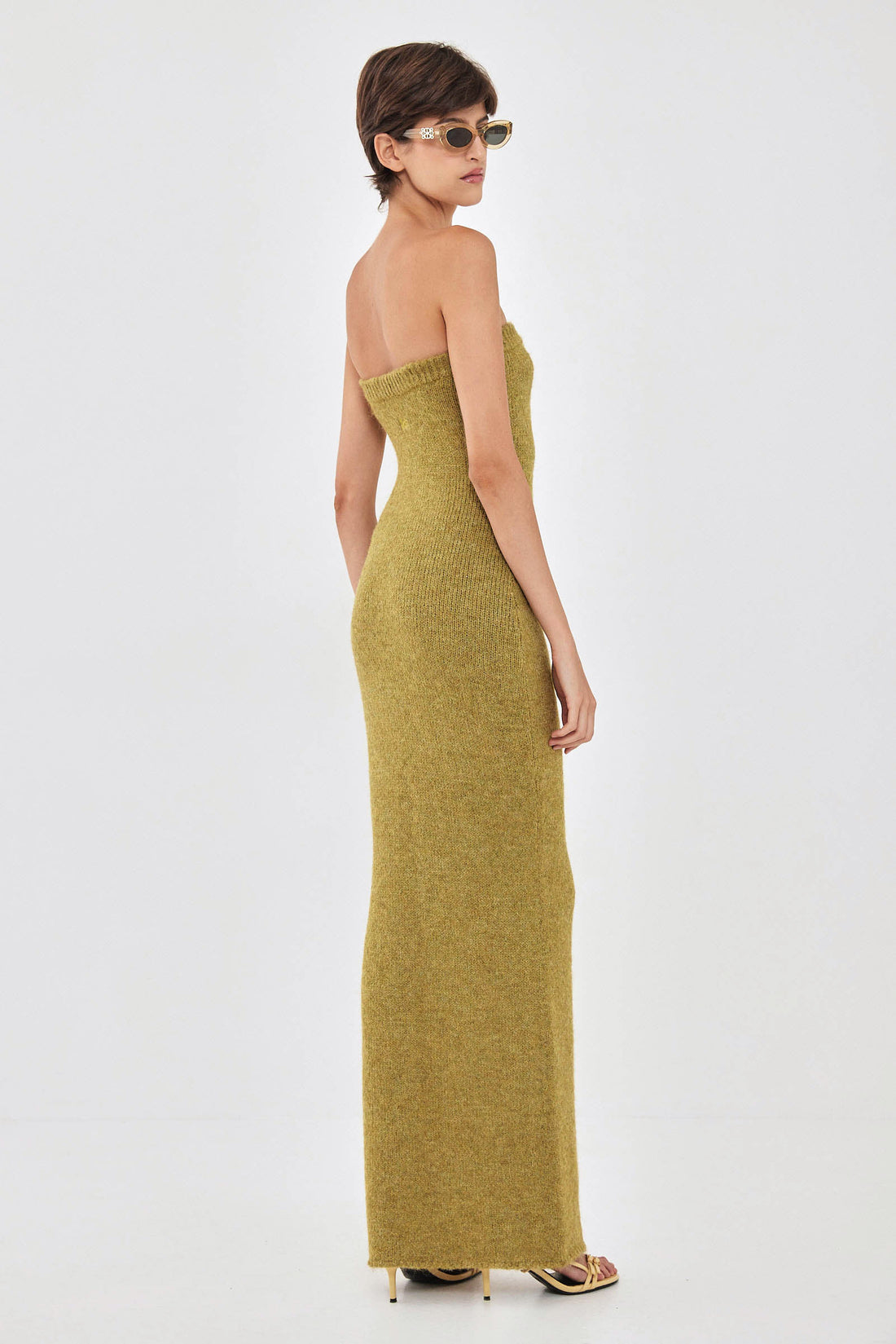 Our new fuzzy strapless maxi dress is the ultimate must have this fall. Soft and cozy fabric. Featuring a comfortable and elastic band for a secure fit. Delicate tonal embroidered logo on the back. A sleek, form-fitting silhouette that flatters the body. Front slit. Style it with our matching fuzzy cardigan, our classy quilted clutch and a pair of our oval sunnies for an effortless fall look.