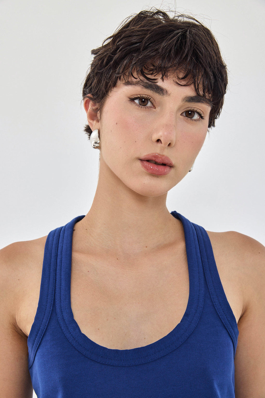 Your new favorite deep scooped tank top. Made from a thick heavy cotton composition, maintaining its shape all day long. Embroidered tonal logo detailing at the front of the shirt, just above the waistline. Racer silhouette at the back. Style it with the drill cotton maxi skirt, a belt to cinch the waist and golden accessories to tie the whole look together.