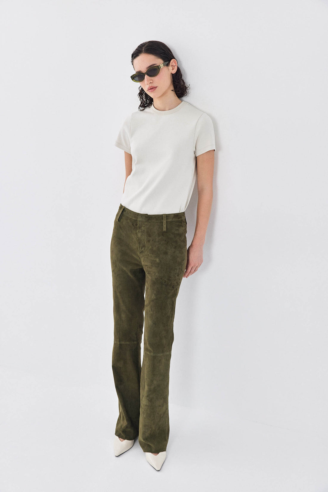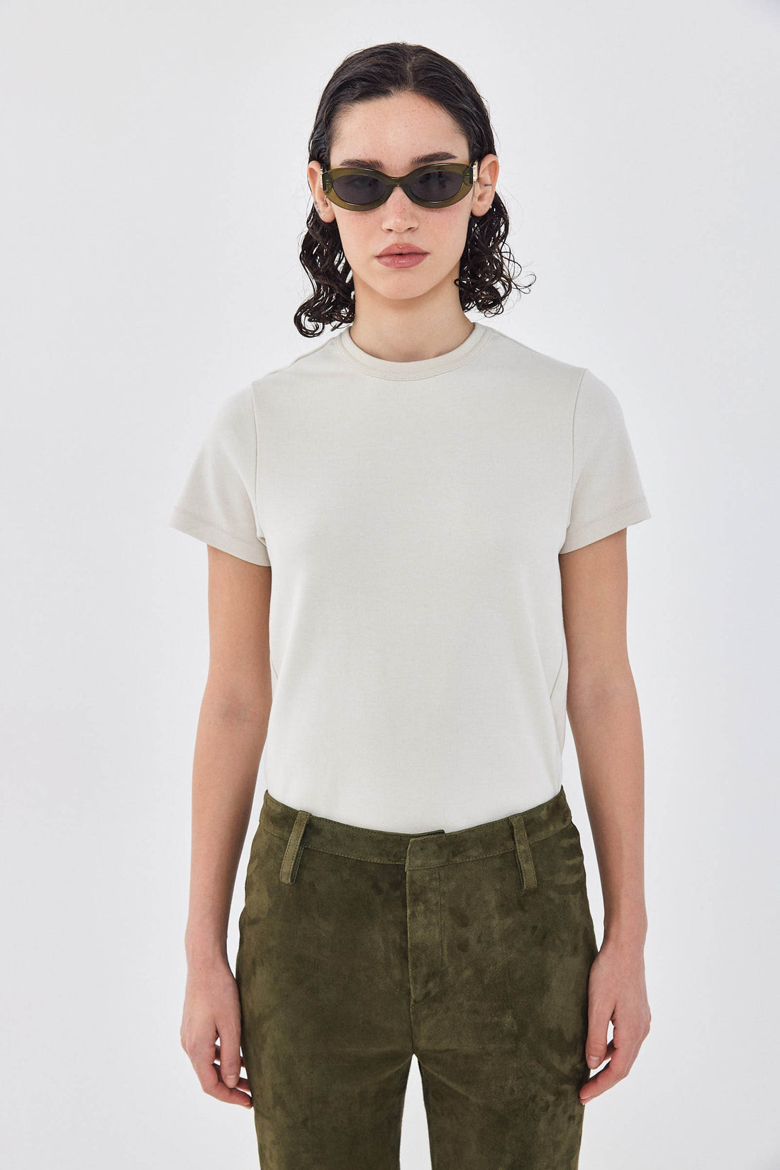 The ultimate classic t shirt. Short sleeve crewneck T shirt. Made from thick heavy cotton. Features an embroidered tonal logo at the back. Style it with hot suede pants, a genuine leather belt and a pair of your favorite sunnies for a chic autumn look.