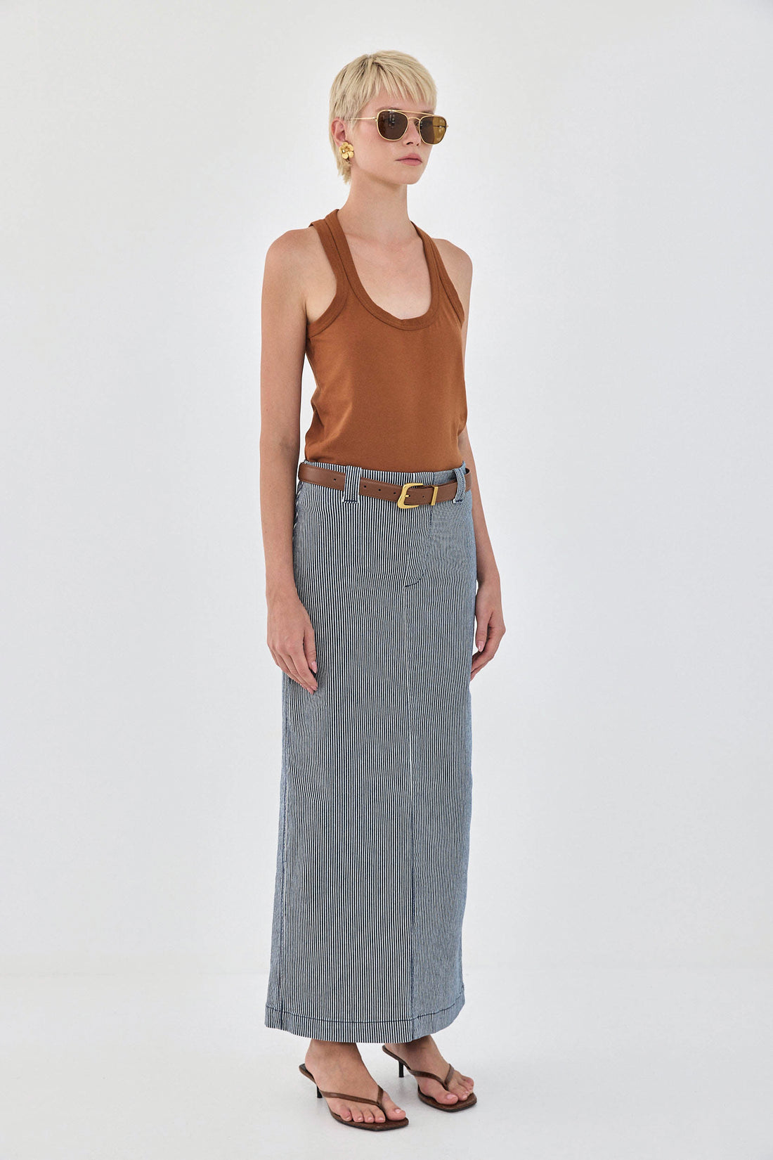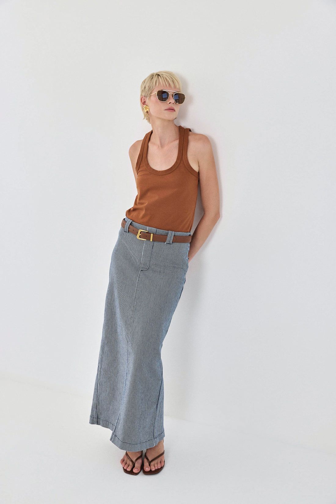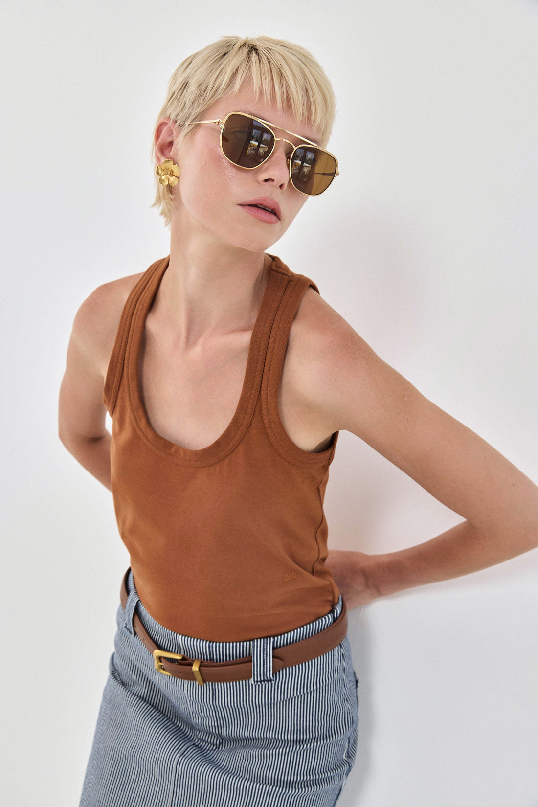 Your new favorite deep scooped tank top. Made from a thick heavy cotton composition, maintaining its shape all day long. Embroidered tonal logo detailing at the front of the shirt, just above the waistline. Racer silhouette at the back. Style it with the drill cotton maxi skirt, a belt to cinch the waist and golden accessories to tie the whole look together.