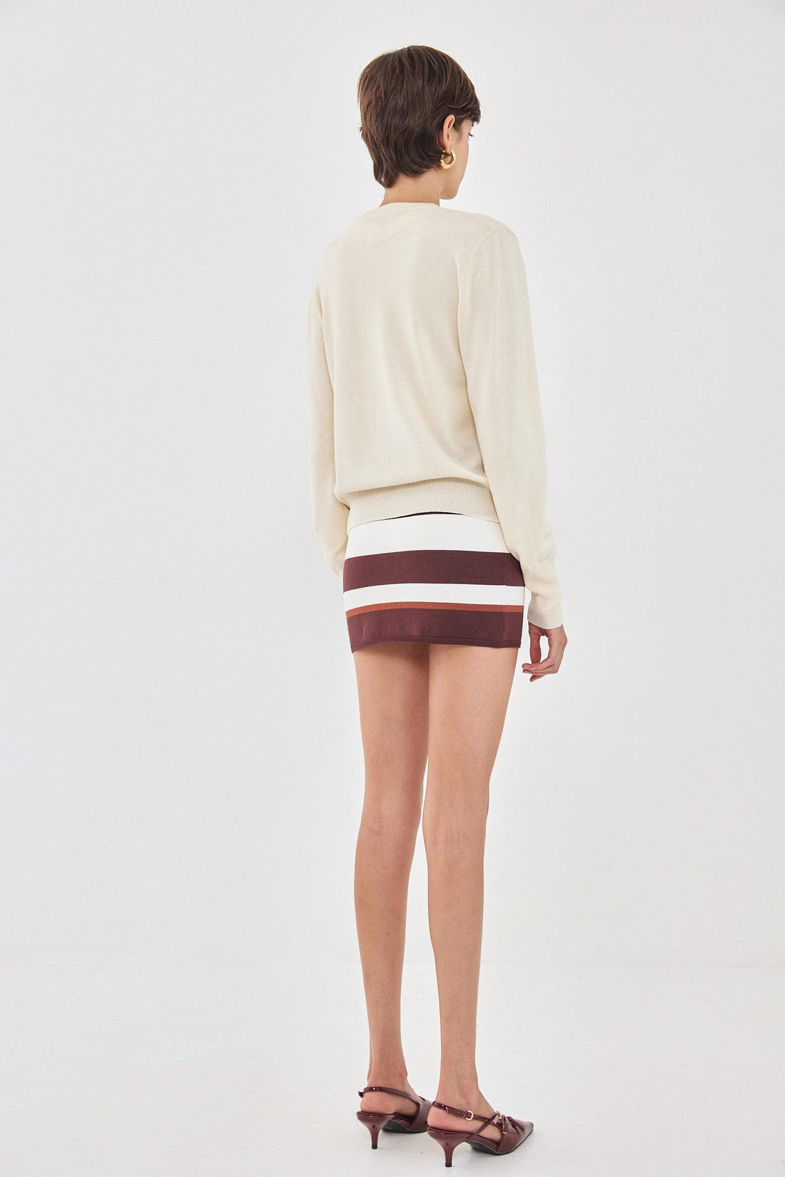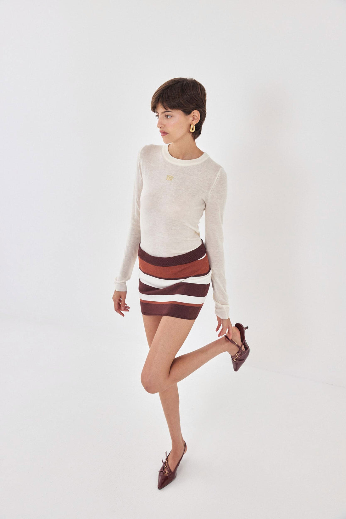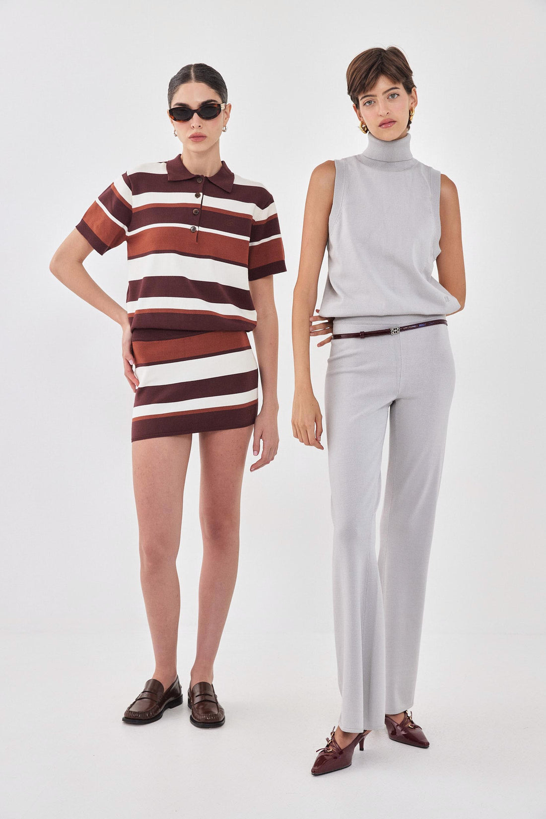 This striped knit skirt will transport you to a chic, retro-inspired getaway. Designed to sit comfortably on the waist with a ribbed-finish elastic waistband for an extra grip. Made from a soft, cozy, fully fashioned luxurious fabric, it features warm vertical stripes and an delicate embroidered logo. Mid waist. Style it with a matching short sleeved polo and our cat eyed ginger brown sunnies for classy day to night look.