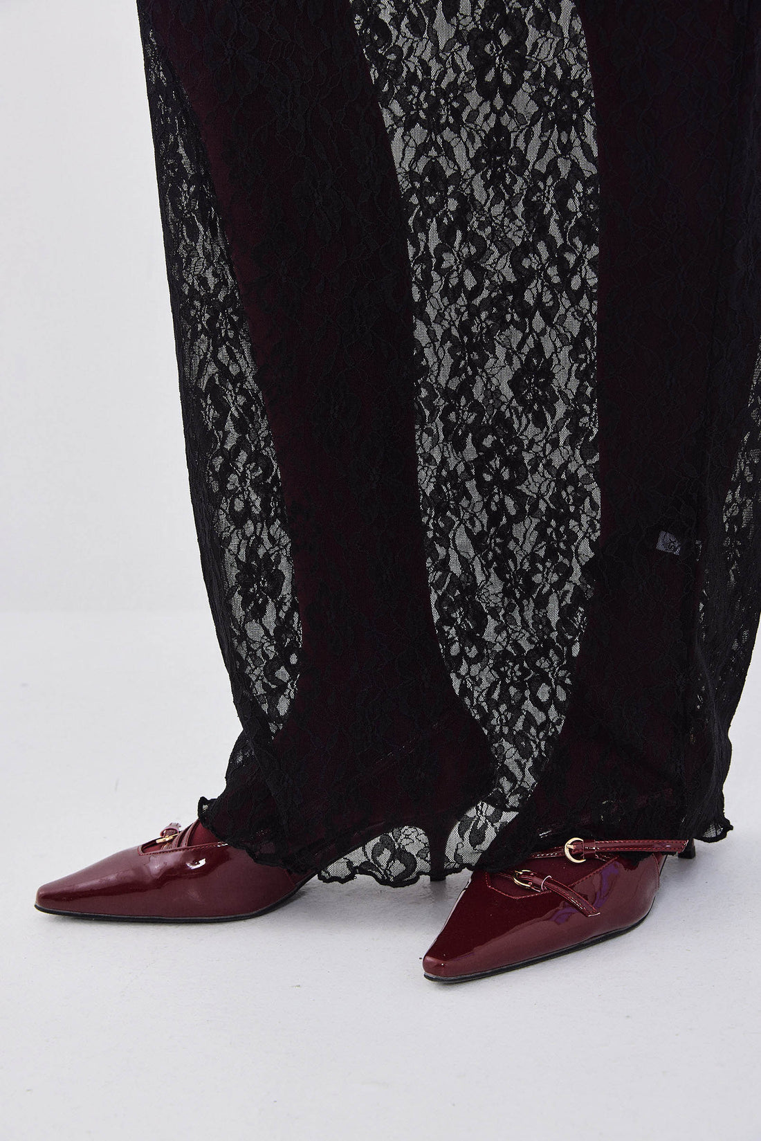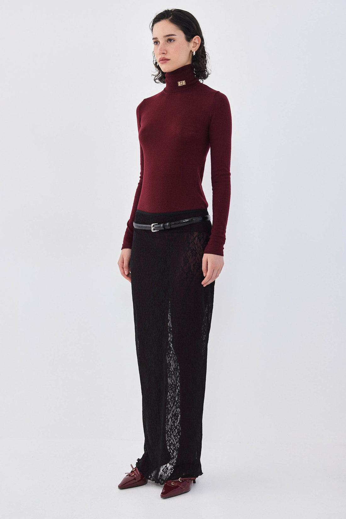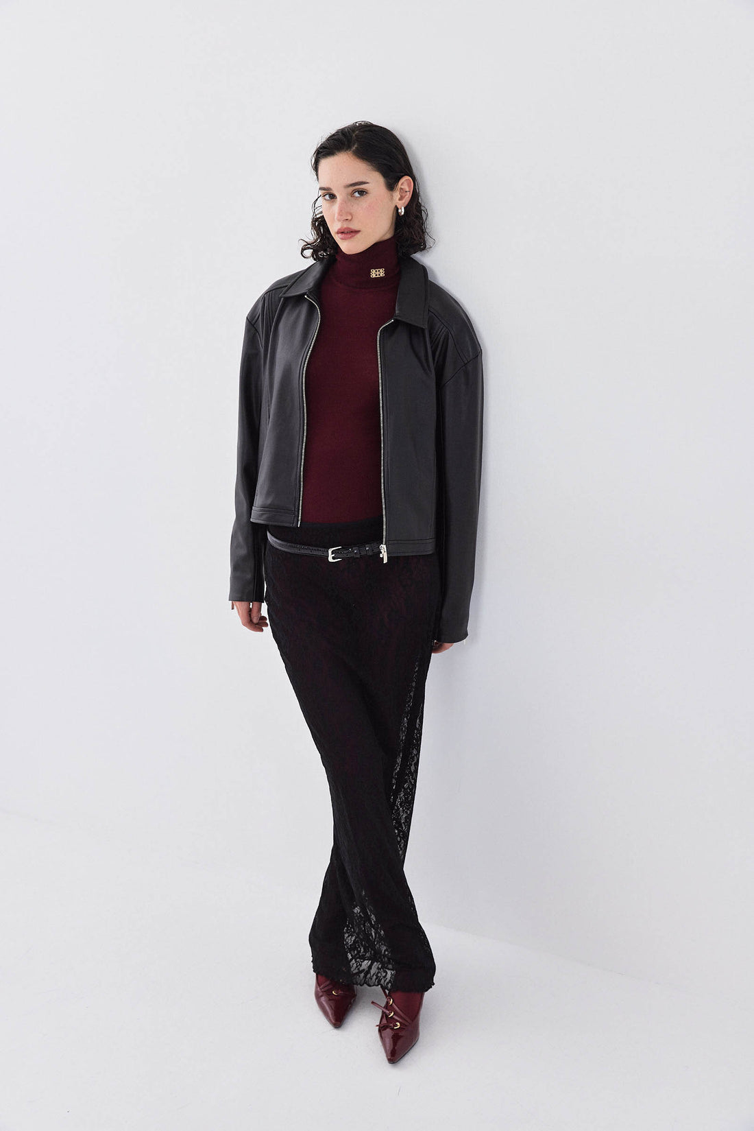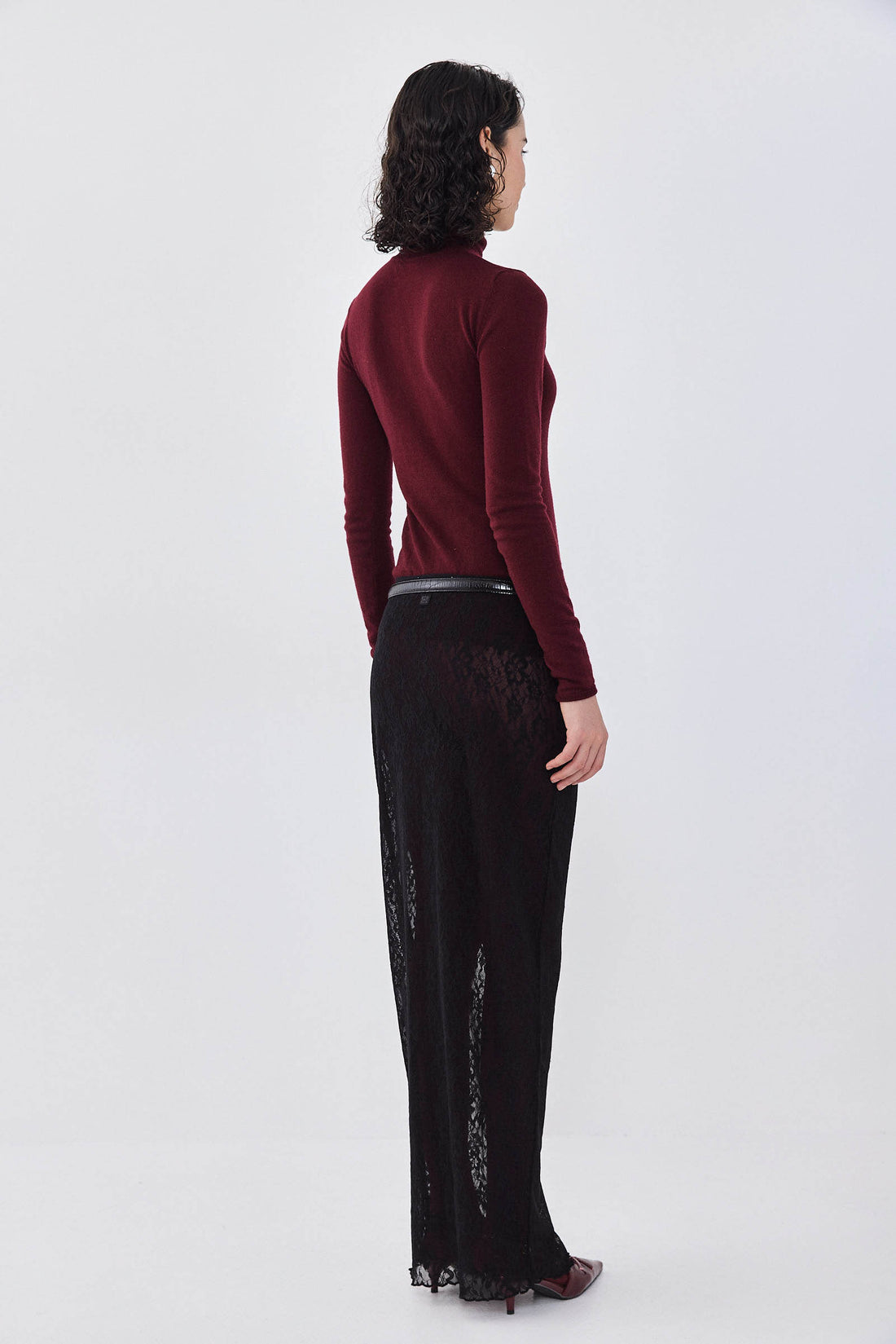 Mid waisted lace skirt. Thin elastic at the waistline. Flower lace. Stretchy fabric which hugs the body. Slight mermaid shape at the bottom. Full length. Style it with lace lingerie underneath, the matching lace long sleeved to, our wide buckle belt and vegan leather bomber on top to tie the look together.