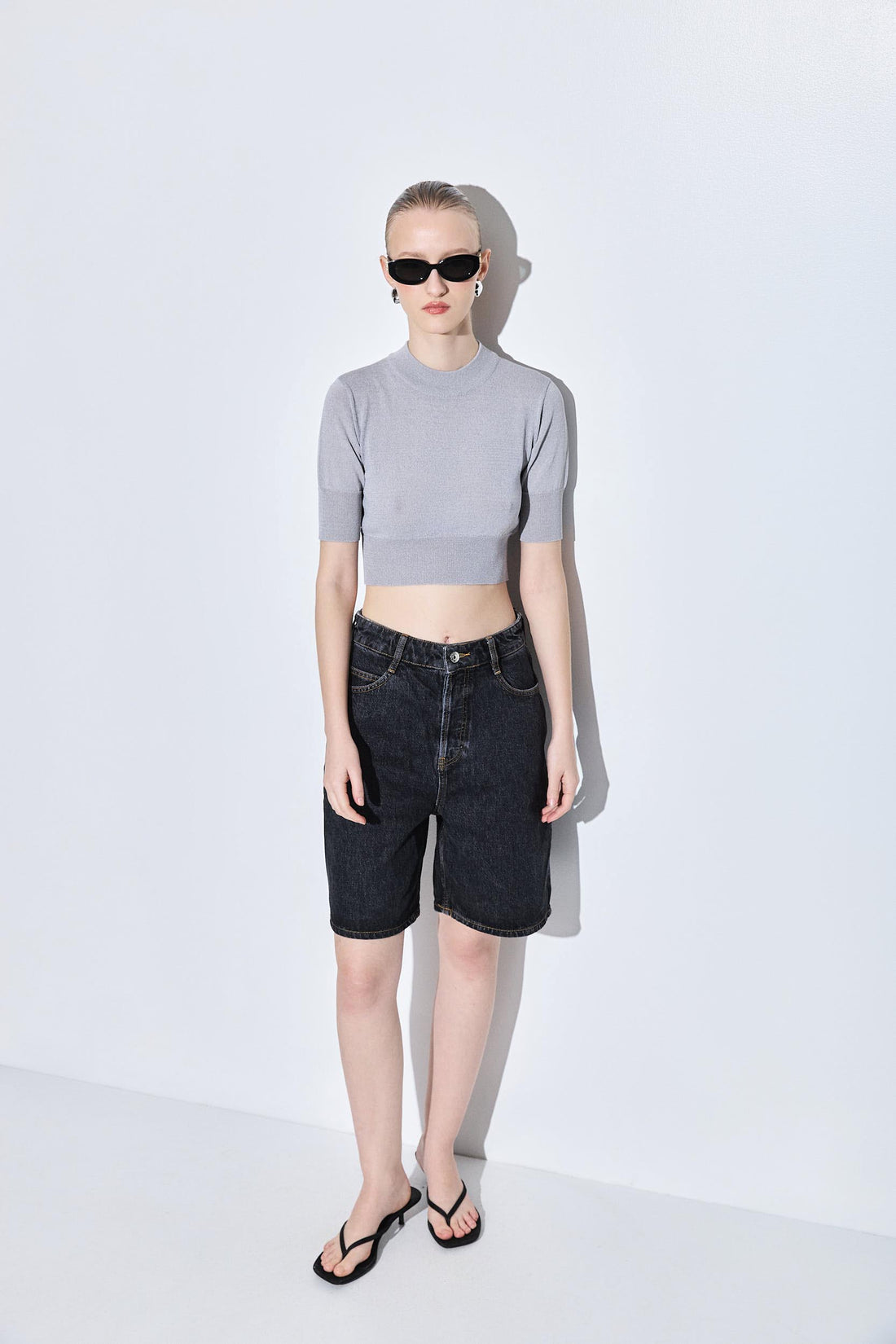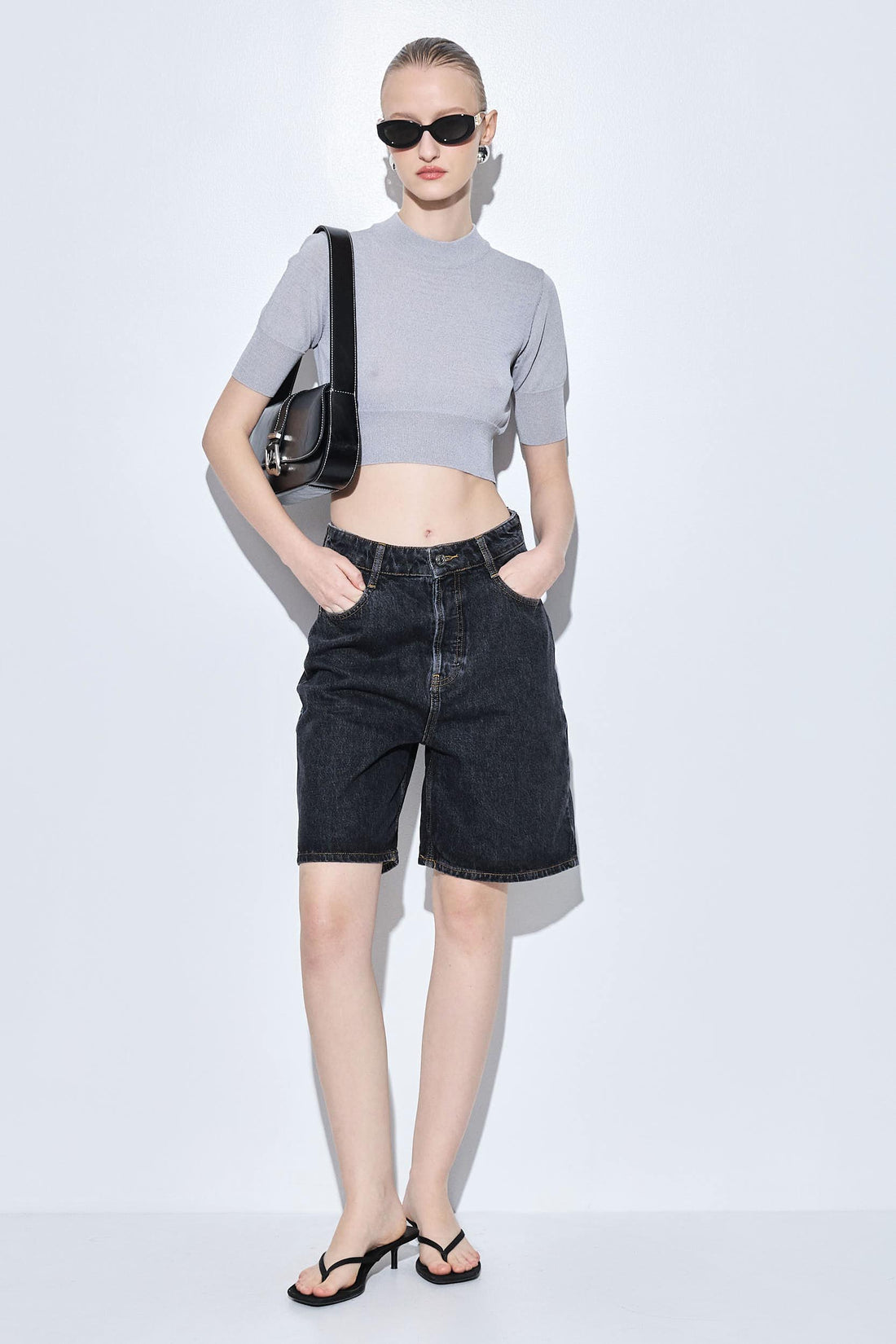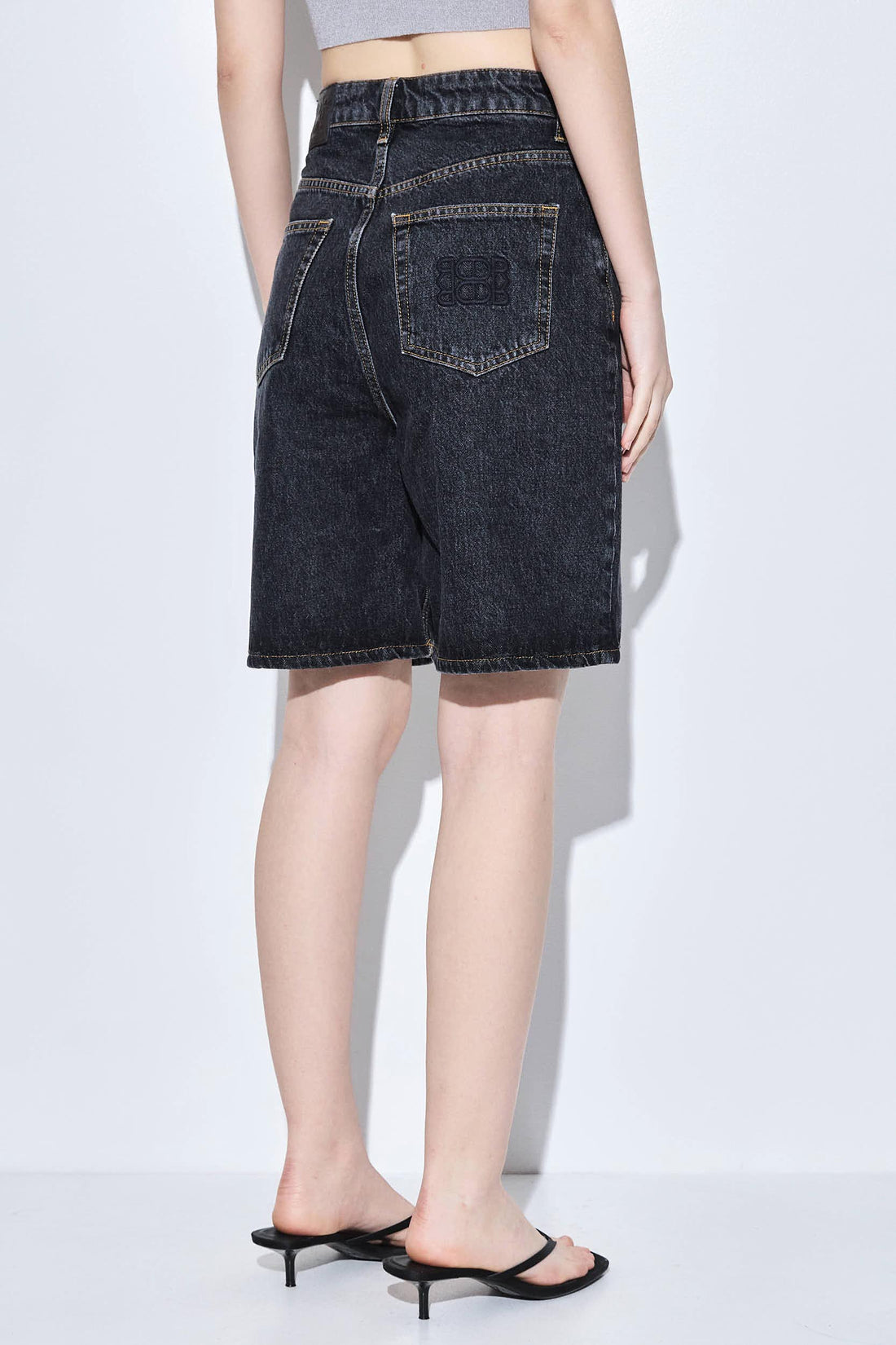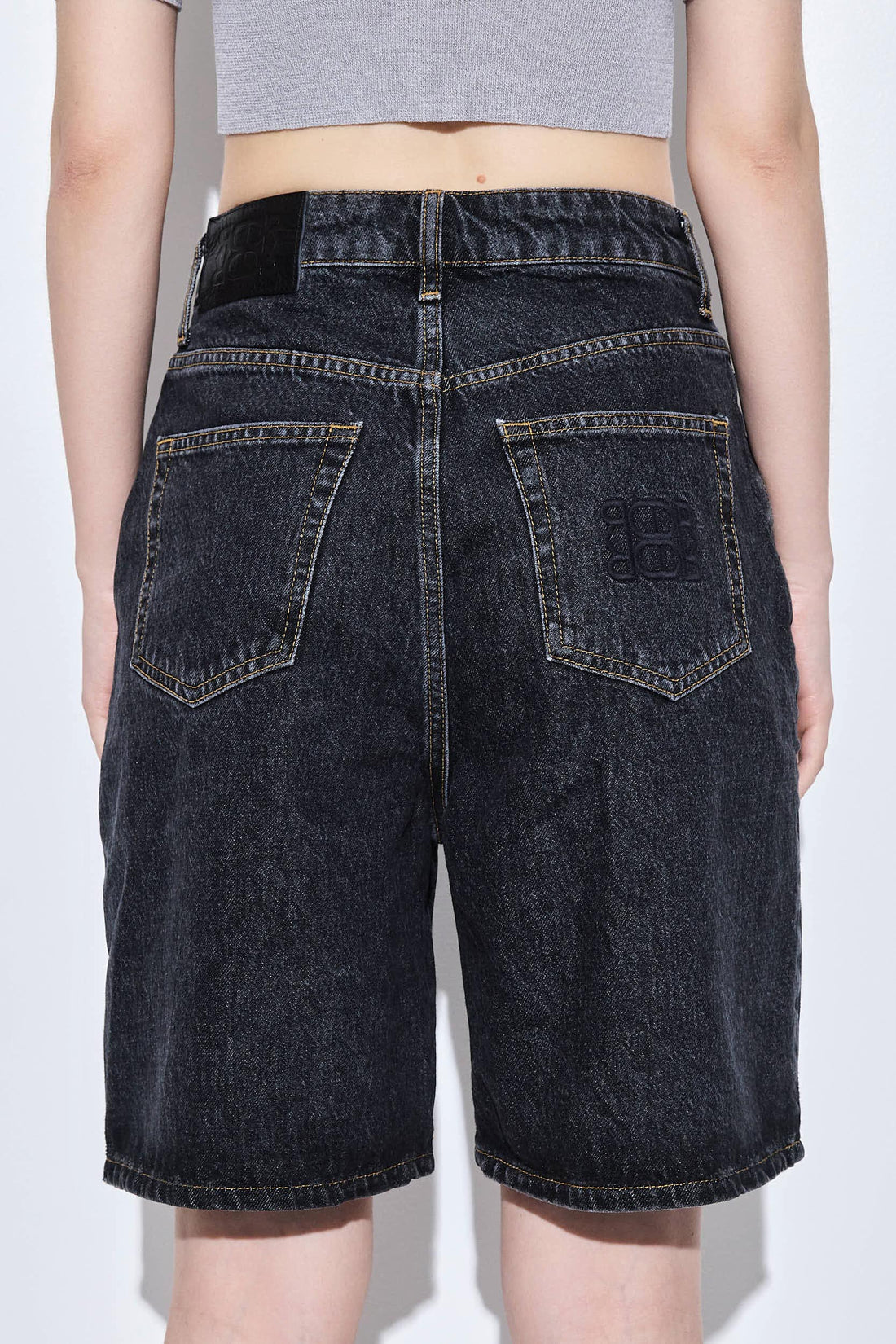 The ultimate summer denim essential. Long Bermuda. Made from 100% premium cotton. Featuring logo embroidery on the back pocket. Wide fit. Belt loops. Two front pockets. Two back pockets. Tonal leather patch with debossed logo detailing. Style it with our classic crewneck T shirt, our signature belt and your favorite daddy blazer for an effortless put together look, perfect for the summer heat.