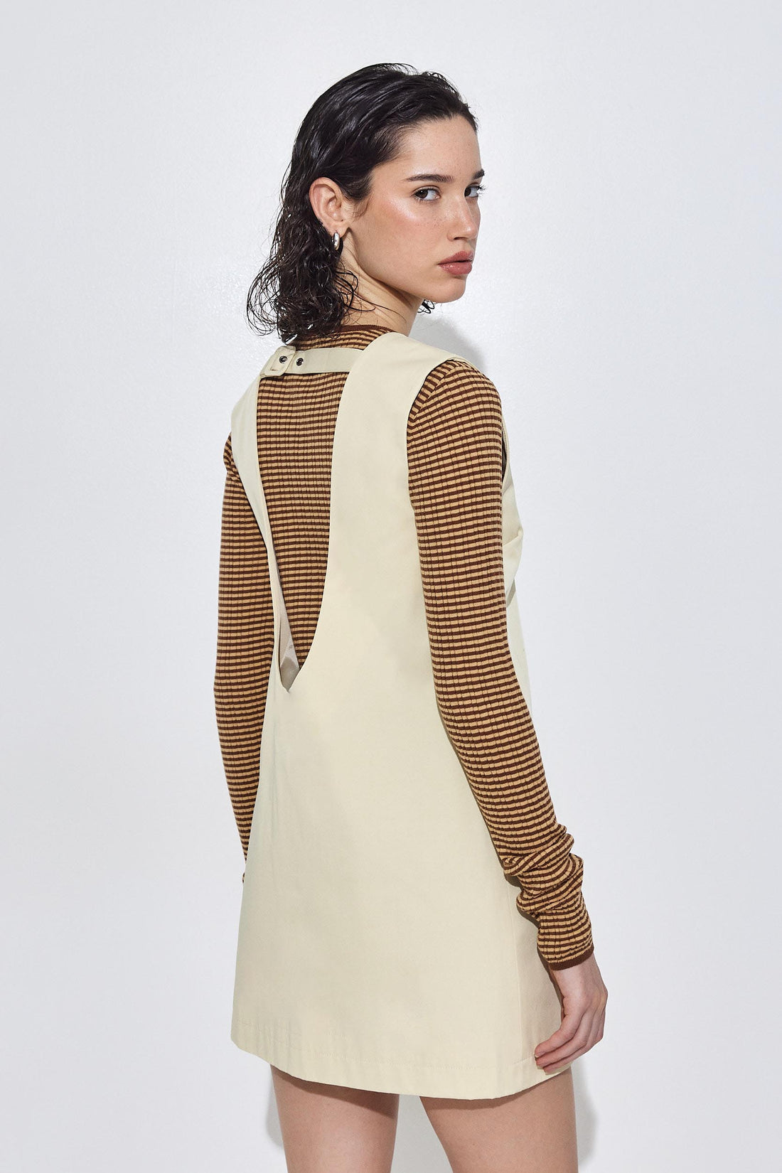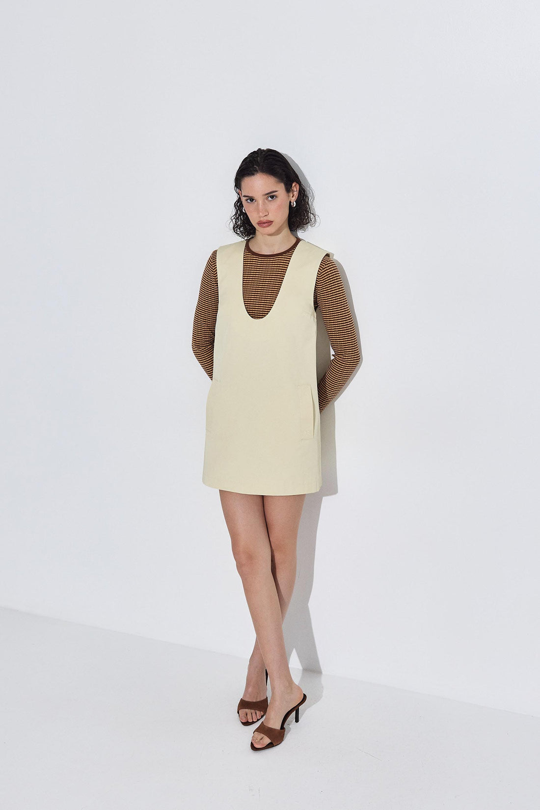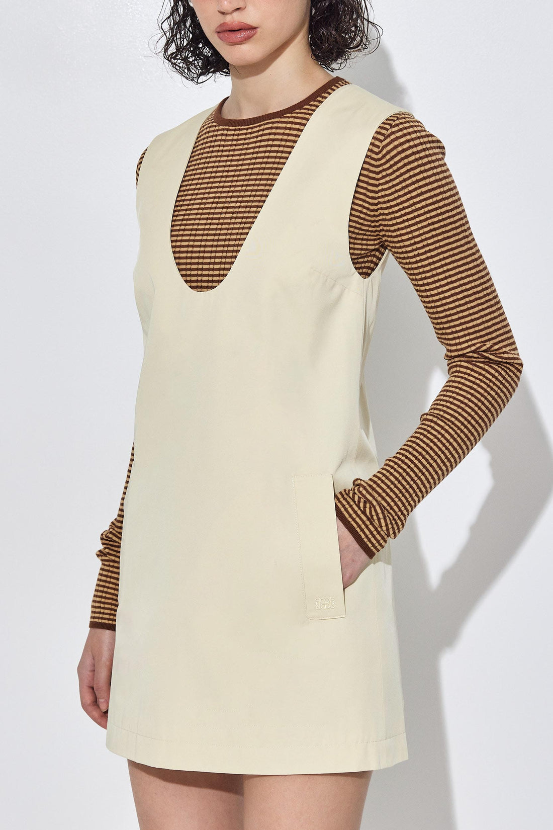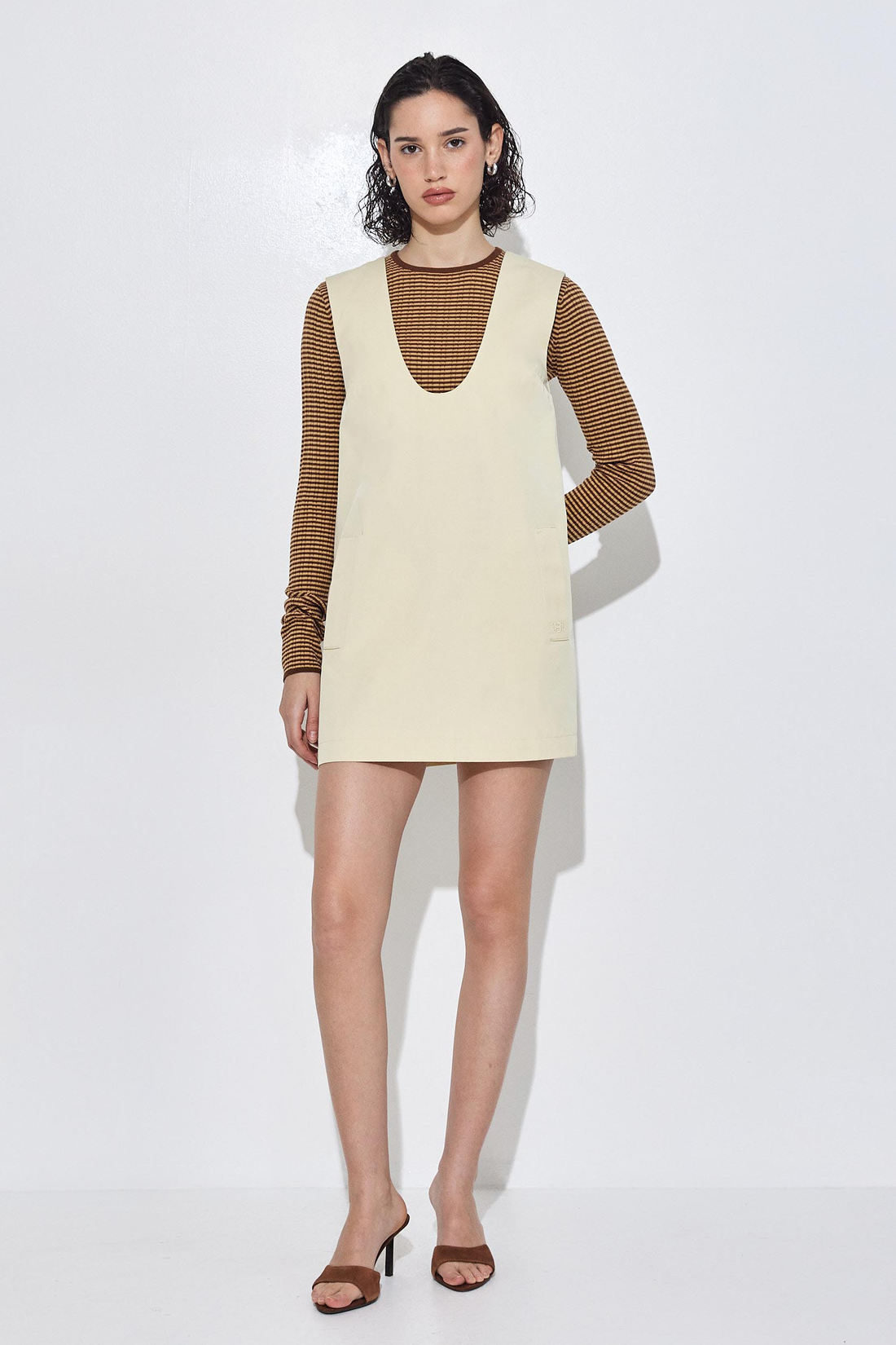 Elevate your day-to-night look with our new mini tank dress. Deep round neckline at both the front and back. Two side pockets. Adjustable Backstrap. Lined. Tonal embroidered logo on the pocket. loose fit. Sleeveless. Style it with our lightweight turtleneck, our vegan leather bomber and a pair of our oval sunglasses for a chic and sophisticated look.