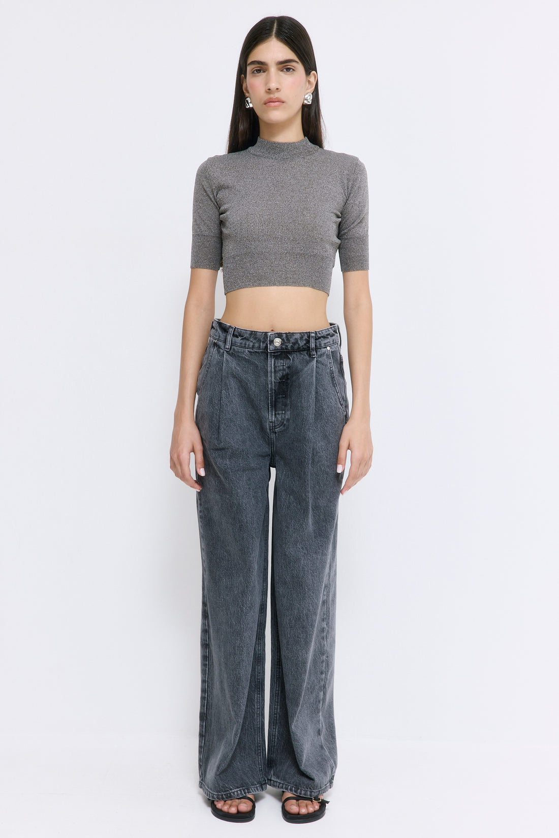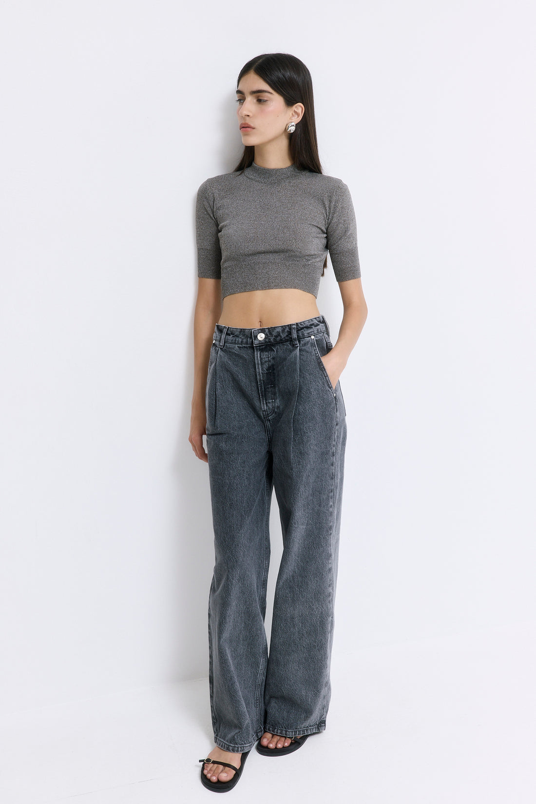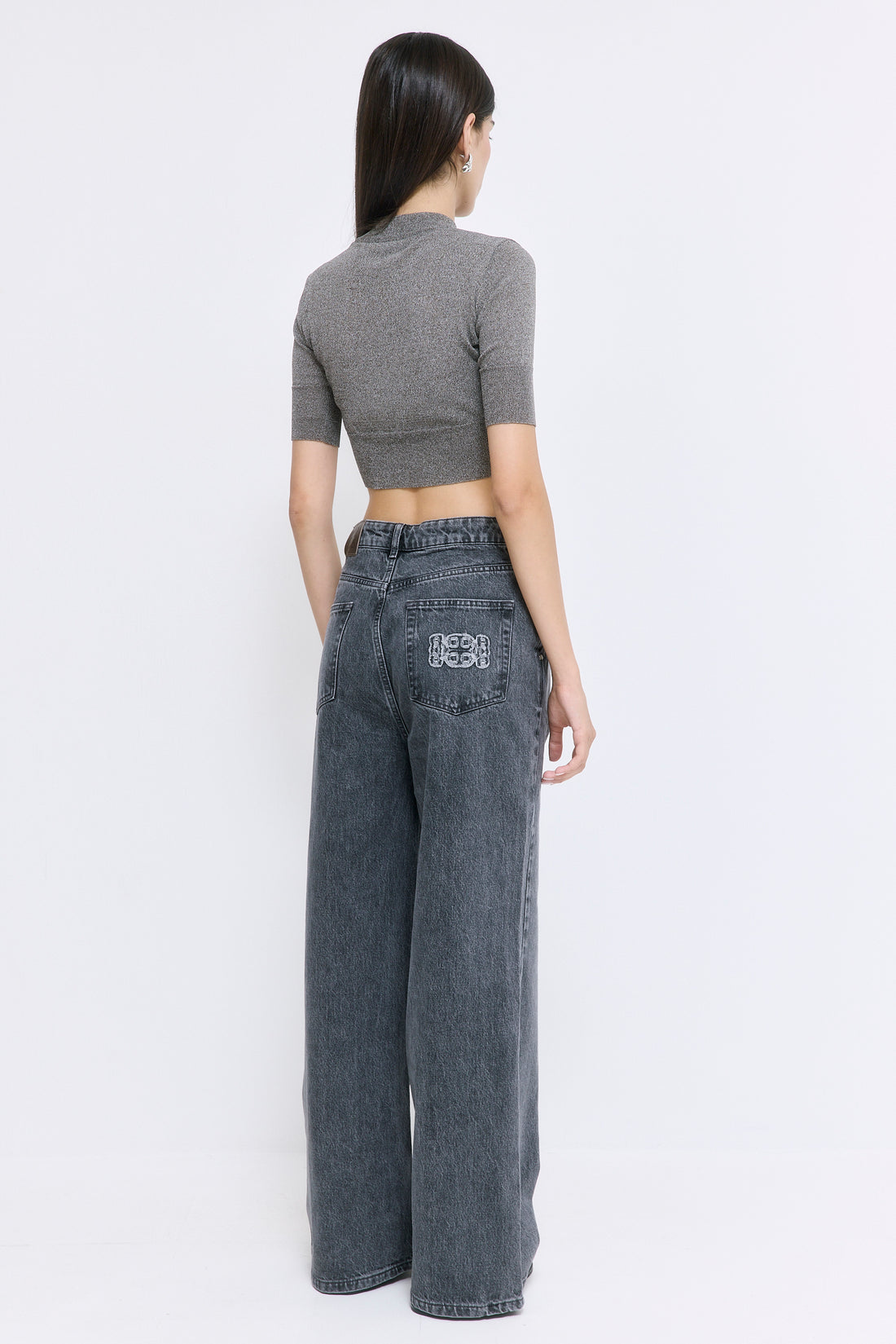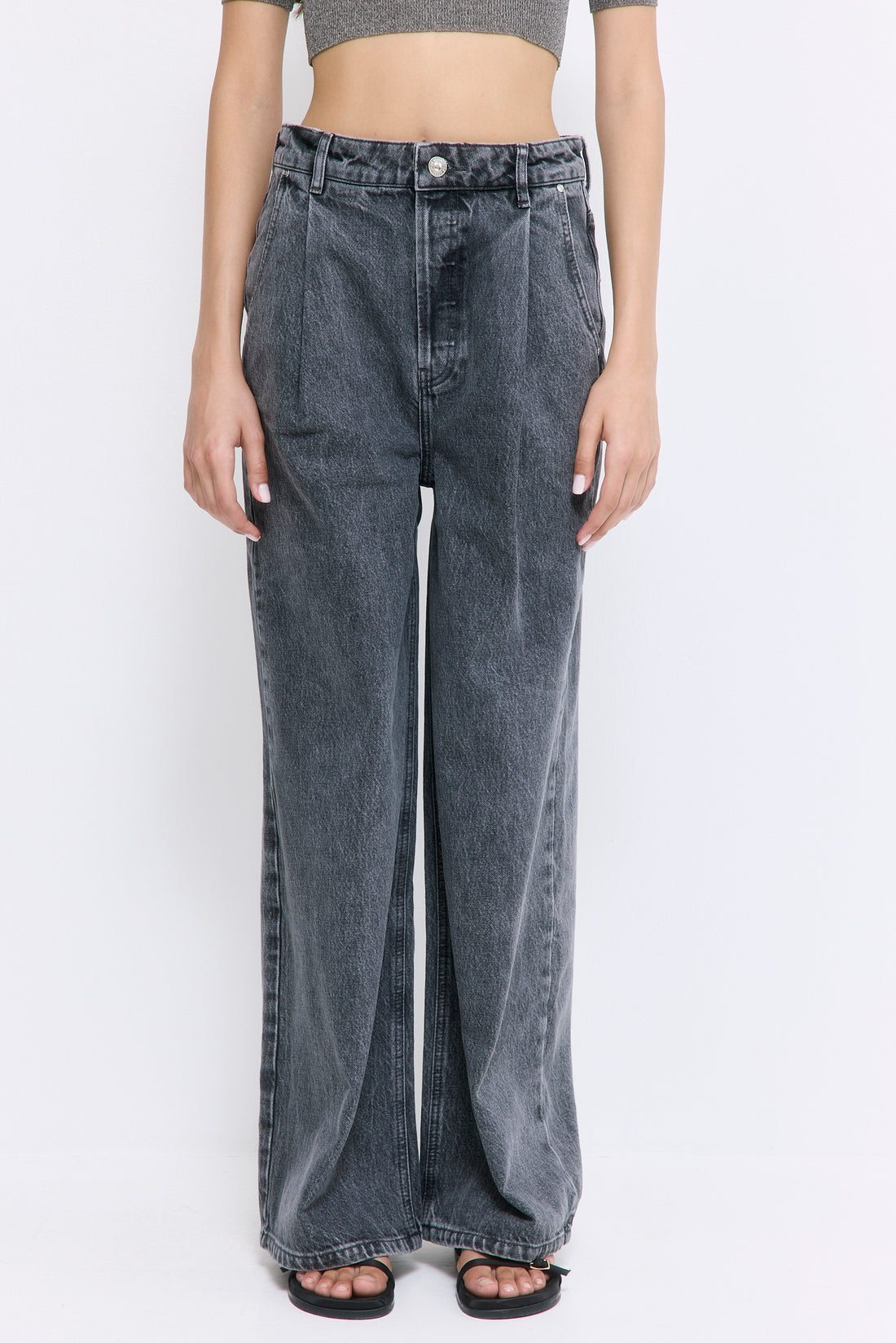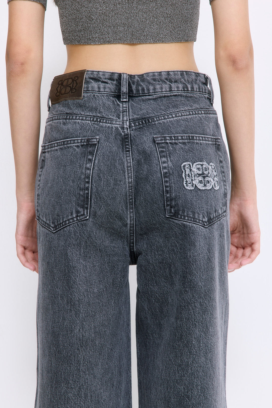 Introducing the newest addition to our signature denim collection. Made from premium 100% rigid cotton. High rise. Super wide fit. Featuring two side pockets. Pleat detailing in the front. Button closure. Full length. Patch print tonal logo detailing at the back pocket. Washed brownish-grey leather patch with debossed logo detailing. Ultra flattering and effortlessly cool. Style it with your favorite summer tank and slides for the perfect everyday look.