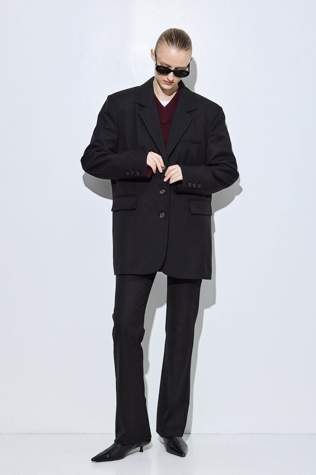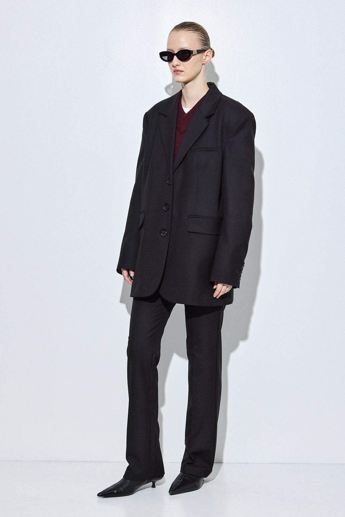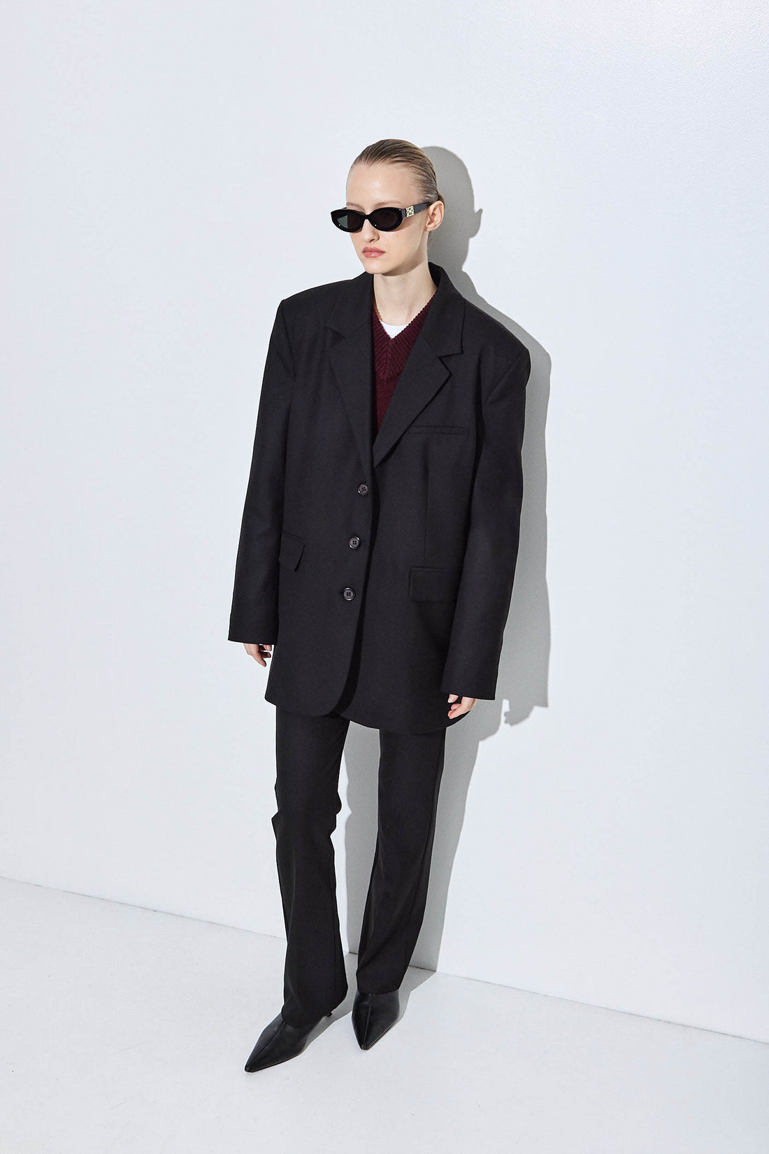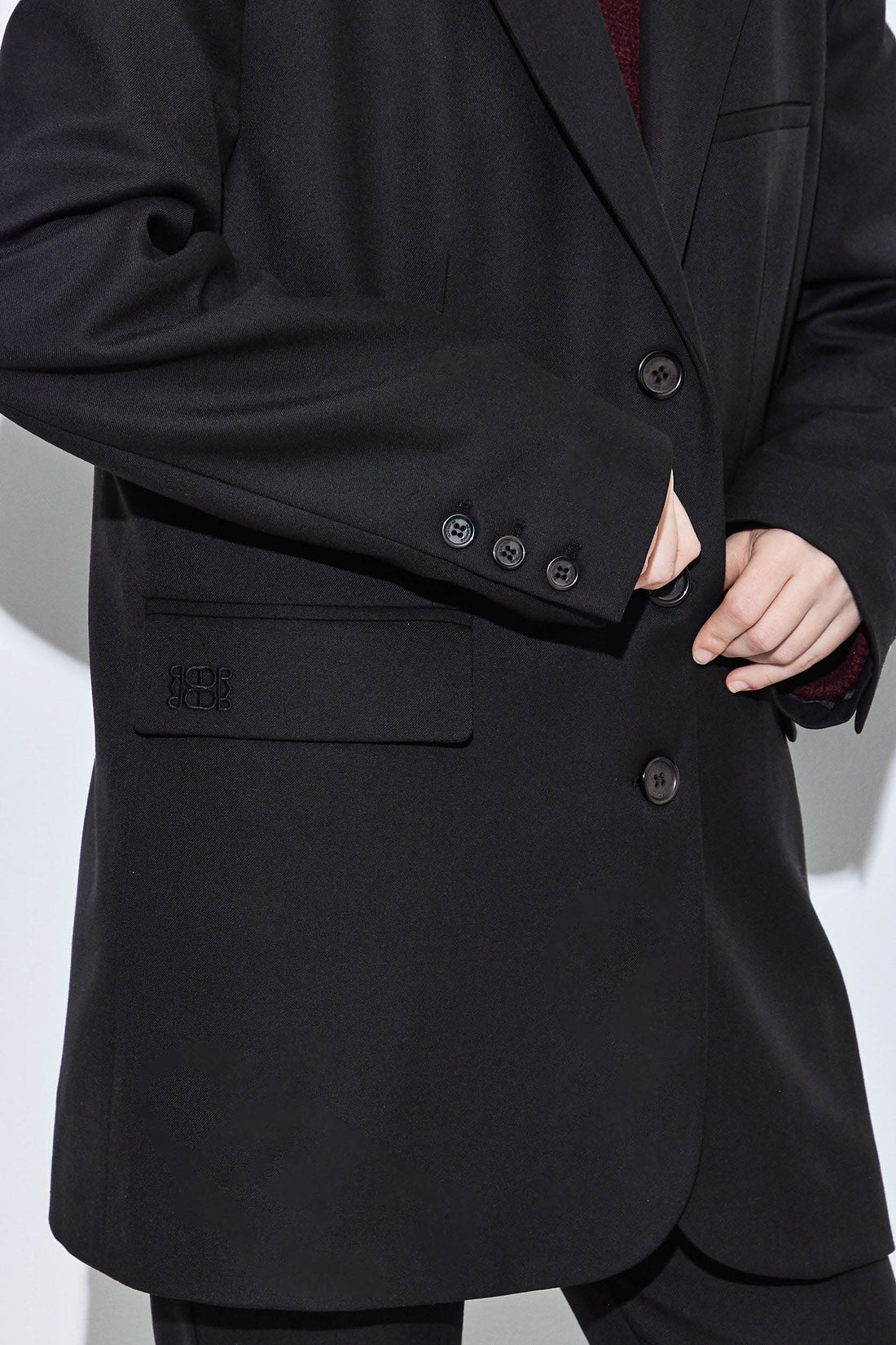Our new tailored daddy blazer is a timeless piece this season in a new luxurious tailored fabric. Oversized fit. Features a lapel collar. Logo engraved button closure. Three front faux pockets. Back slit. Lined. Tonal logo embroidery on the side. Padded shoulders. Style it with our daddy bootcut pants, our lightweight turtleneck and our signature mini logo belt for a day to night classy look.