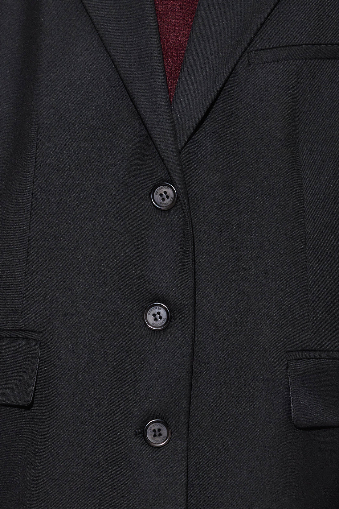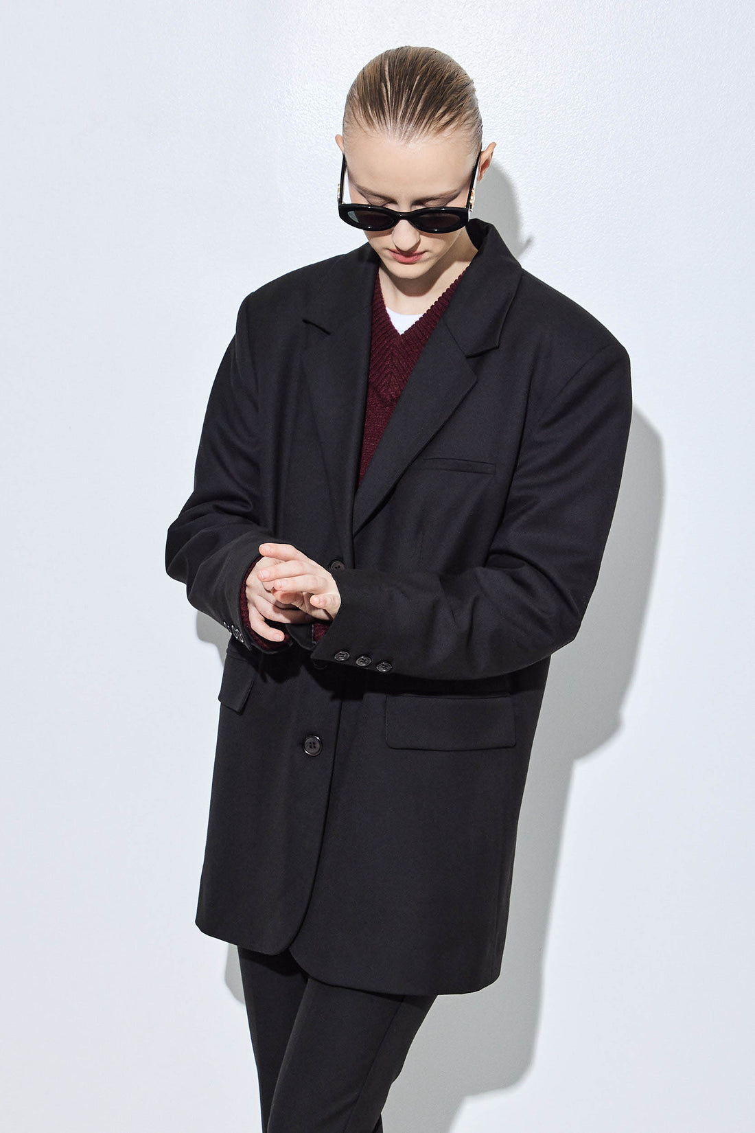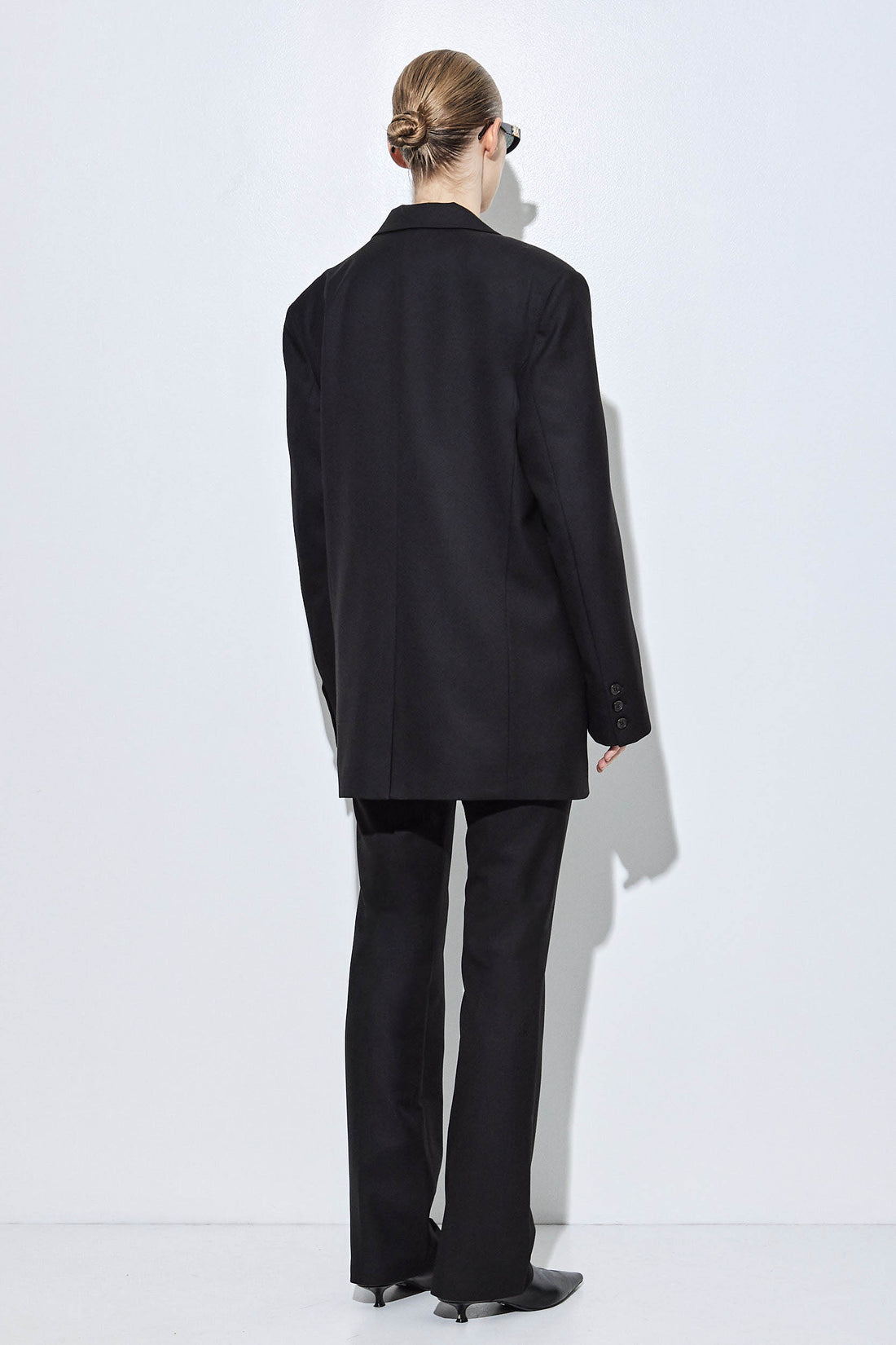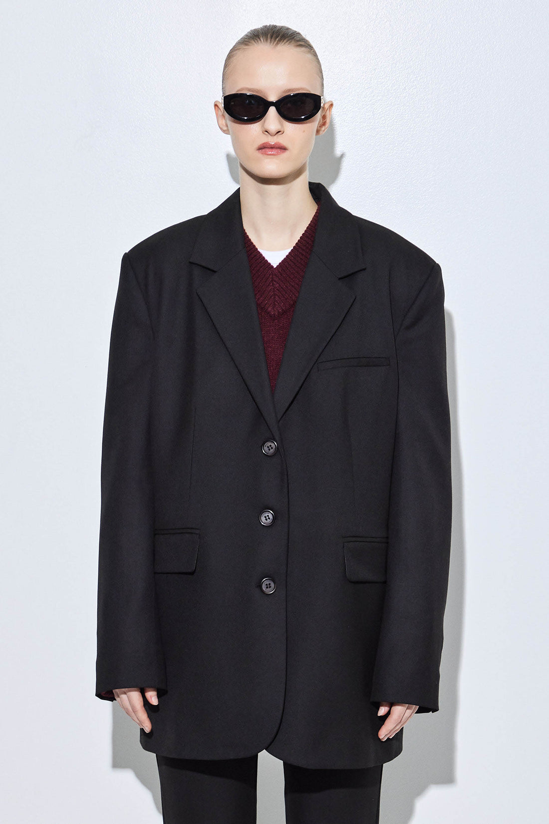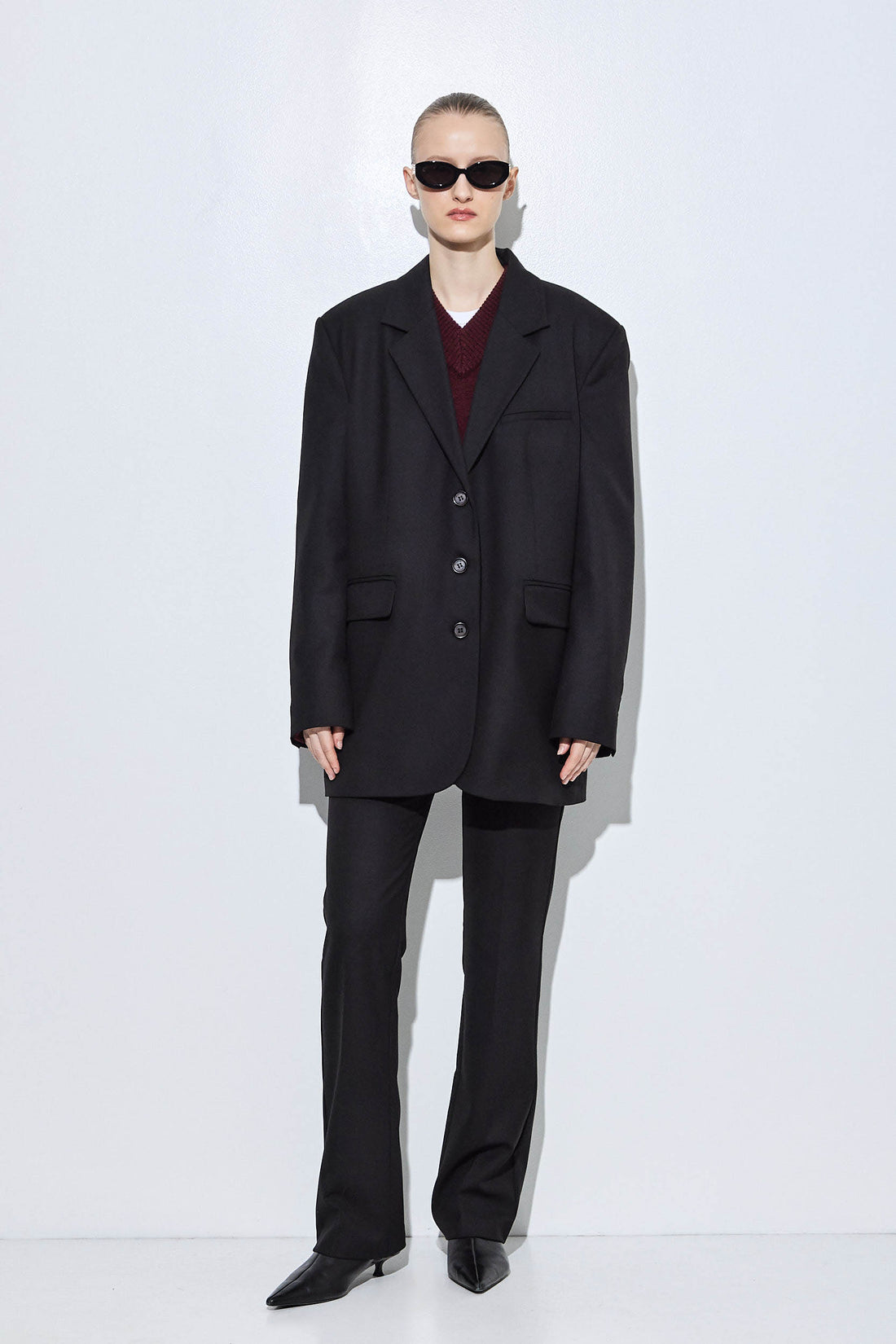 Our new tailored daddy blazer is a timeless piece this season in a new luxurious tailored fabric. Oversized fit. Features a lapel collar. Logo engraved button closure. Three front faux pockets. Back slit. Lined. Tonal logo embroidery on the side. Padded shoulders. Style it with our daddy bootcut pants, our lightweight turtleneck and our signature mini logo belt for a day to night classy look.