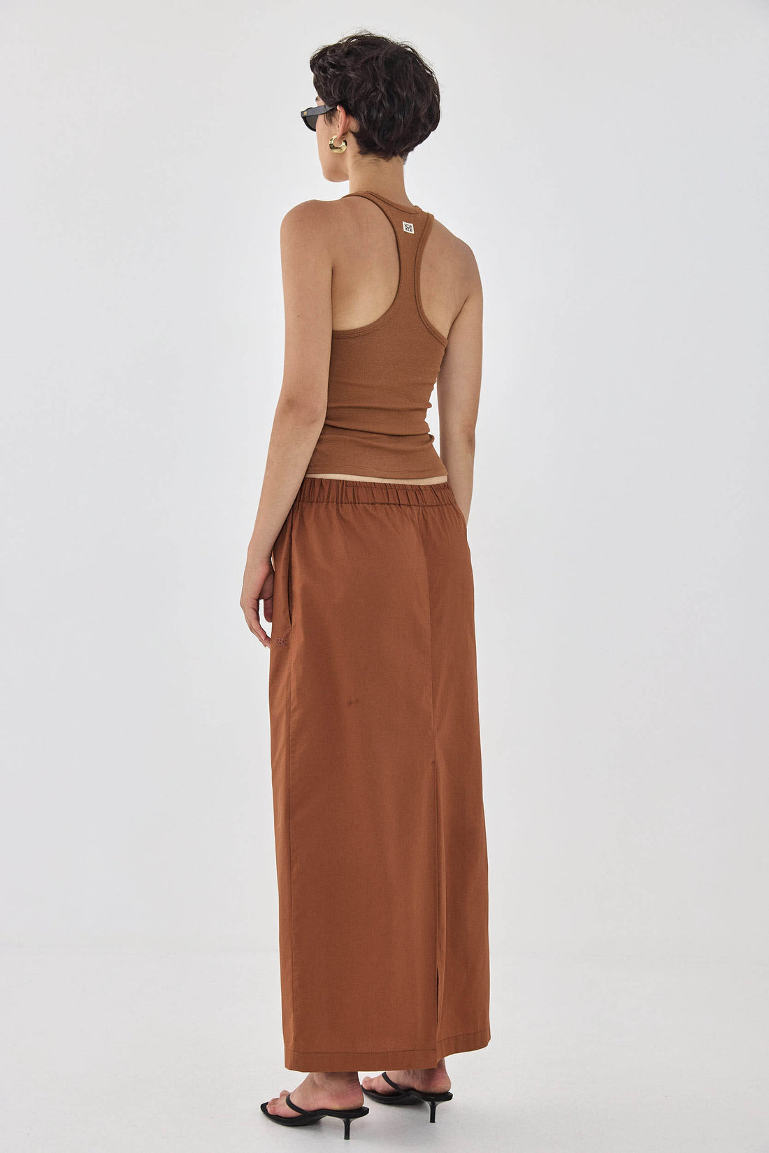 Poplin is this season's most fashionable fabric. A maxi skirt from crispy poplin fabric is an absolute summer wardrobe essential. Low rise. Straight silhouette featuring gathering detailing at the waistline. Elastic waistband with an ultra thin drawstring closure. Maxi length. Back slit. Delicate logo embroidery detailing. Style it with your favorite deep scooped tank top in a matching tone on tone, natural colored sandals and a large tote bag for a look that's hard to compete.