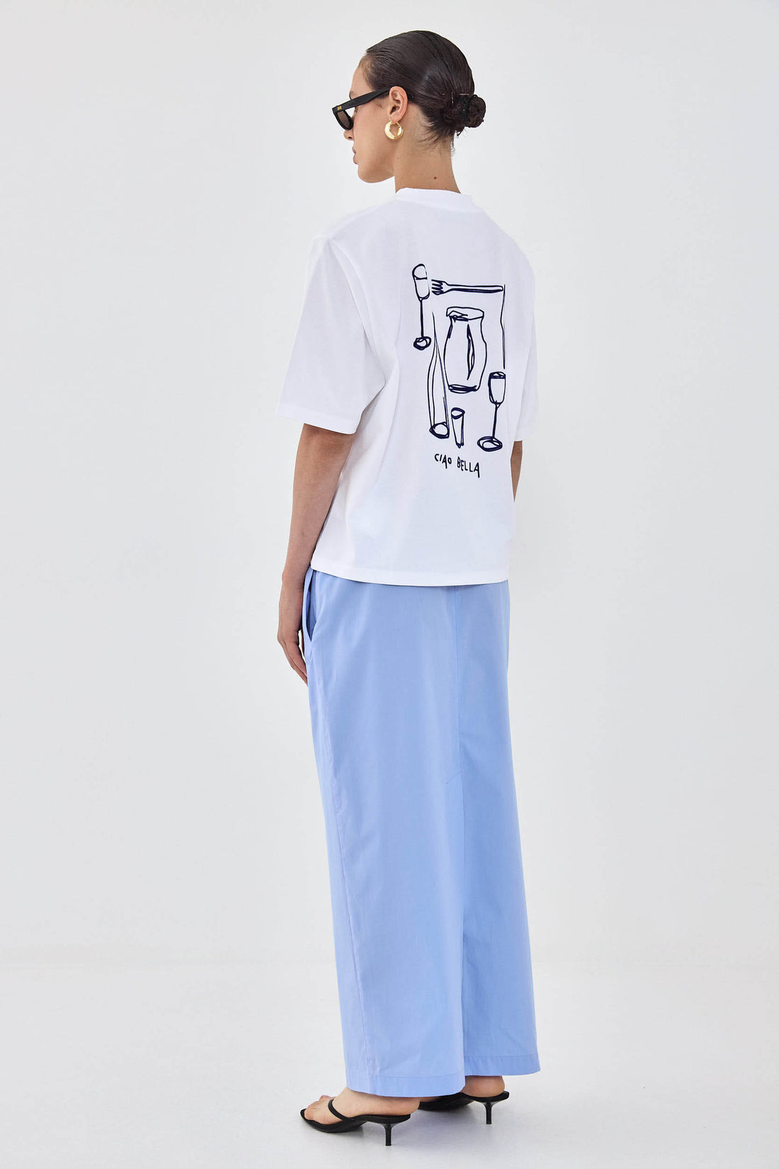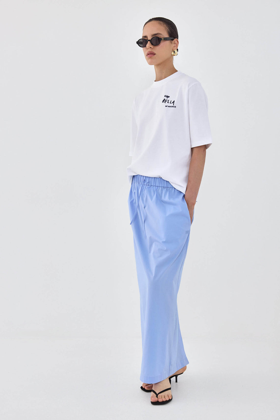 Poplin is this season's most fashionable fabric. A maxi skirt from crispy poplin fabric is an absolute summer wardrobe essential. Low rise. Straight silhouette featuring gathering detailing at the waistline. Elastic waistband with an ultra thin drawstring closure. Maxi length. Back slit. Delicate logo embroidery detailing. Style it with your favorite deep scooped tank top in a matching tone on tone, natural colored sandals and a large tote bag for a look that's hard to compete.