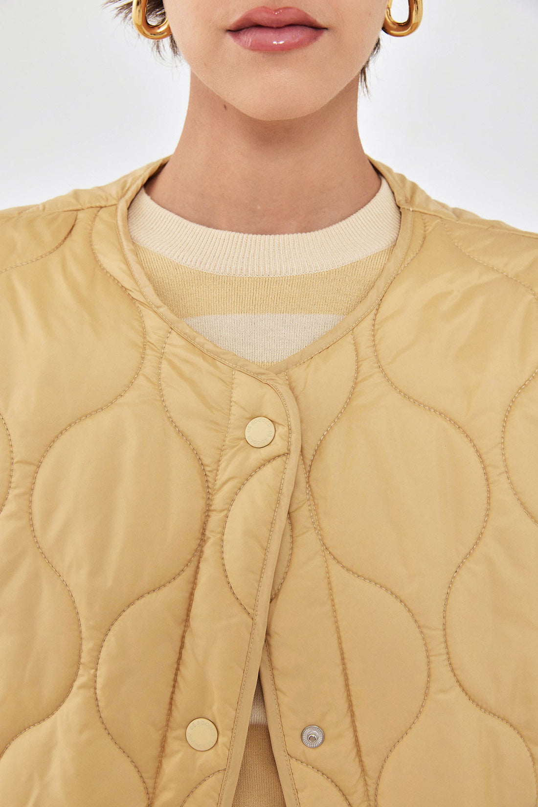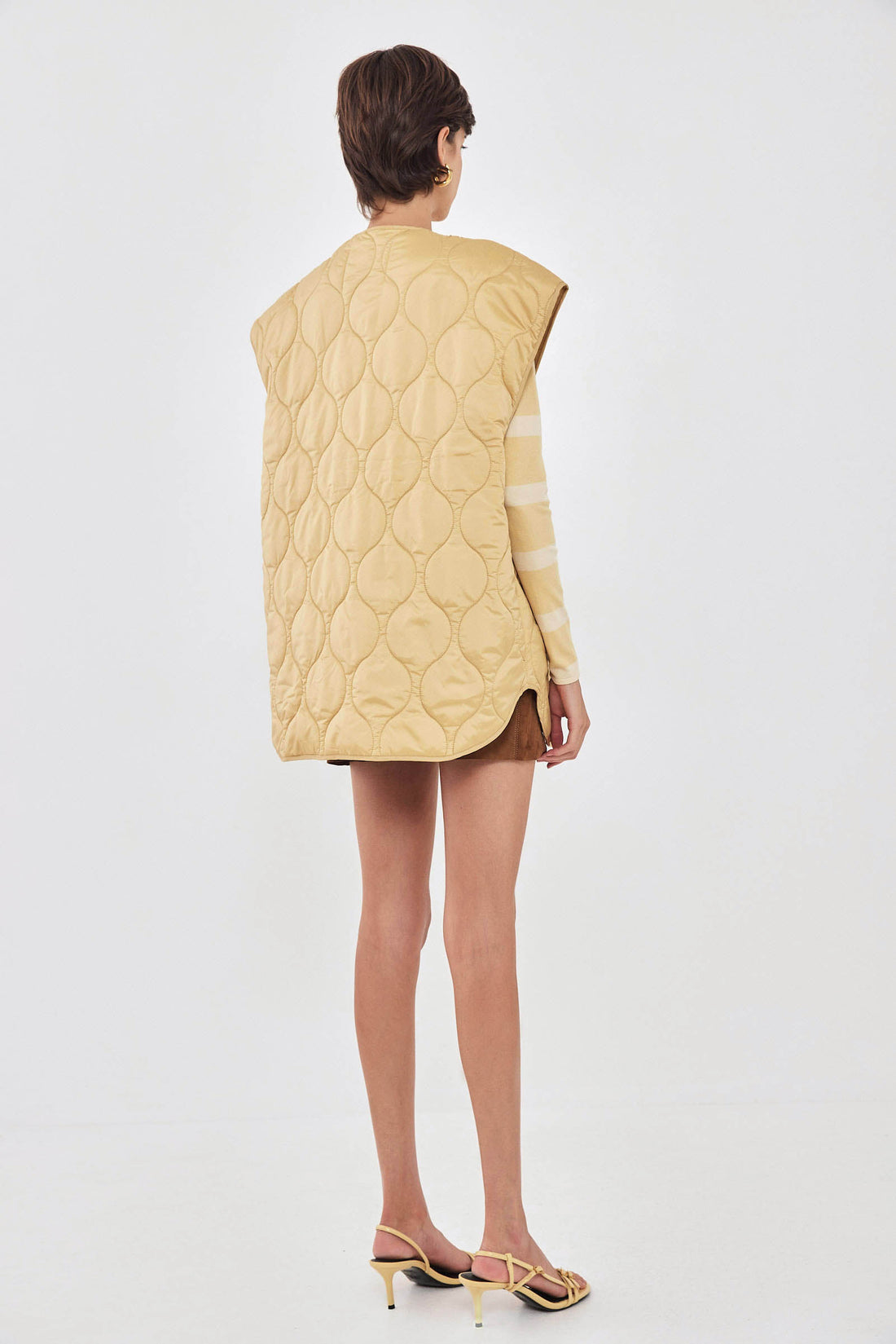 An ultra-chic addition to your winter wardrobe. Quilted lightweight vest. Onion quilt pattern. Unlined. Features engraved snap buttons closure. Oversize fit. Two front pockets with a snap button closure. Luxurious tonal metal logo placed on the side pocket. Style it over our ribbed long sleeved top, a pair of denim and our matching quilted bag for a cool everyday look.