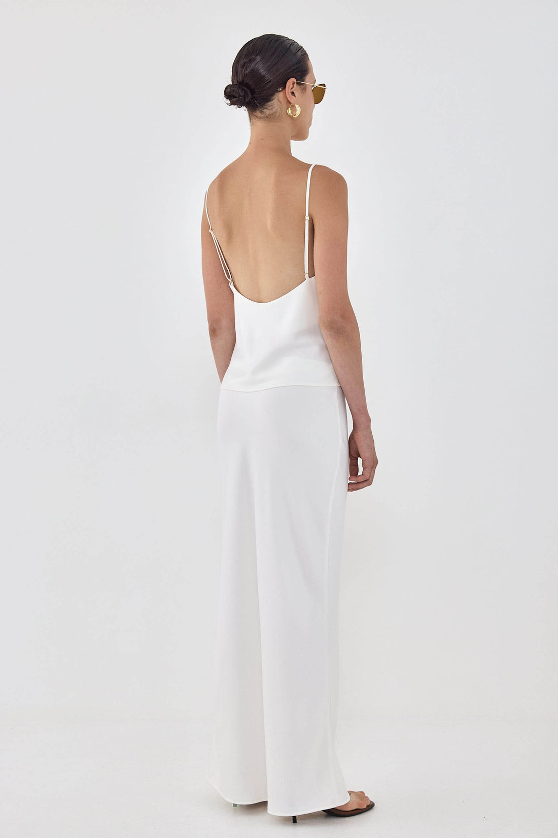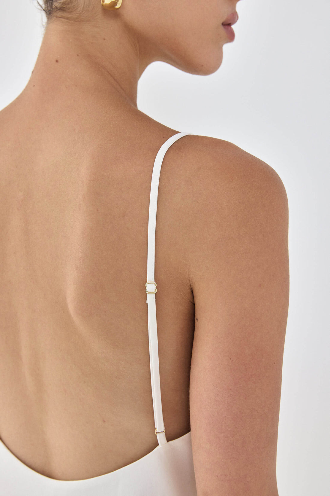 The most perfect day to night top. Deep v neck. Upside down teardrop opening at the front. Golden logo pendant detailing. Delicate thin adjustable straps. Features an inner layer for extra coverage. Lustrous fabric that doesn't crease. Style it with your favorite denim, sandals and shoulder bag for a chic Parisian look.