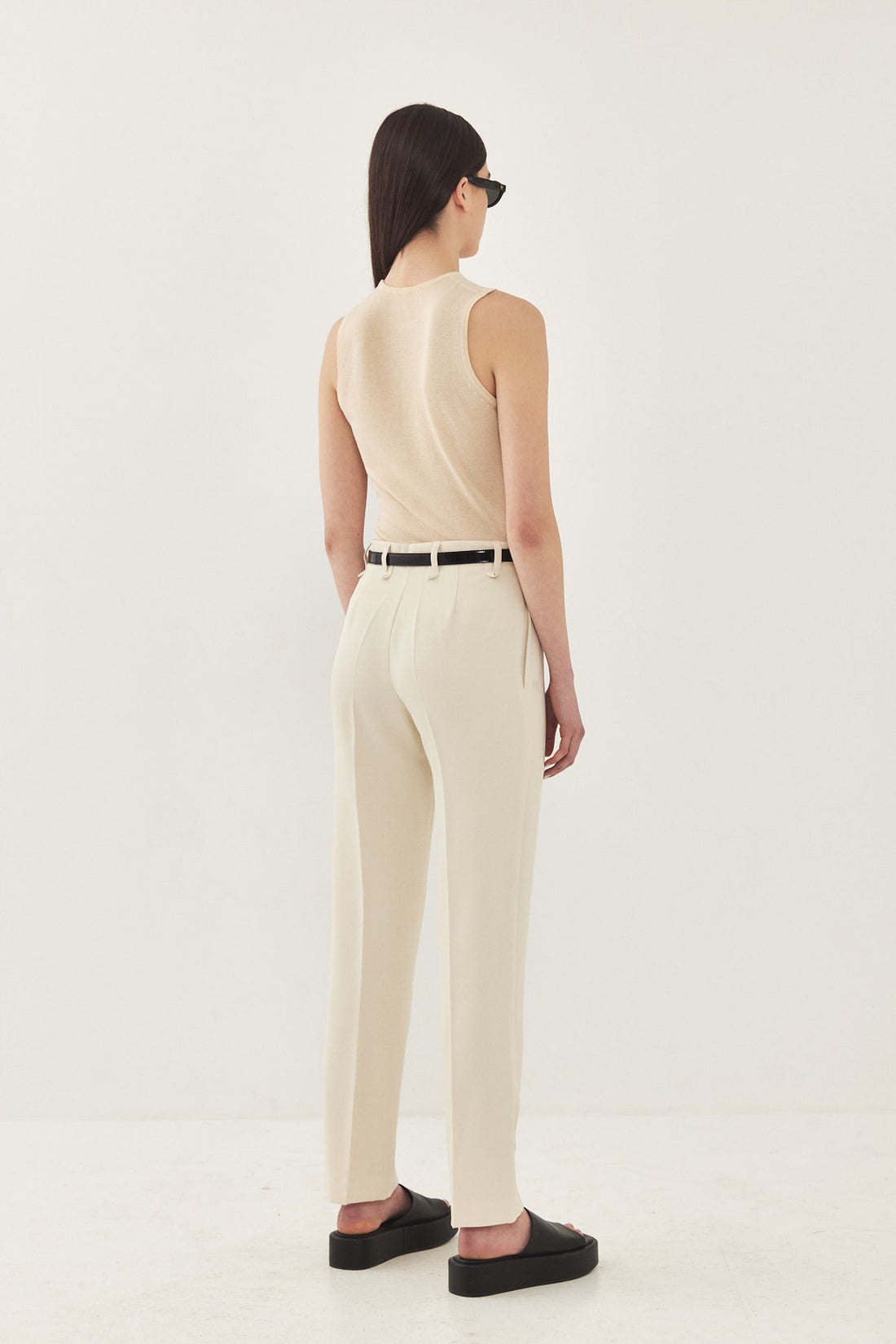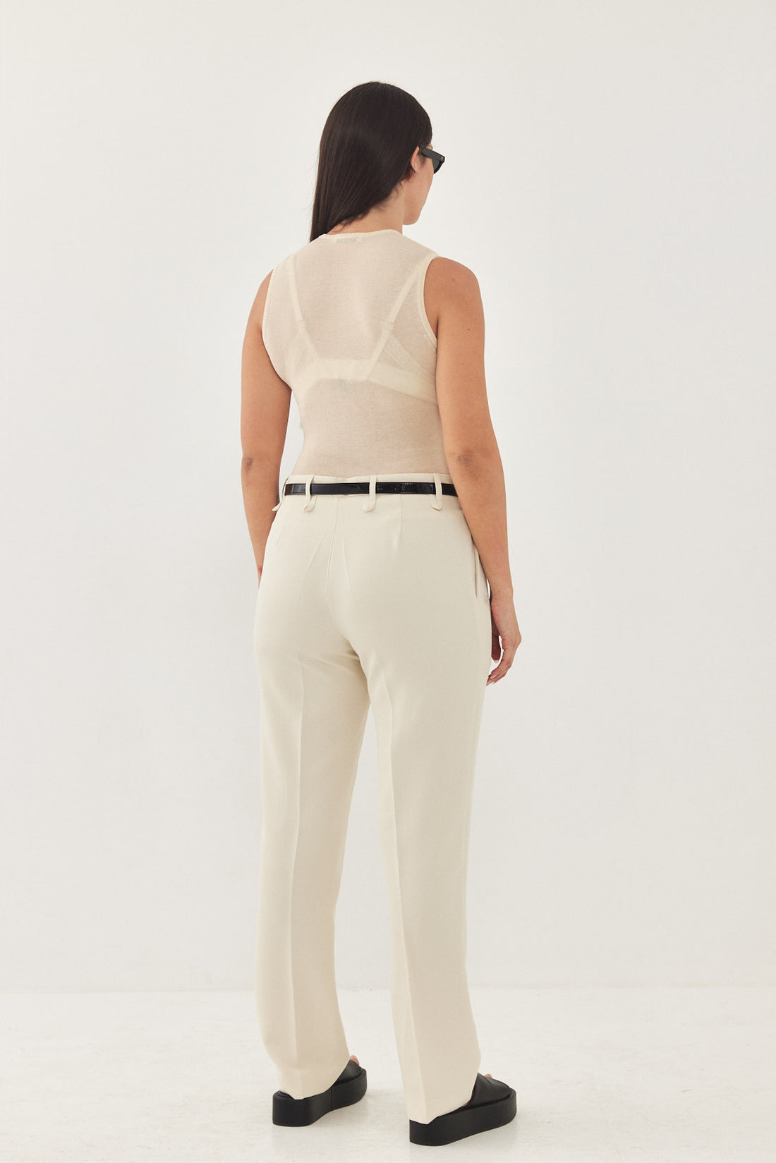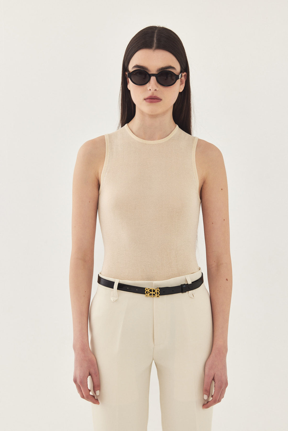 A semi sheer lightweight muscle T made from a soft and thin knitted fabric. Features a crew neckline and a close fit. Style it with a pair of our tailored daddy pants in bone for the perfect holiday look.