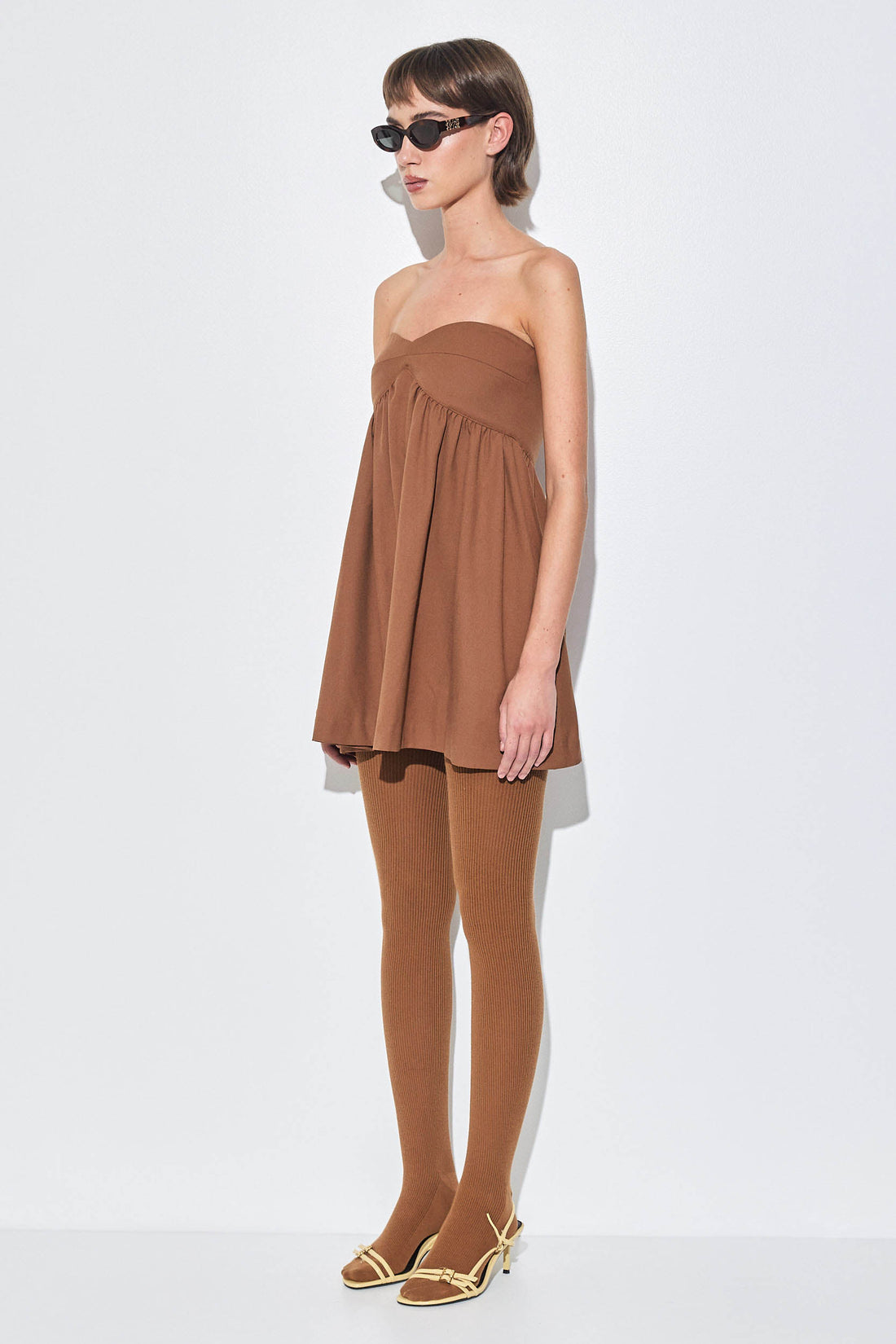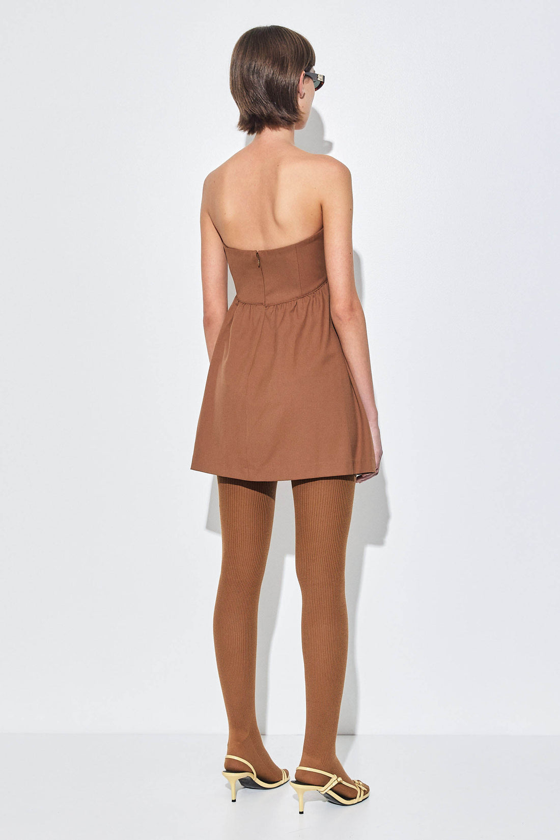 The newest addition to our signature daddy collection in a new luxurious tailored fabric. A tailored corset strapless mini dress. Side zipper. Lined bodice. Internal silicone grip for extra support. Two side pockets. Fitted at the bust, loose at the waist for extra volume. Tonal logo embroidery detailing on the pocket. Style it with sheer tights, knee high boots and our oval sunglasses to seal this gorgeous look.