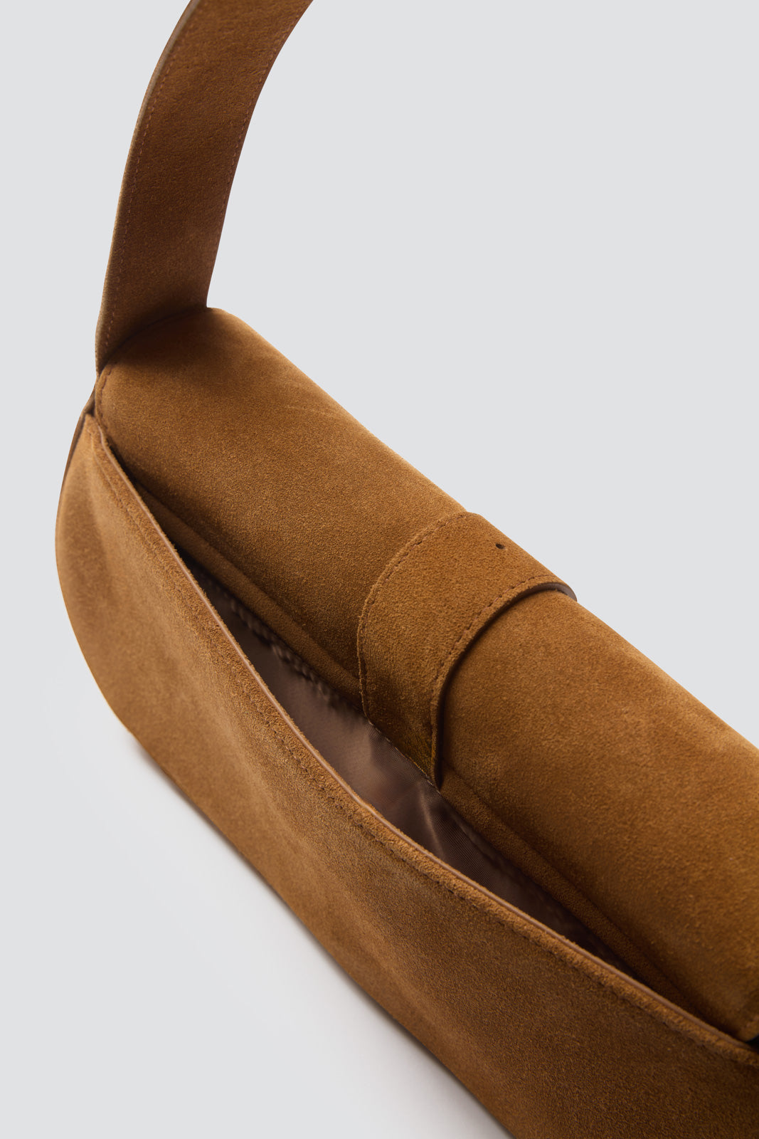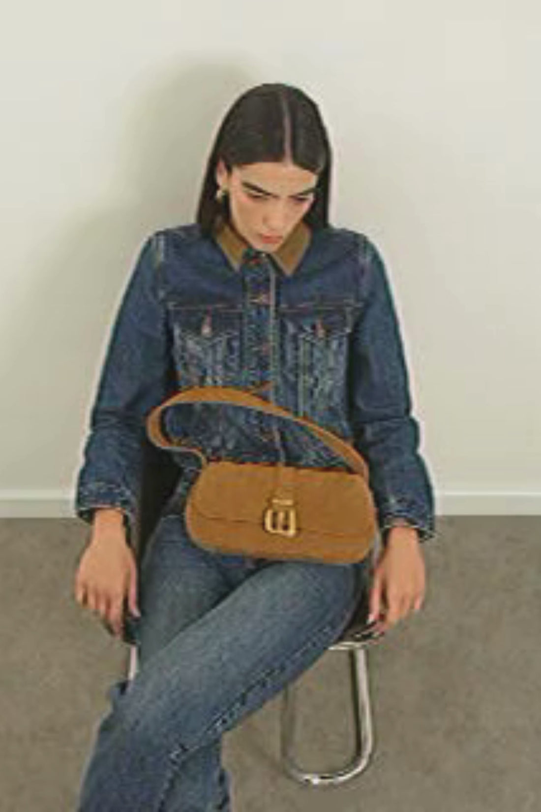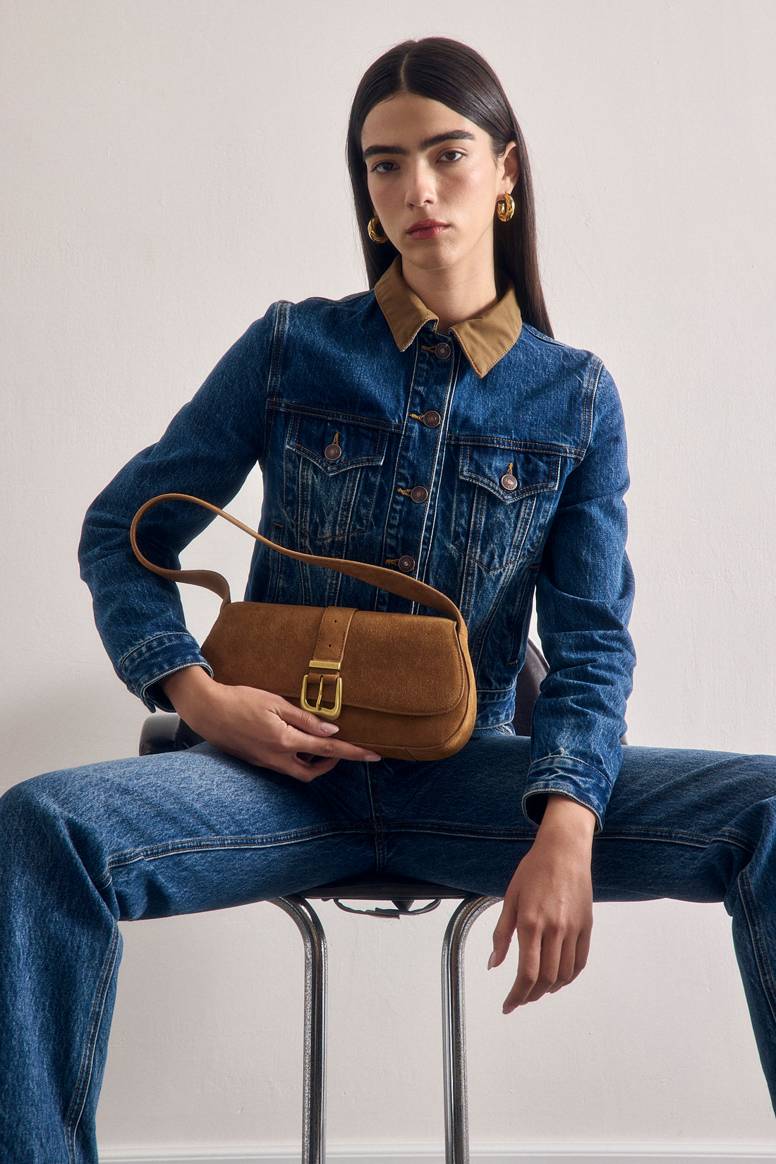 Crafted with love from the finest genuine leather, the Yvon shoulder bag draws inspiration from Romy's grandmother’s most treasured vintage collection. Its buckle detailing, borrowed from her favorite leather belt, blends nostalgic charm with refined craftsmanship. Structured baguette silhouette. Made from soft, rich suede leather. Front flap with decorative gold buckle detailing. Magnetic snap closure for easy access. Interior zip pocket and slip pocket for essentials. Branded leather patch and zipper pull. Fully lined interior. Back slip pocket for added functionality. Includes a branded dust bag for safe storage and protection. It's more than just a bag, our new Yvon is a timeless piece designed to carry your most prized possessions. Meant to be cherished, it’s made to be worn with love—for a lifetime.