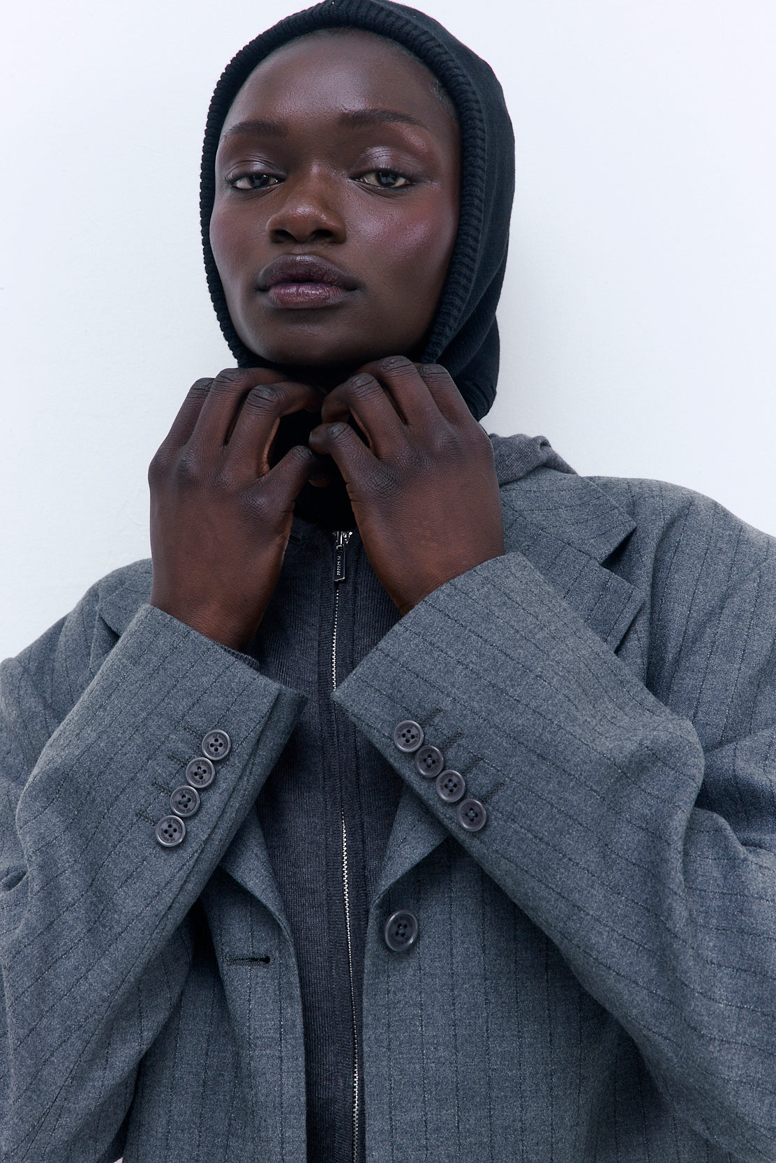 Stay sleek, stay warm; the ultimate cool-girl accessory for the coming winter. Fitted balaclava finished with a ribbed hem. Detailed with a tonal silicon logo at the back. Style it with our iconic Classic Oversized Daddy Blazer and finish the loof off with our timeless Jackie Sunglasses for a refined, casual look.