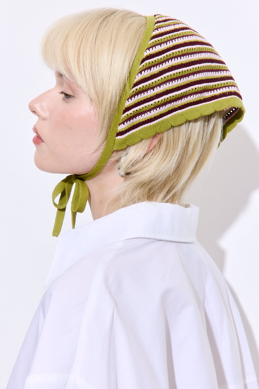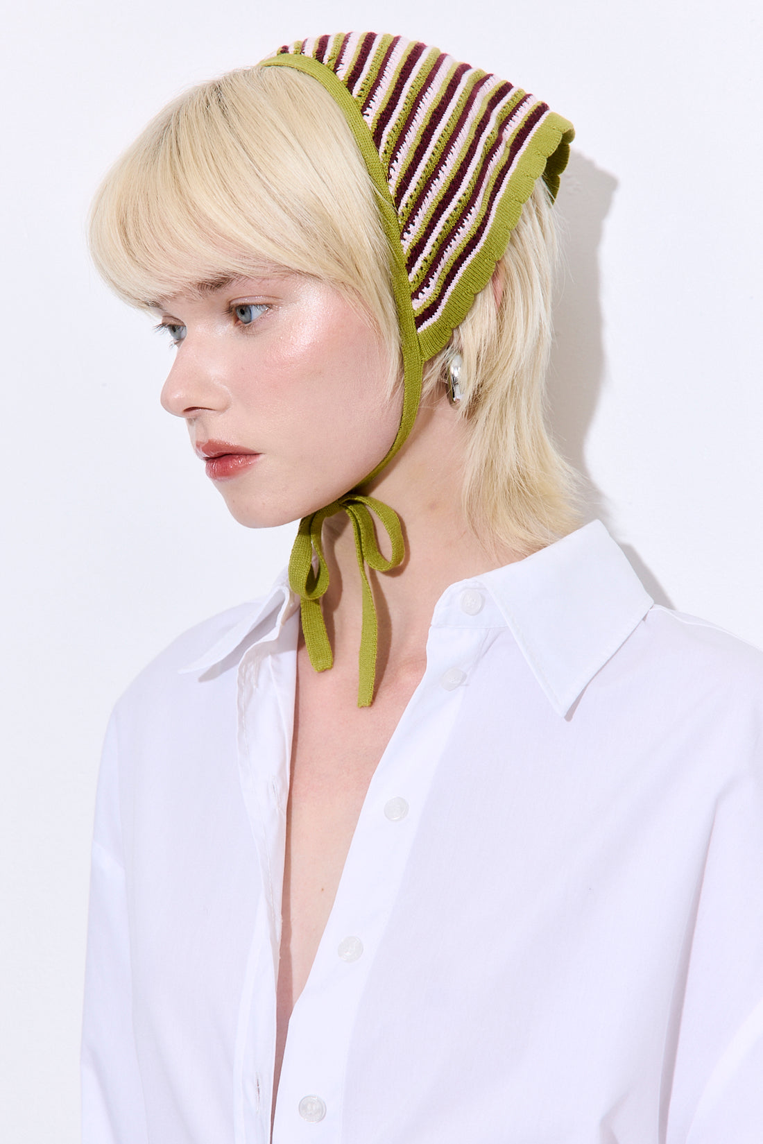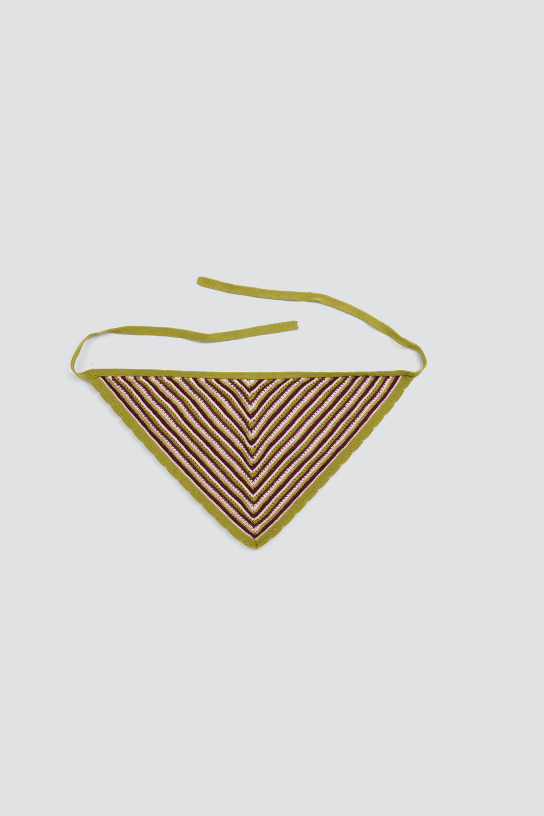Our most exciting crochet piece ever made. Triangular shape bandana. Ribbed tie straps for adjustable fit. Soft, lightweight knit fabric. Slightly sheer texture. Versatile styling as headscarf or accessory. Style it with our mini crochet tank dress and our beautiful oval sunglasses for the classiest summer look.