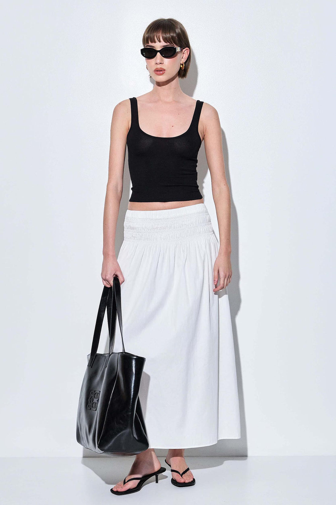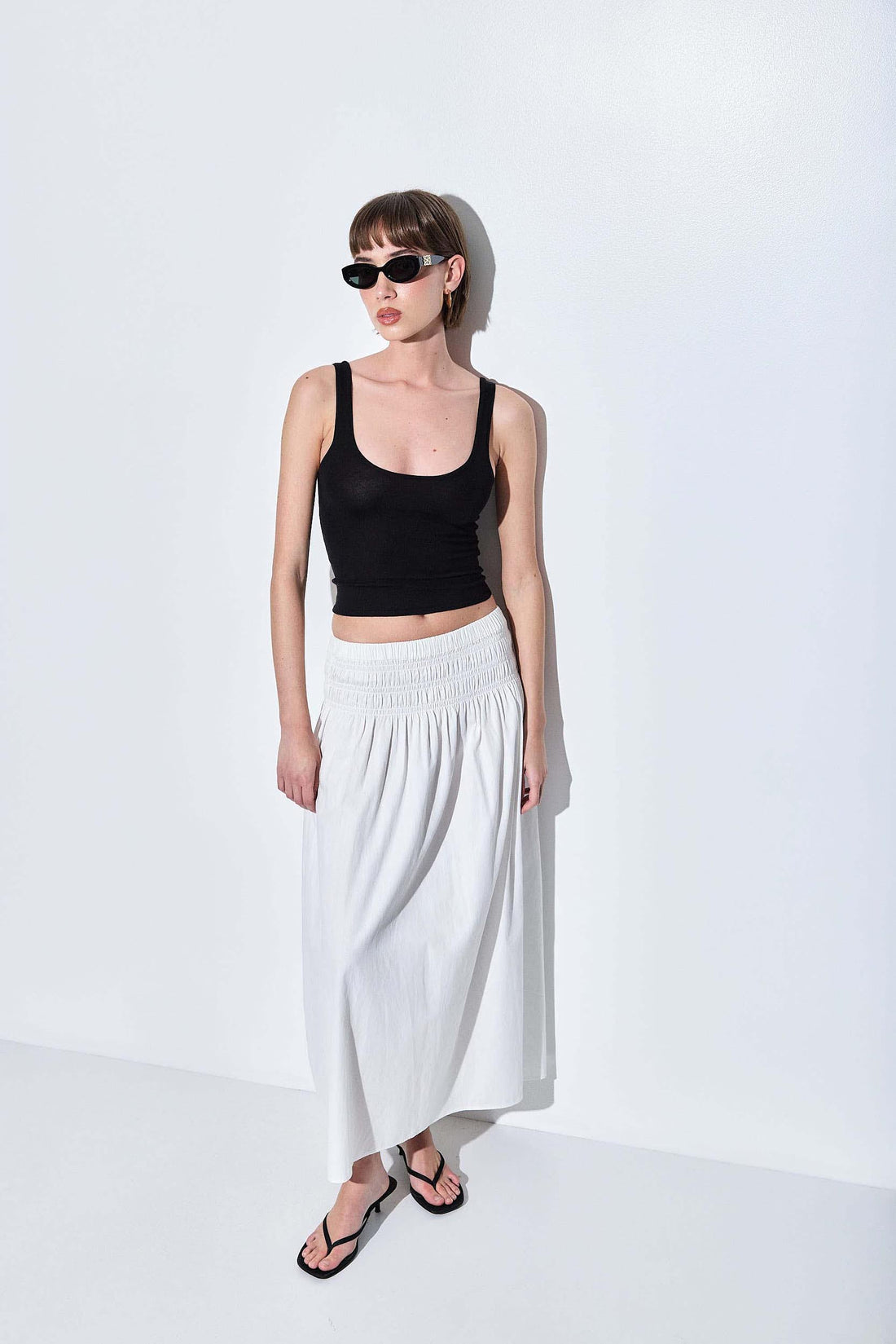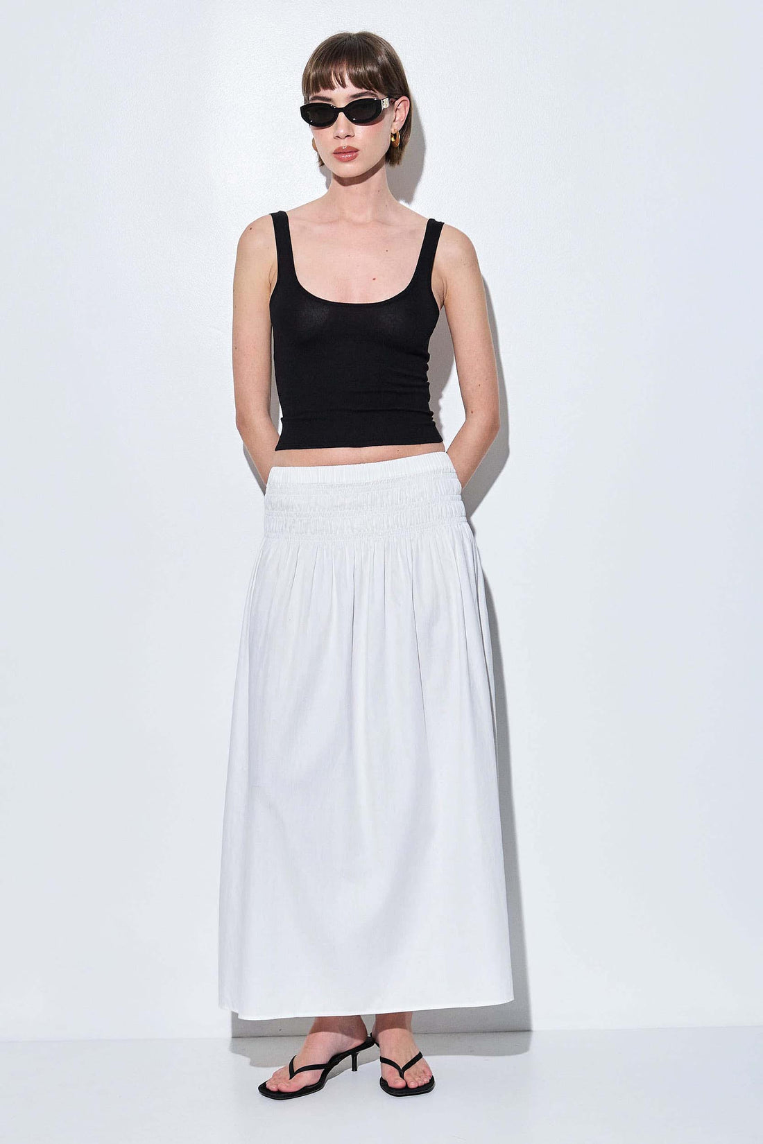 Our new knitted tank top is the perfect pick for this season. Features a scoop neckline and wide straps. Crafted from a soft, breathable knit fabric with a close-to-body fit for a sleek silhouette. Fully fashioned. Thin ribbed finish. Style it with our new buckle maxi skirt for a stylish set look, for any occasion.