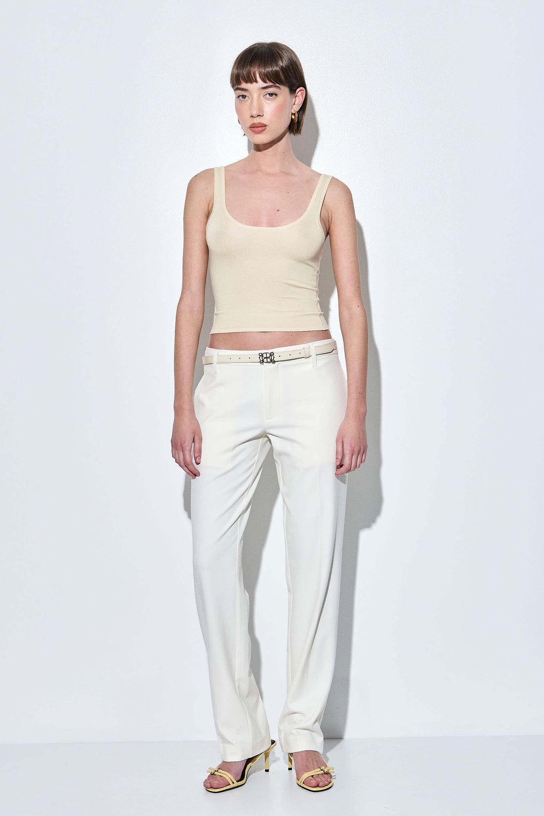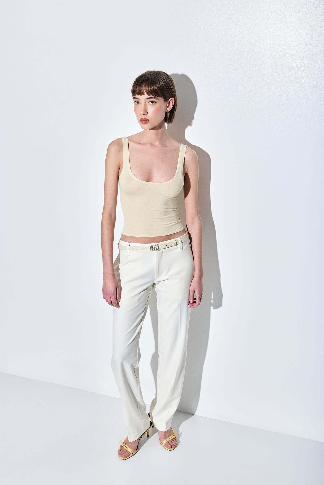 Our new knitted tank top is the perfect pick for this season. Features a scoop neckline and wide straps. Crafted from a soft, breathable knit fabric with a close-to-body fit for a sleek silhouette. Fully fashioned. Thin ribbed finish. Style it with our new buckle maxi skirt for a stylish set look, for any occasion.