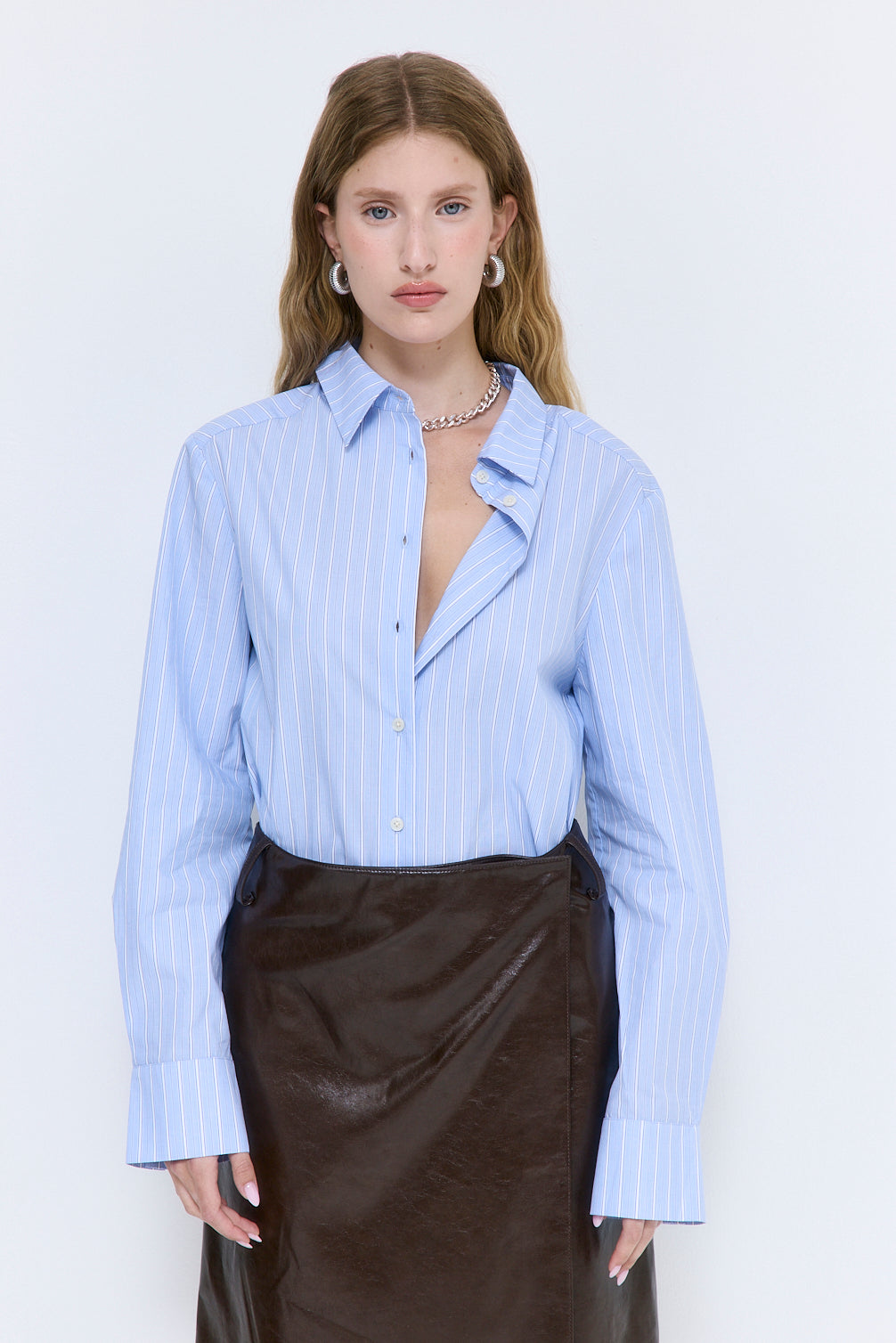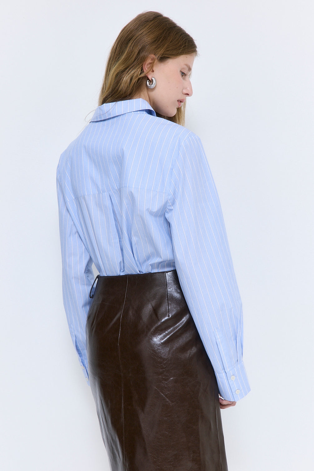 Our new Fitted Poplin Button Down is the perfect transition piece from summer to fall, from day to night. A lightweight addition crafted from crispy poplin fabric. Long sleeve with frontal engraved logo button closure. Wide cuffs with pleat detailing for extra volume, featuring two buttons. Back pleat and yoke. Rounded hem. Classic collared neckline. Dropped down shoulders. Contrasting logo embroidery detailing on the cuff. Style it with our white mid rise poplin pants and our chic round sunglasses for an effortless yet elevated look.