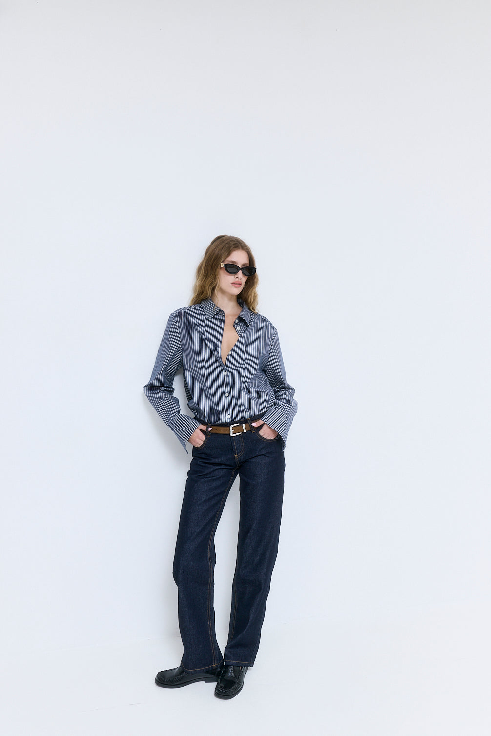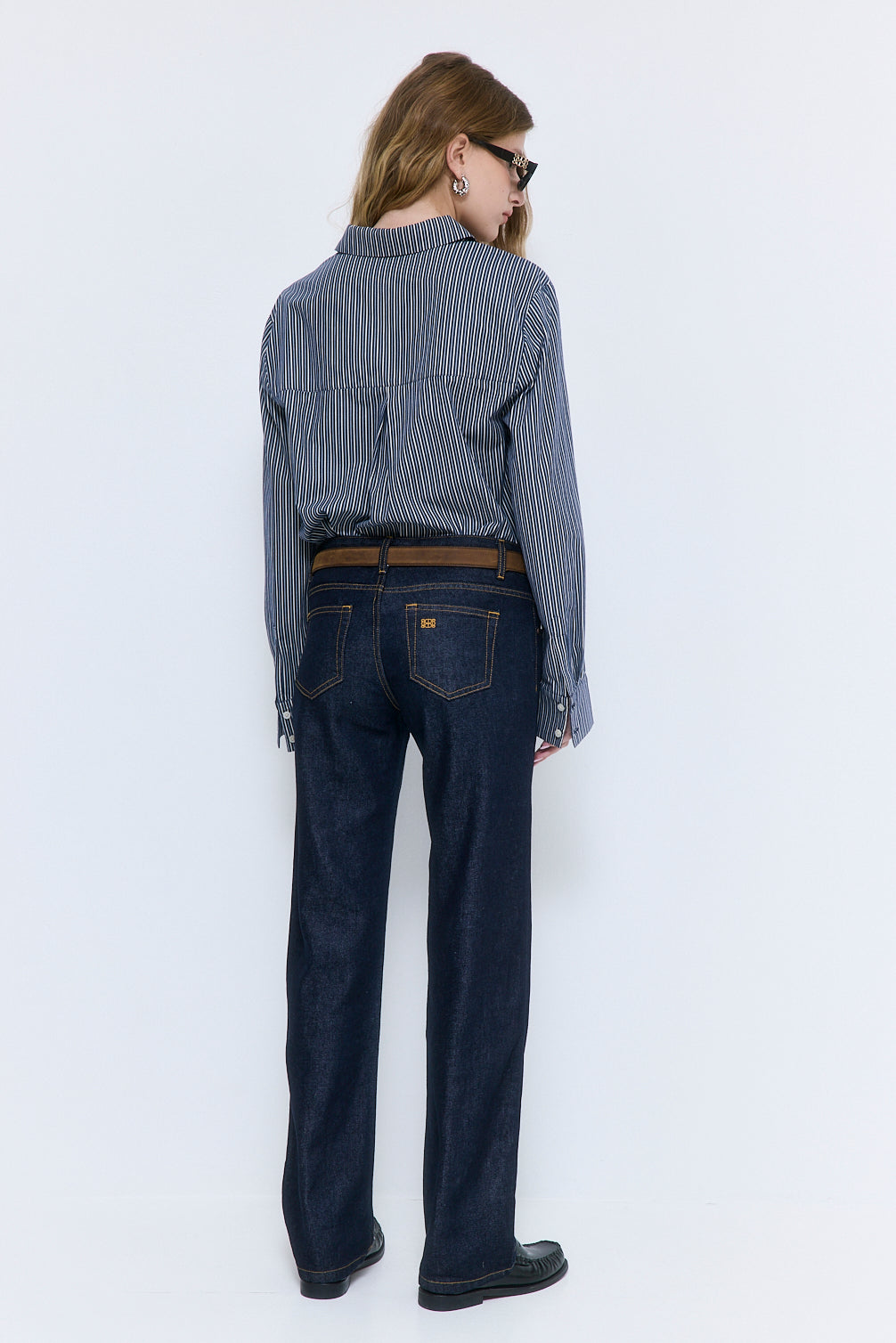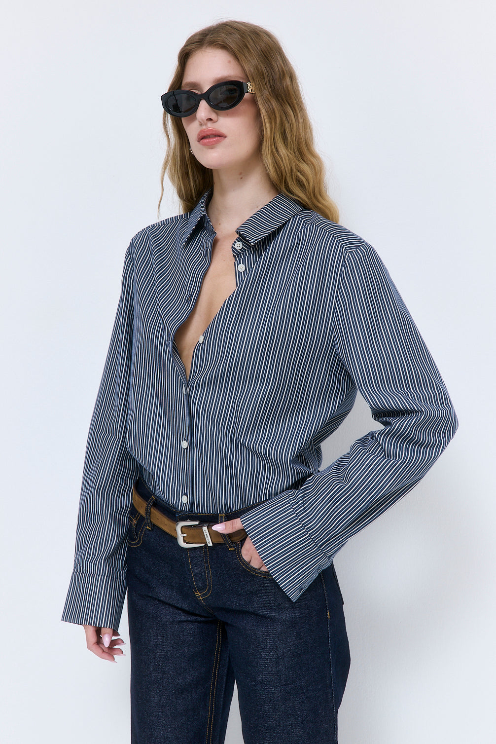 Our new Fitted Poplin Button Down is the perfect transition piece from summer to fall, from day to night. A lightweight addition crafted from luscious poplin fabric. Long sleeve with frontal engraved logo button closure. Wide cuffs with pleat detailing for extra volume, featuring two buttons. Back pleat and yoke. Rounded hem. Classic collared neckline. Dropped down shoulders. Tonal logo embroidery detailing on the cuff. Style it with our white mid rise poplin pants and our chic round sunglasses for an effortless yet elevated look.