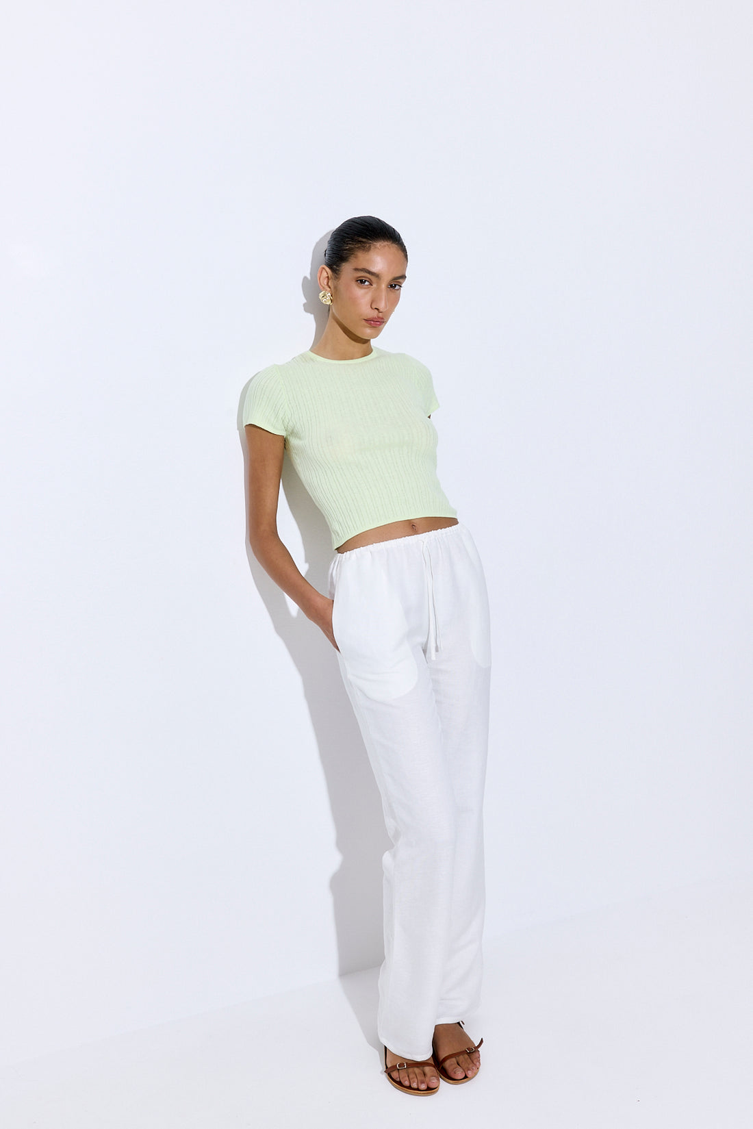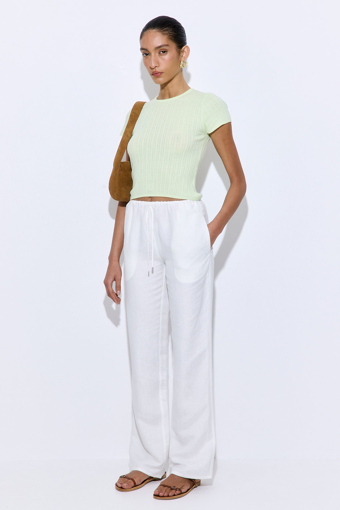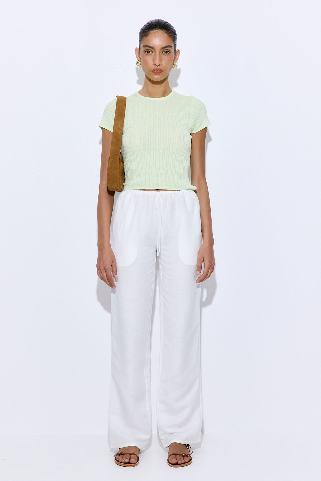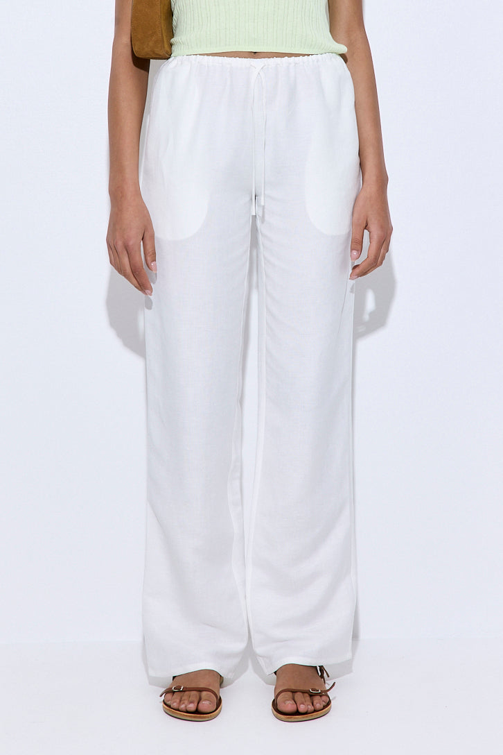 The go-to pants for laid-back days and polished moments. Crafted from breathable, lightweight linen with a soft, natural drape. Features a mid-rise fit with an adjustable linen drawstring and clean, minimal finish. Designed for comfort without compromising style. Style it with our new linen camisole, a pair of our oval sunglasses and close this look with a matching scrunchie.